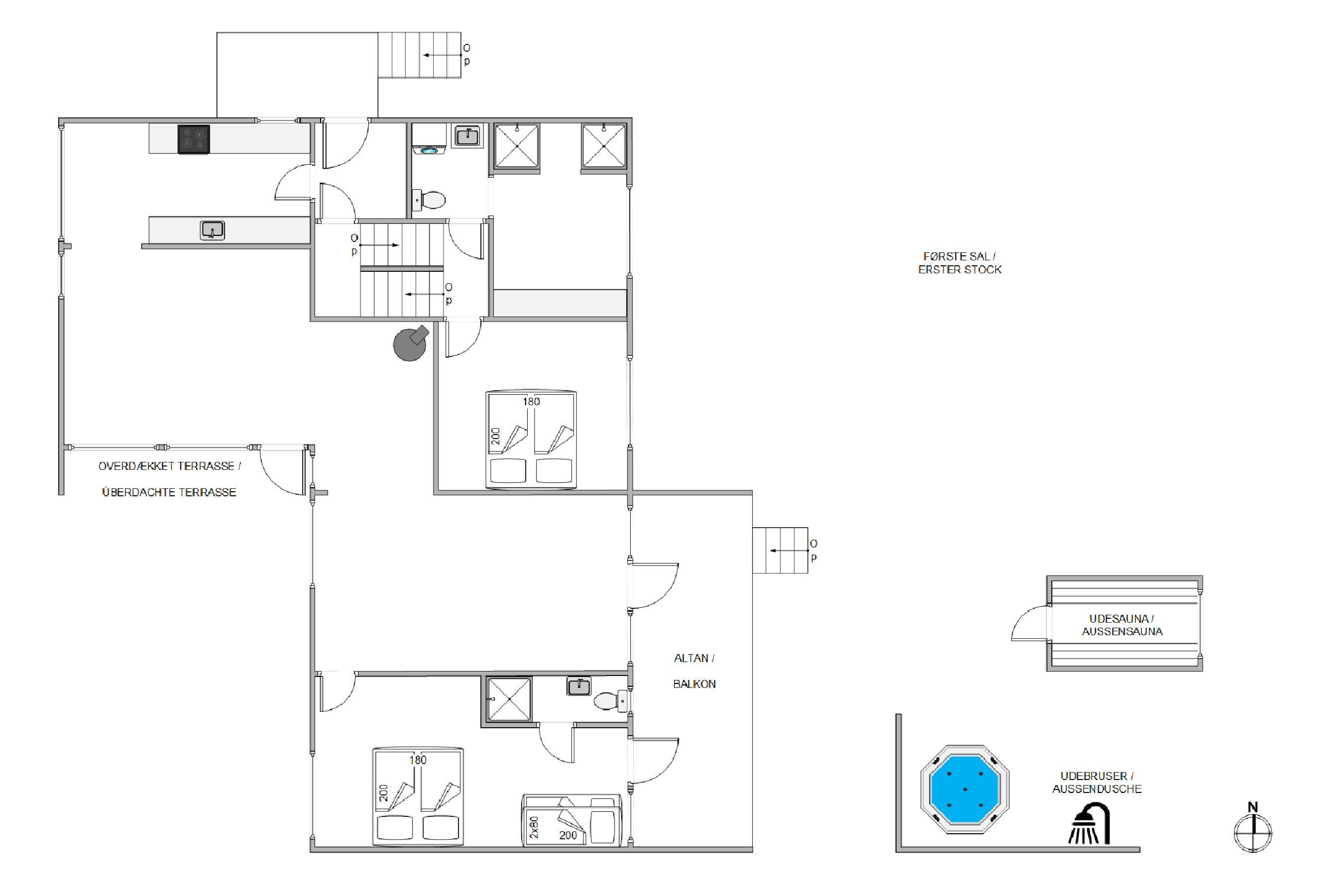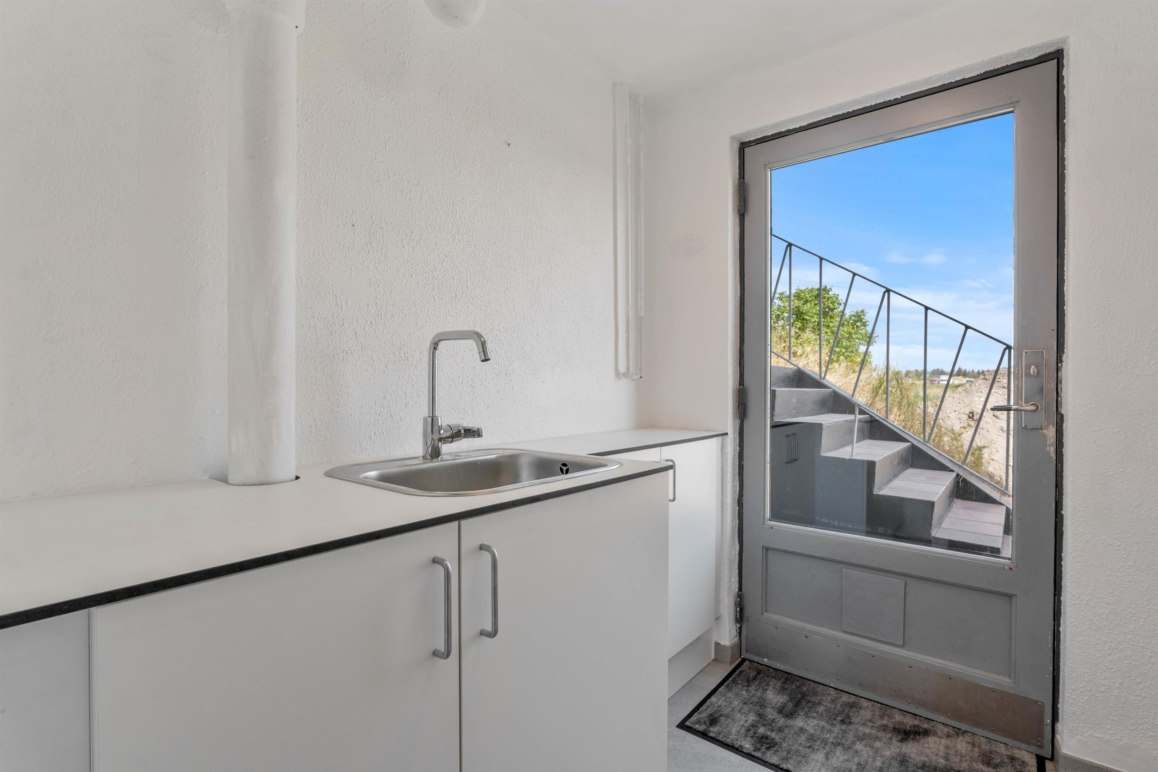 Udeområdet byder på en skøn udespa, hvor I kan læne jer godt tilbage og slappe helt af i det dejlige vand under åben himmel. Derudover er der også en udesauna på udeområdet, hvor I kan nyde endnu mere afslapning i varmen. Desuden har I en udebruser, som I kan skylle sandet af tæerne under efter en tur ved Vesterhavet. Udebruseren kun tilgængelig fra april til november.