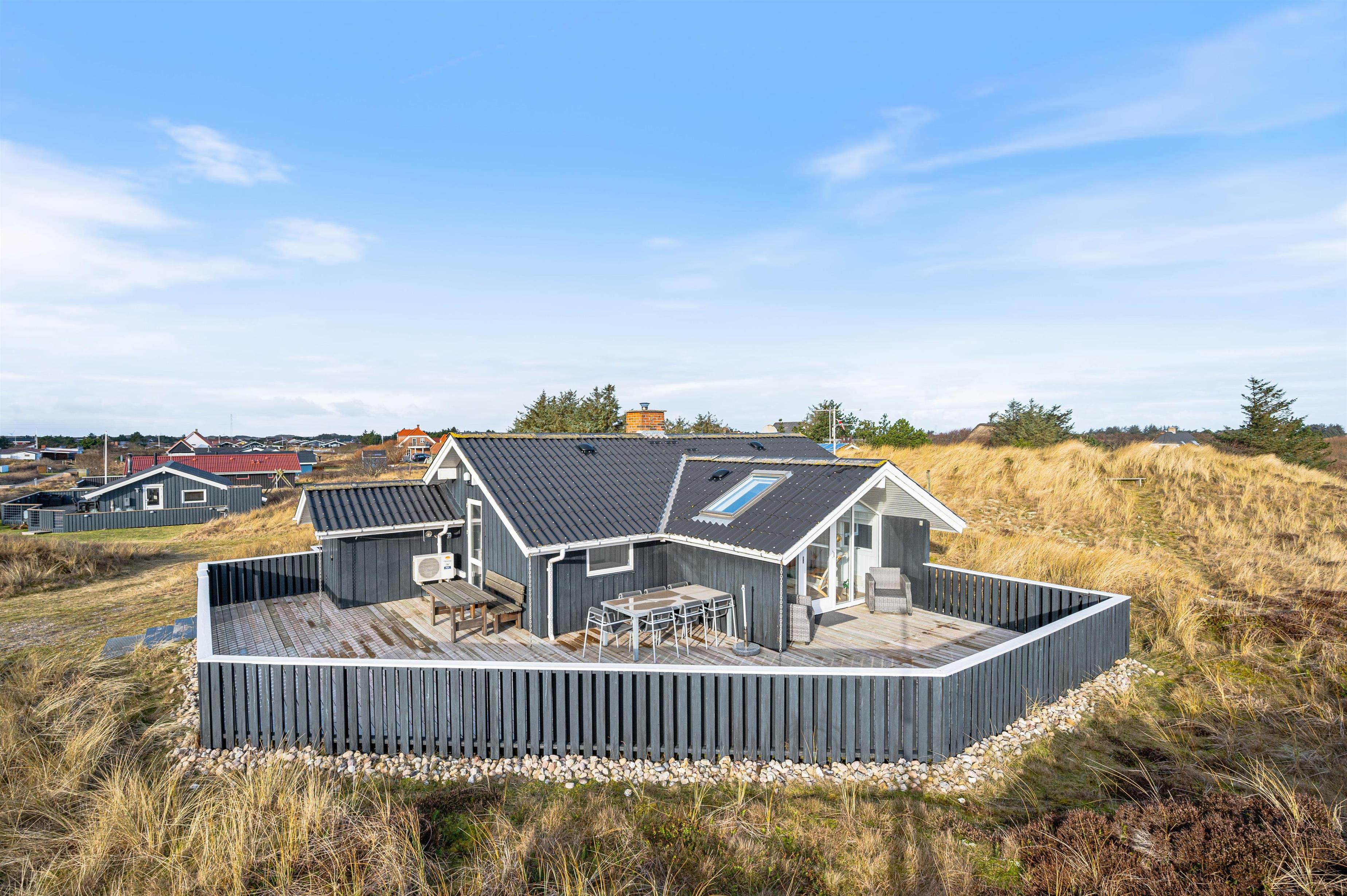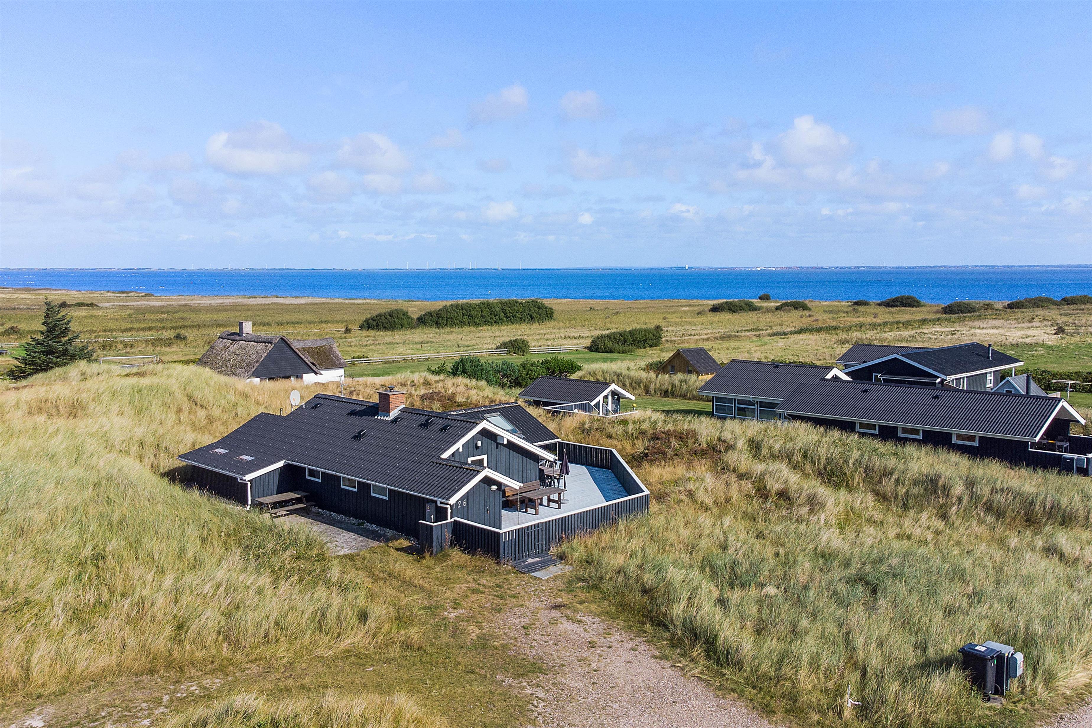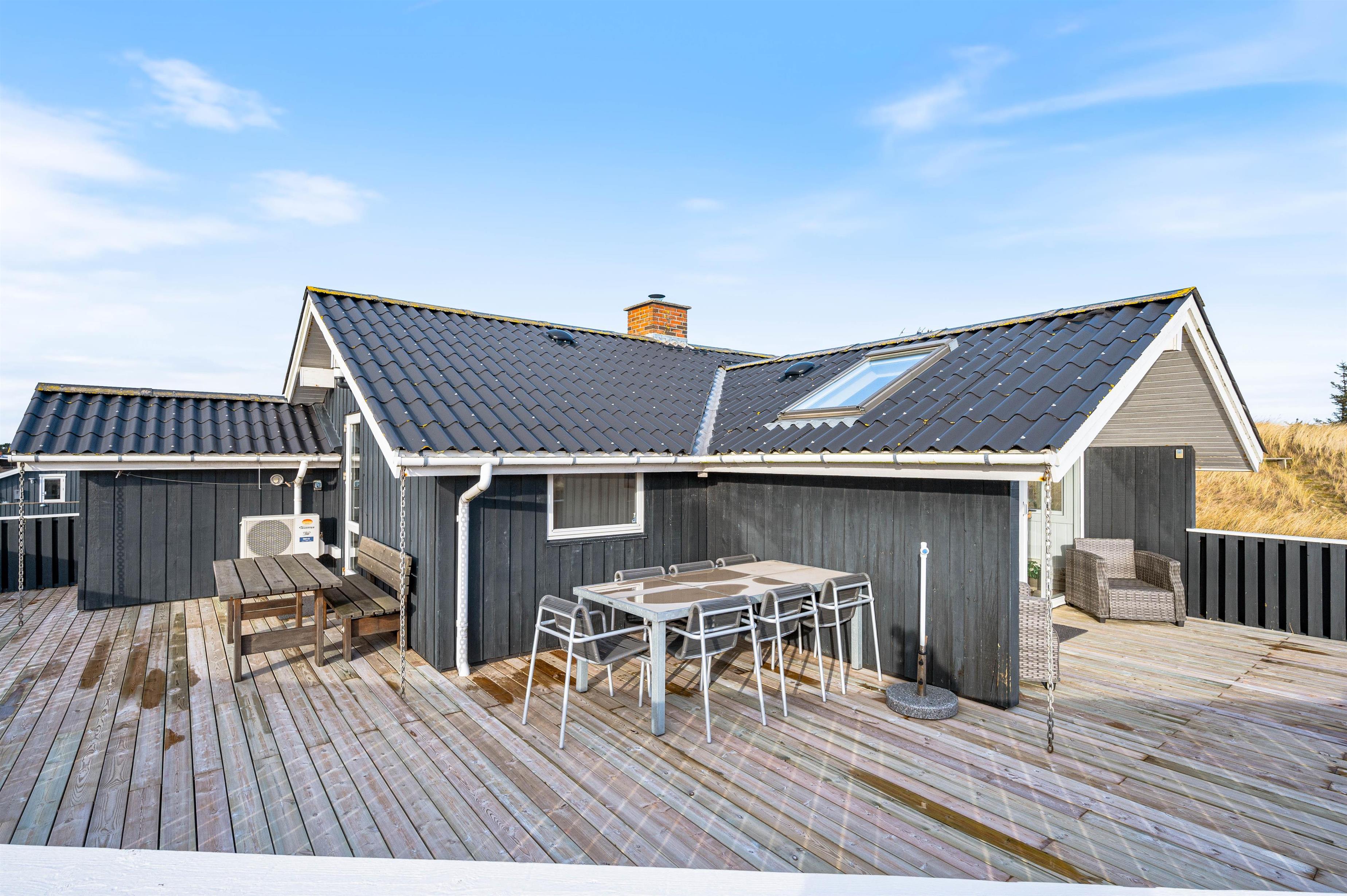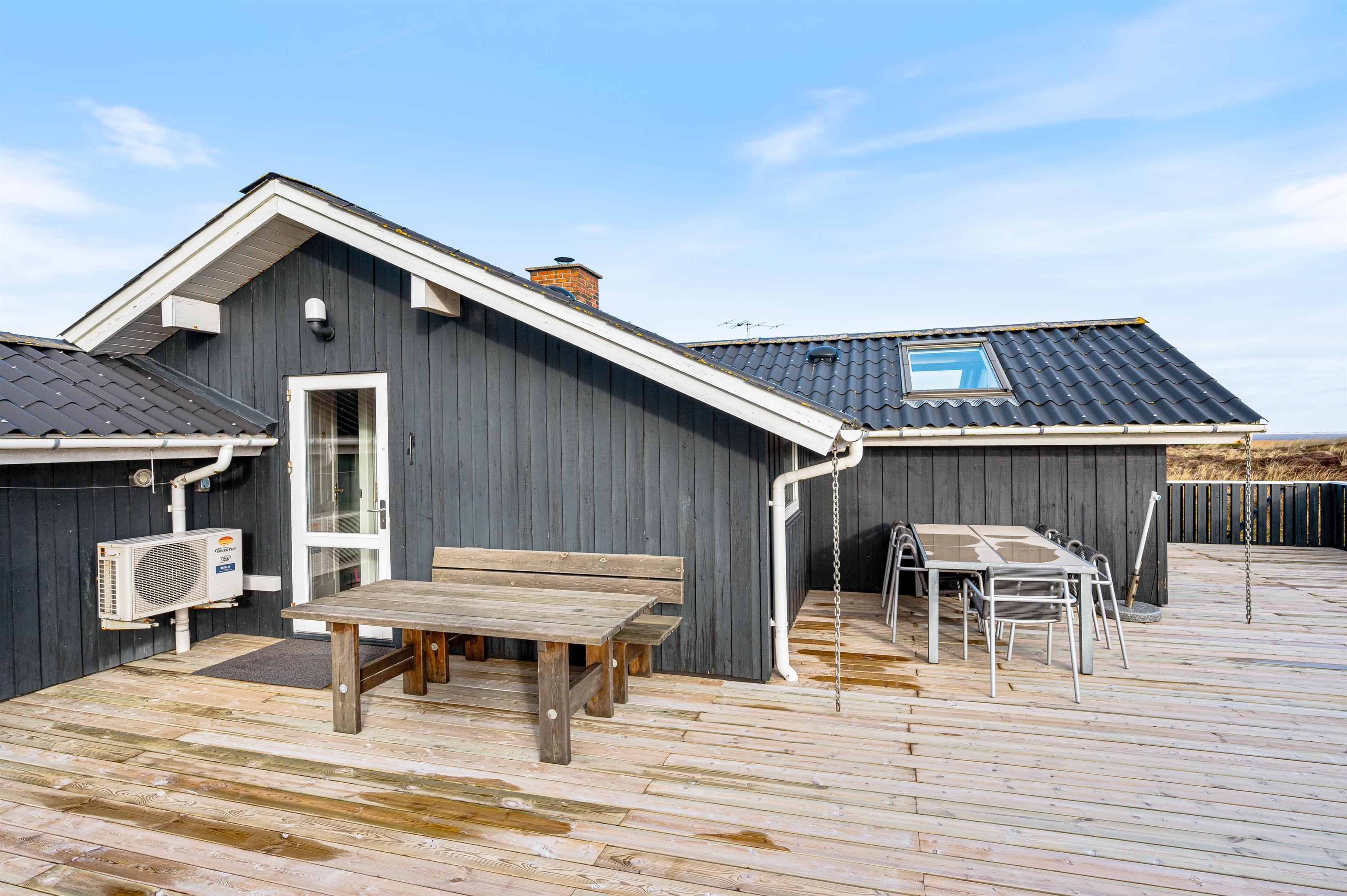 Feriehuset på Anker Eskildsvej 126 byder på en delvis overdækket og lukket terrasse. På solrige dage kan I sidde i havemøblerne og nyde en kop kaffe eller kølig drink, mens I nyder den vestjyske natur og udsigten ud over fjorden.