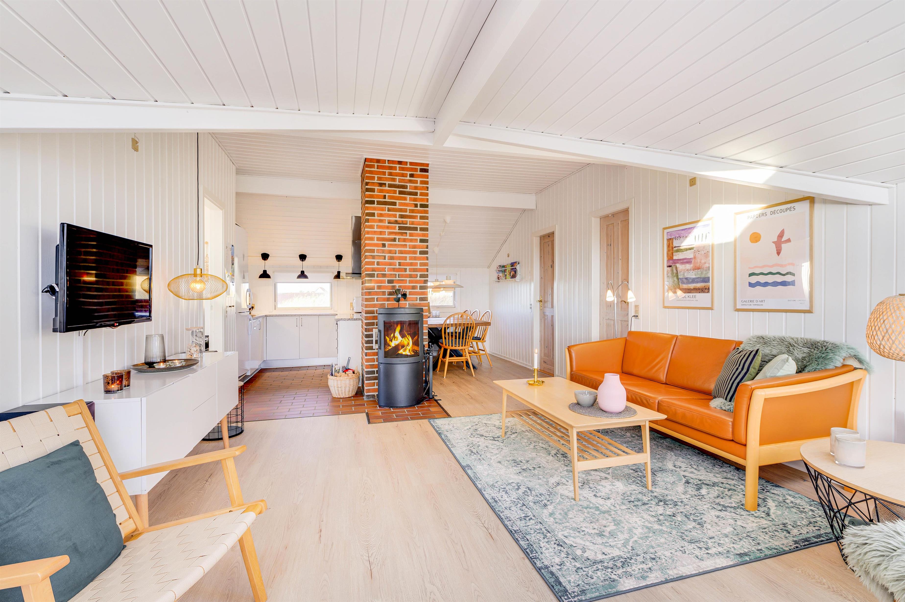 Feriehuset tilbyder en hyggelig og komfortabel indretning med lysvenlige omgivelser. Stue og spisestue er integreret og går op til kip, og køkkenet er udstyret med alt det nødvendige, I har brug for på en afslappende ferie.