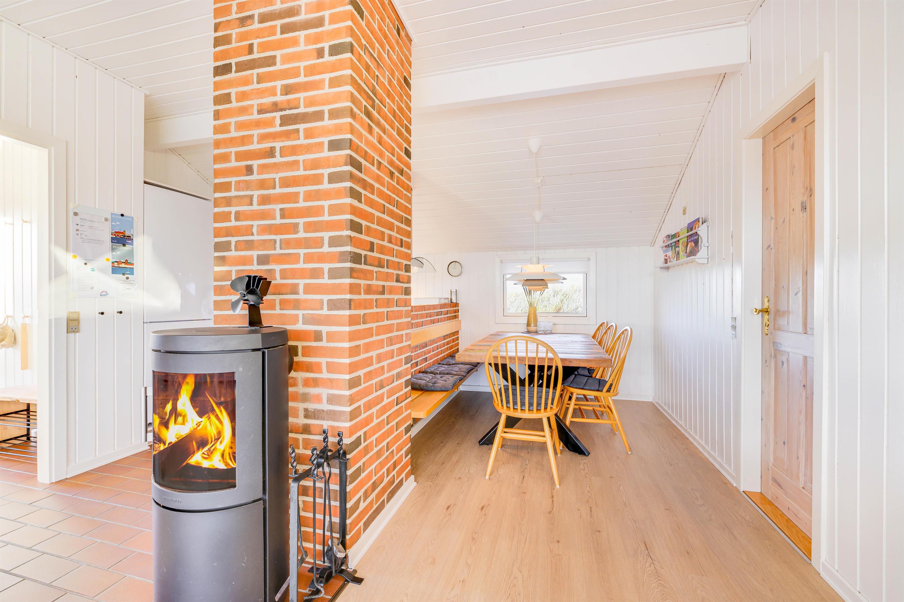 Efter en dejlig dag i den friske vestjyske luft, og efter I har tilberedt et dejligt måltid, kan I nyde aftenen på sofaen, mens opvaskemaskinen klarer opvasken. Der er desuden vaskemaskine i feriehuset samt en energisparende varmepumpe. Sammen med brændeovnen sørger varmepumpen for, at I ikke fryser om fødderne på køligere dage.