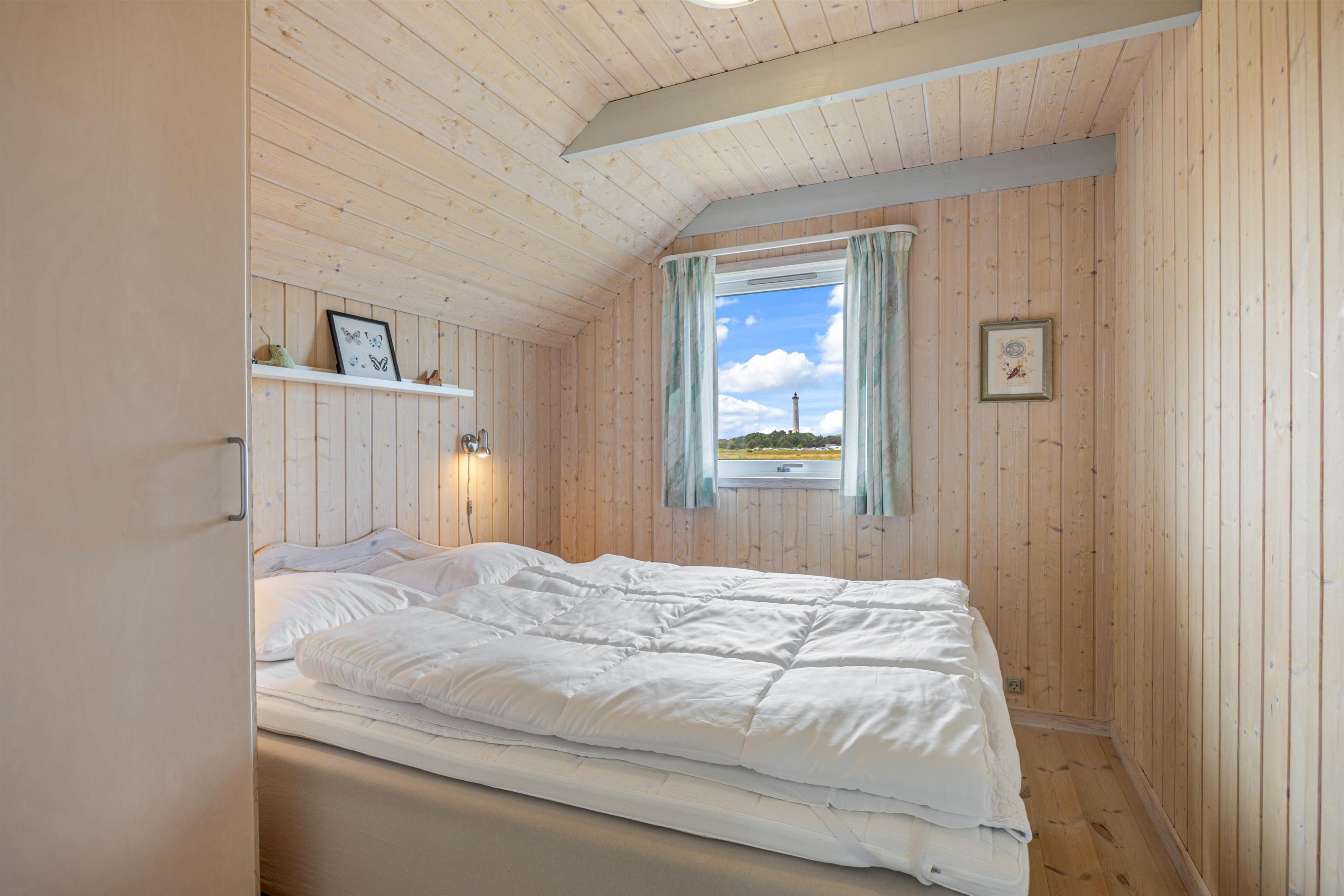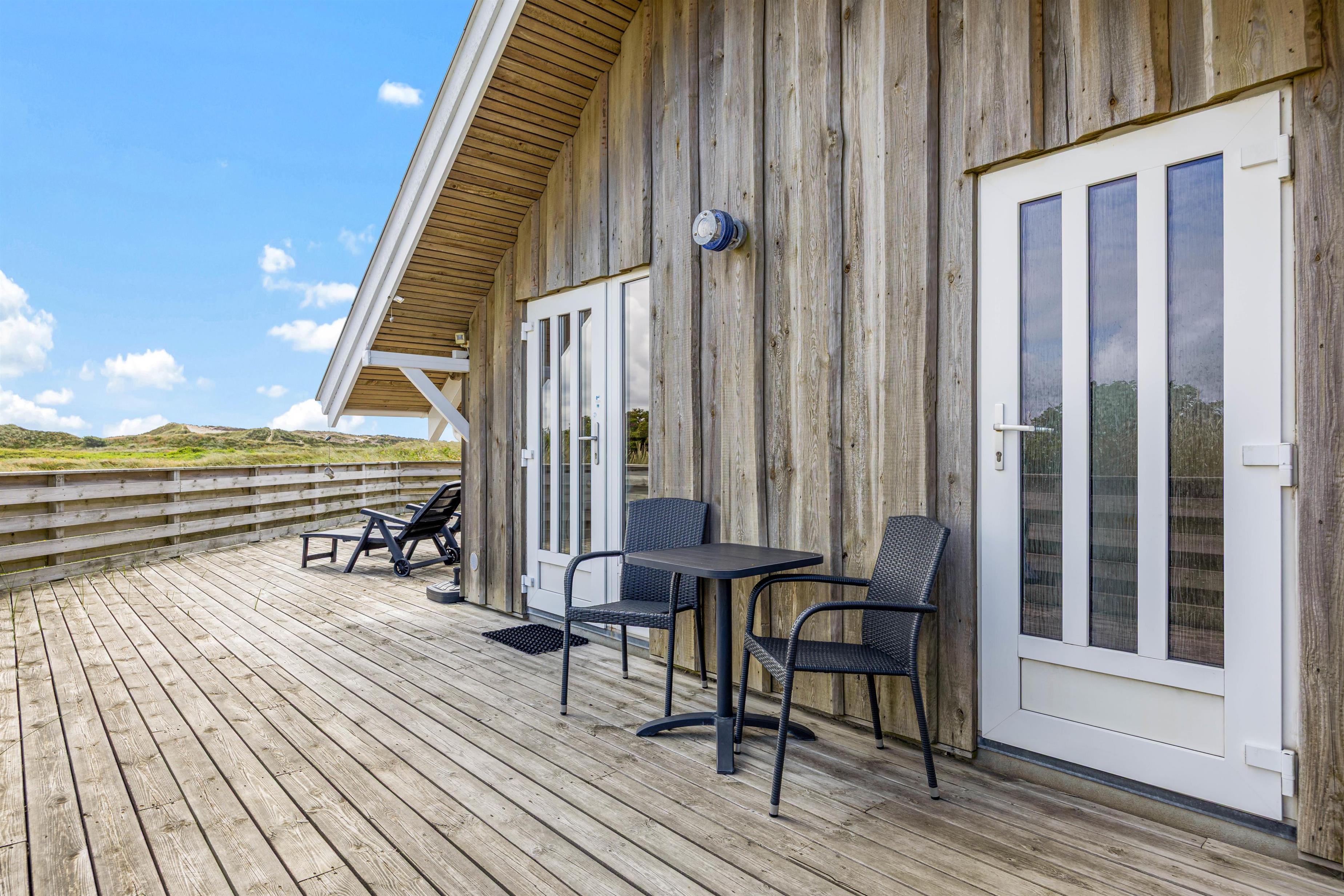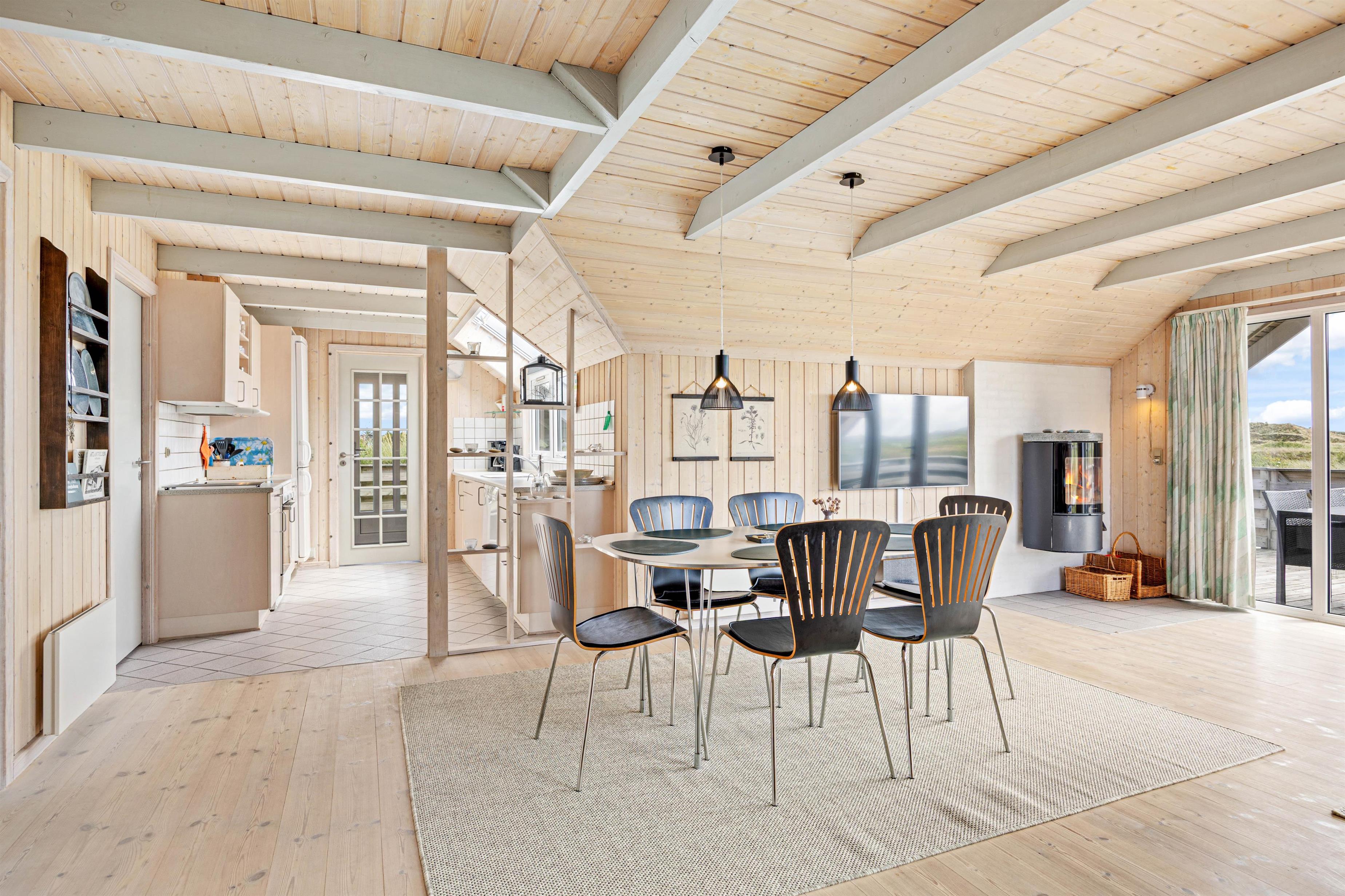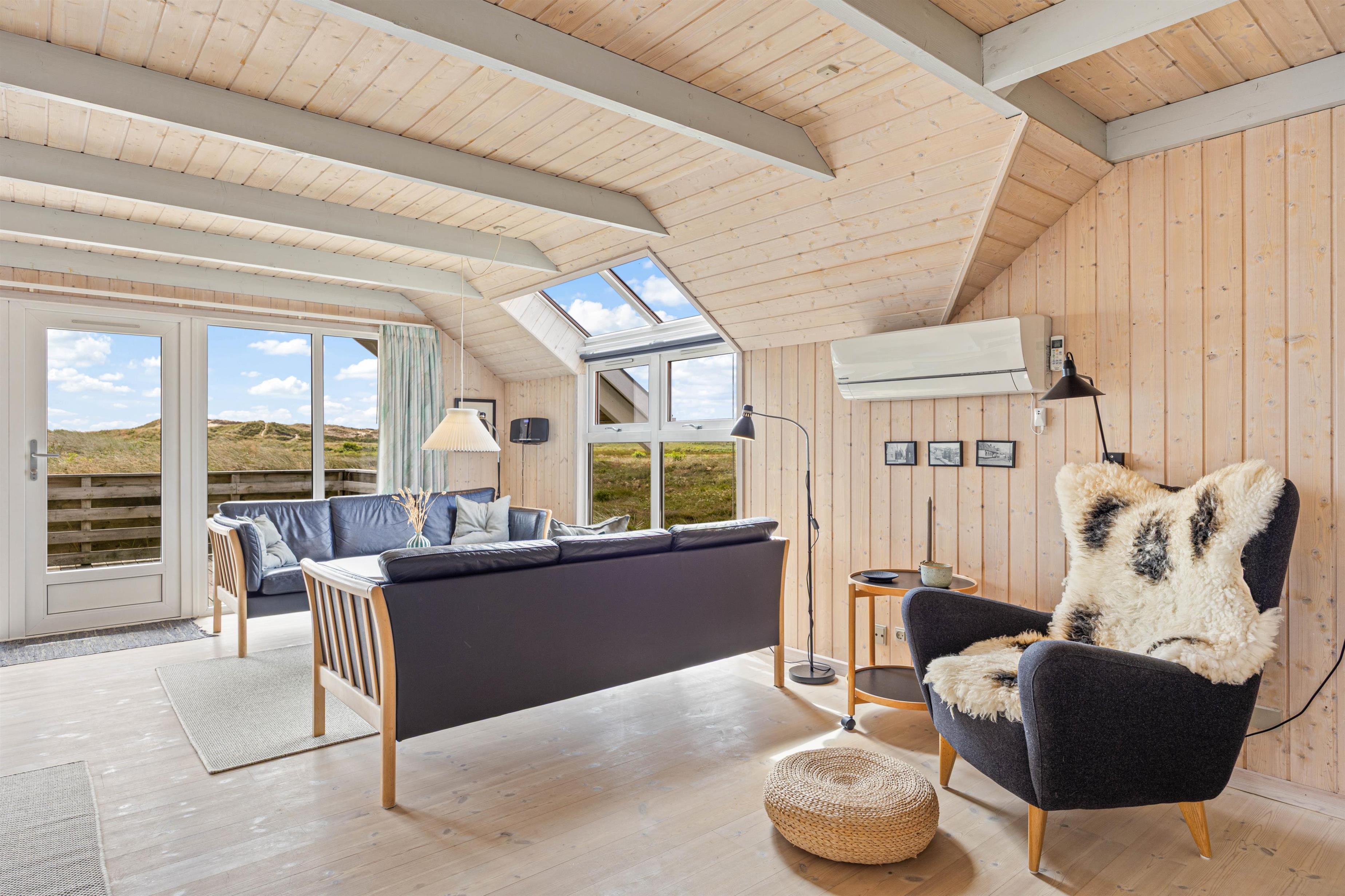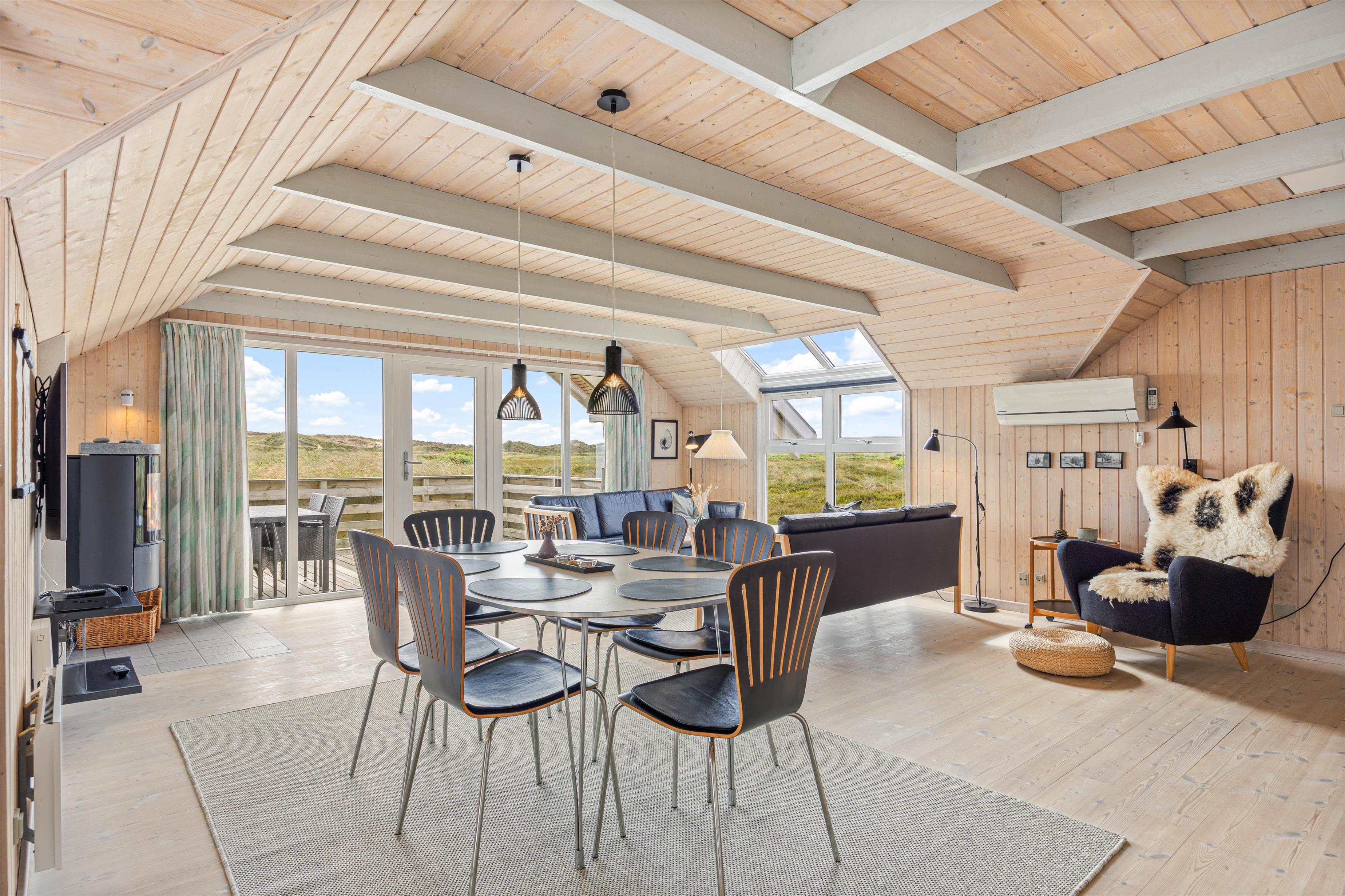 Det hyggelige sommerhus er flot og lyst indrettet med loft til kip og gode, gedigne møbler. Spise- og opholdsstue er husets hjerte. Her kan I samles om en lækker middag med en god flaske vin eller sidde i sofaen og nyde den fantastiske udsigt, der er til de fredede hede- og klitarealer ved Nr. Lyngvig fyr. Huset har desuden både spabad og sauna.