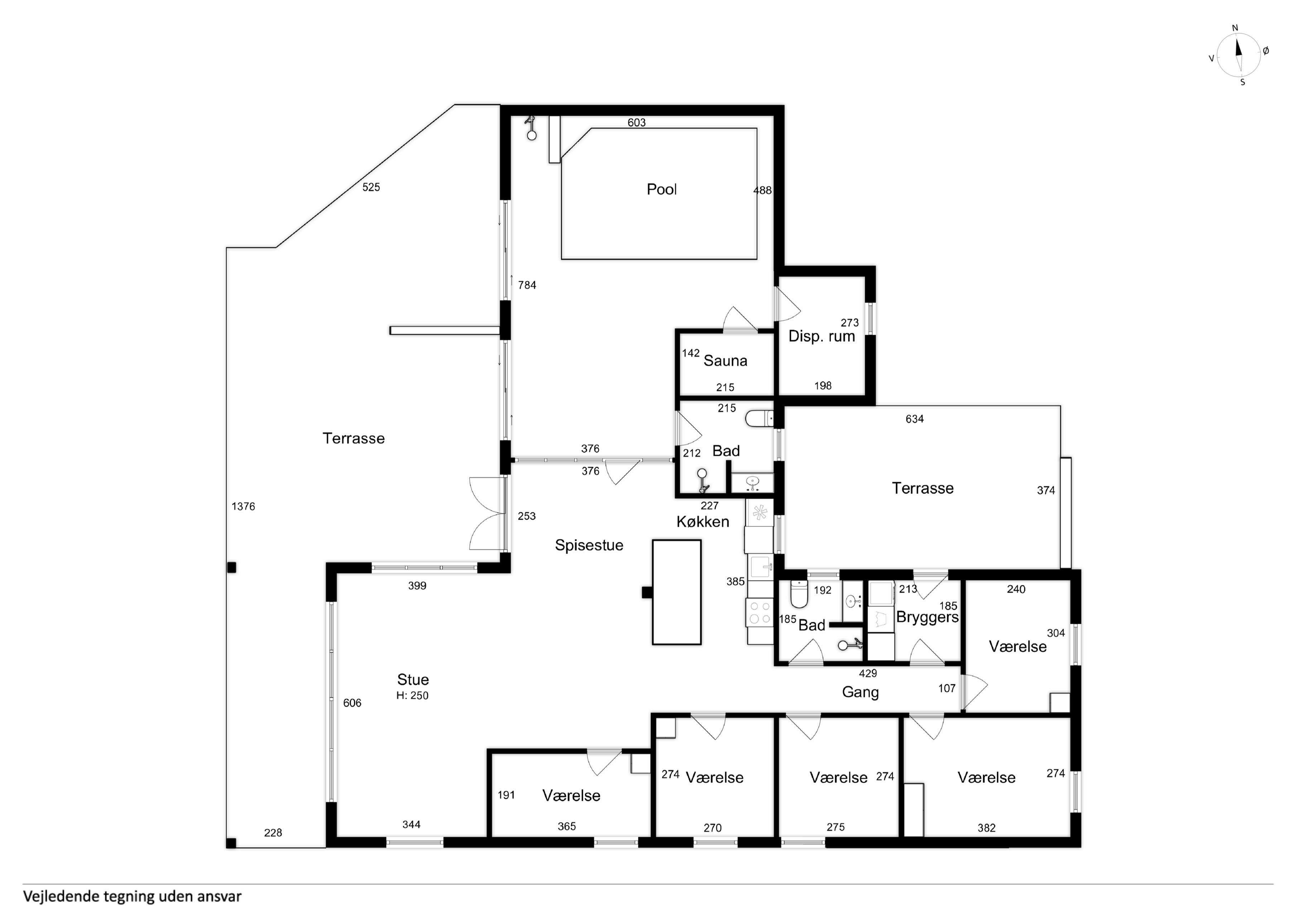 Sommerhuset er på 183 m² og har plads til 10 personer fordelt på 5 soveværelser: