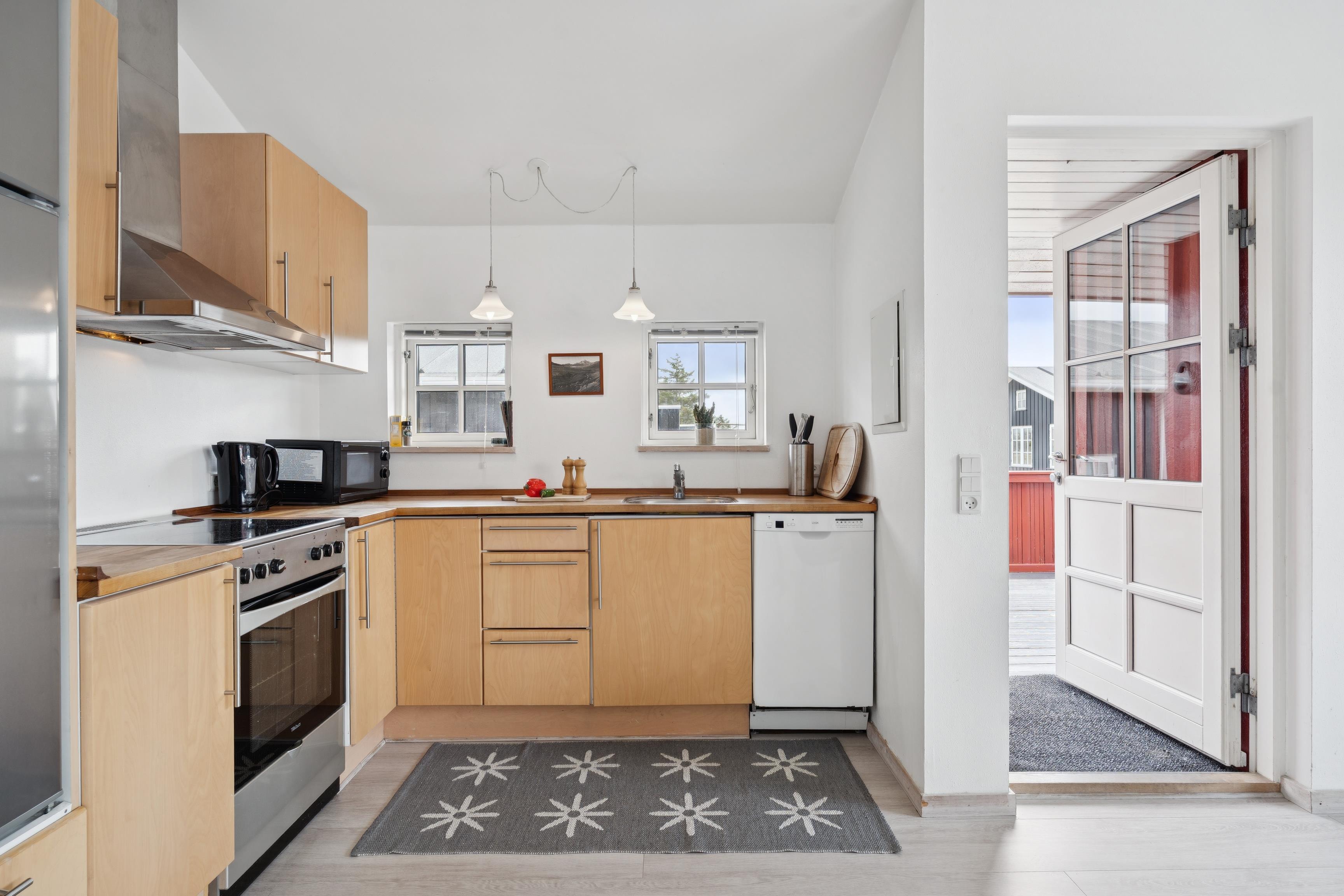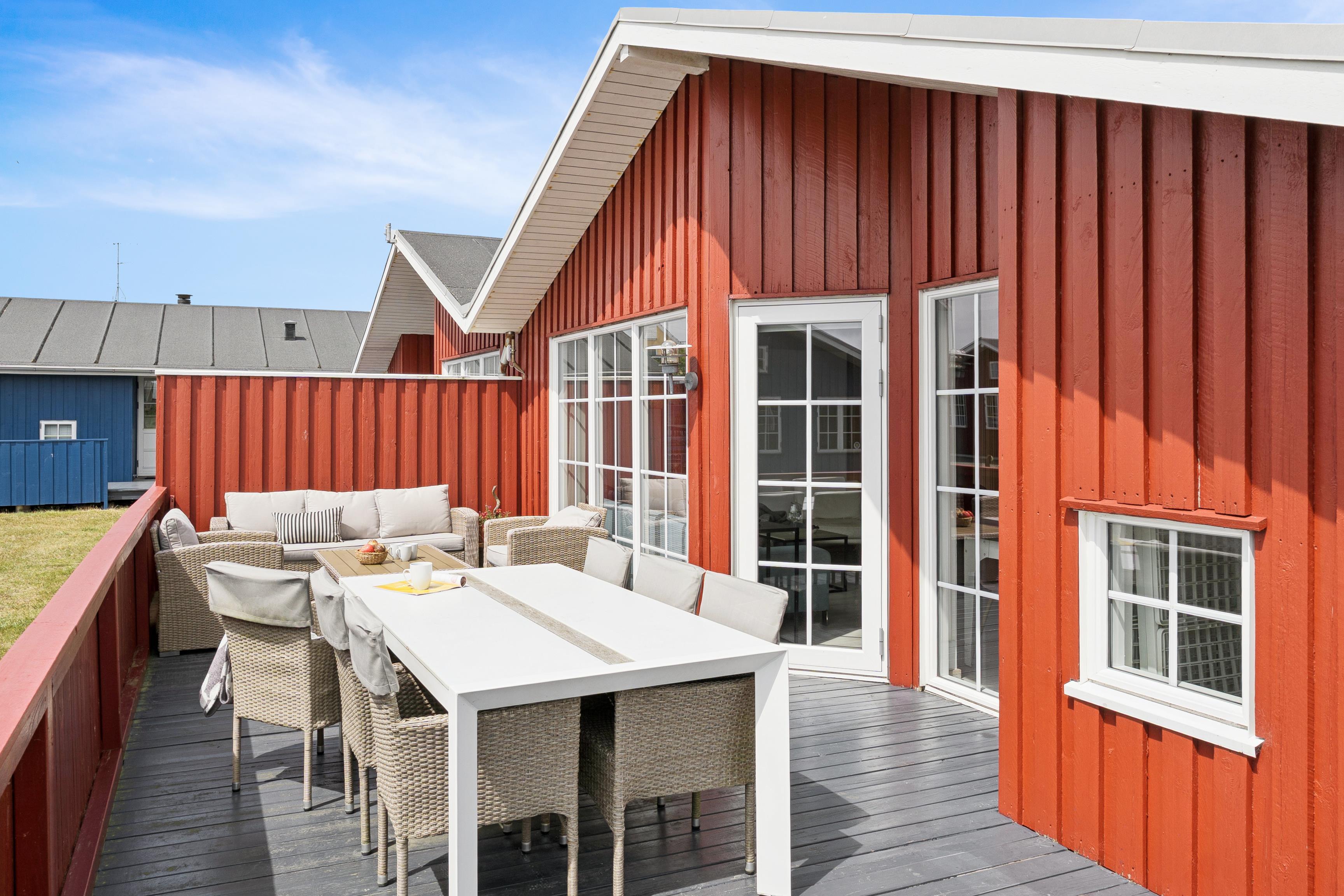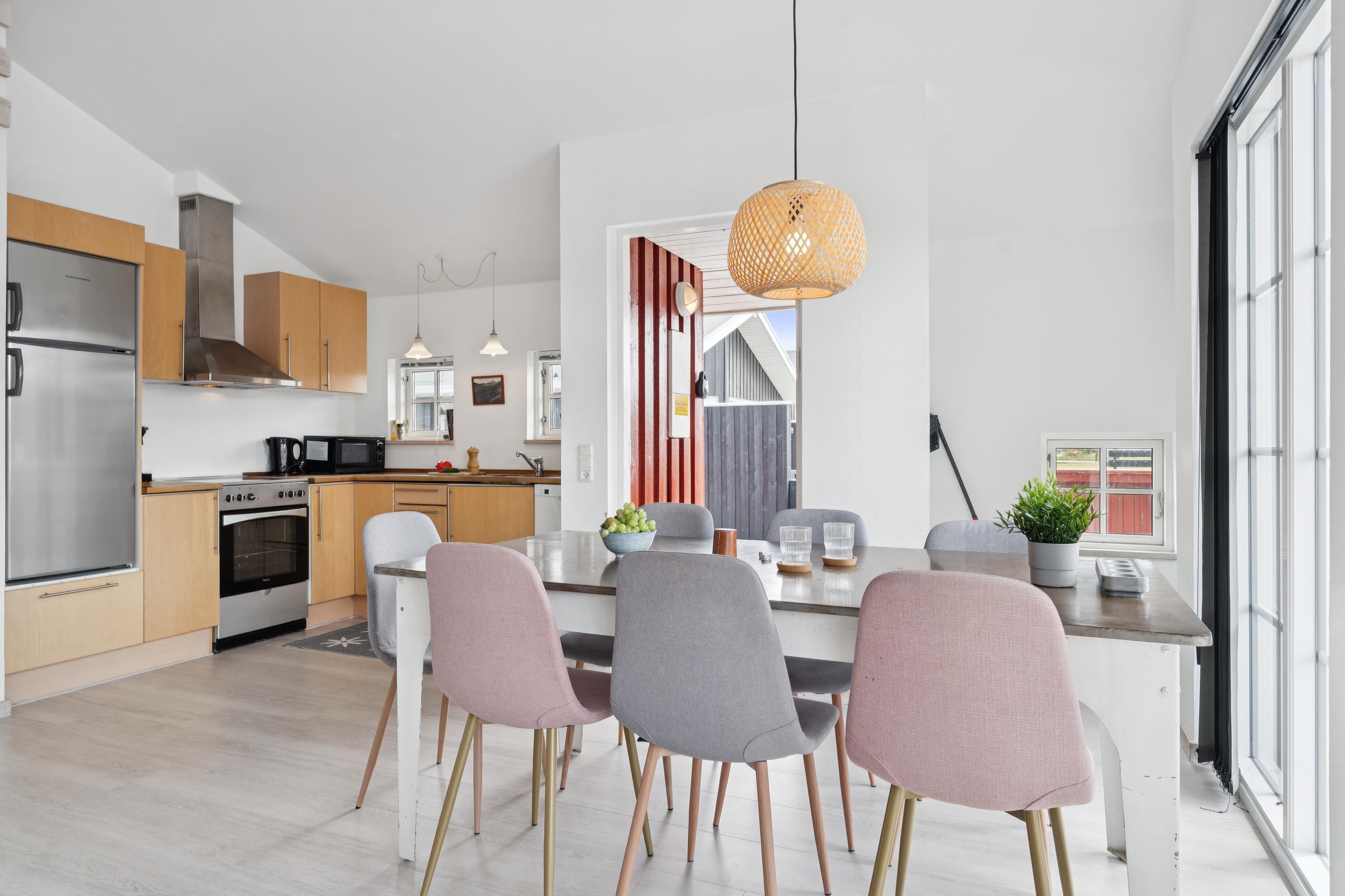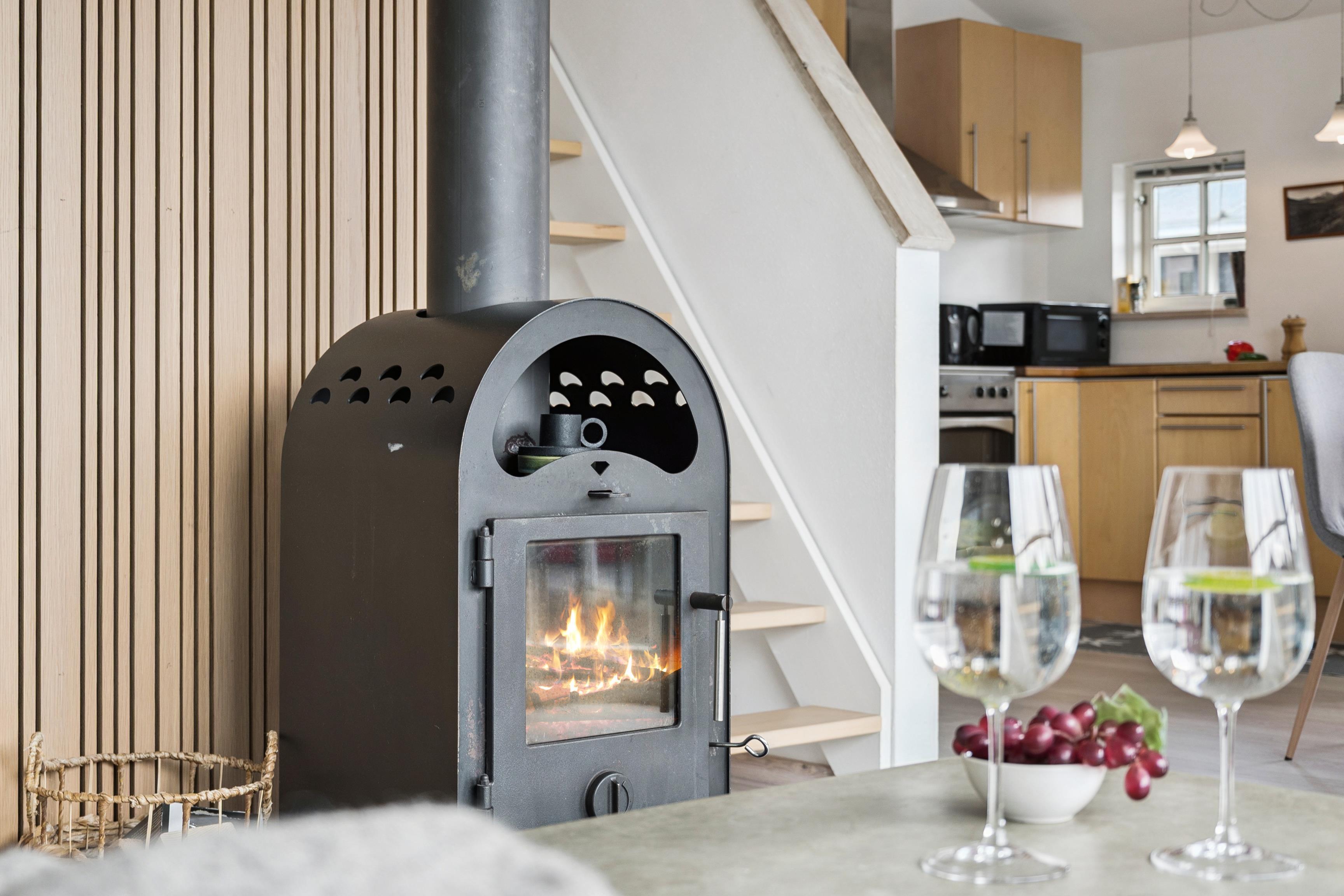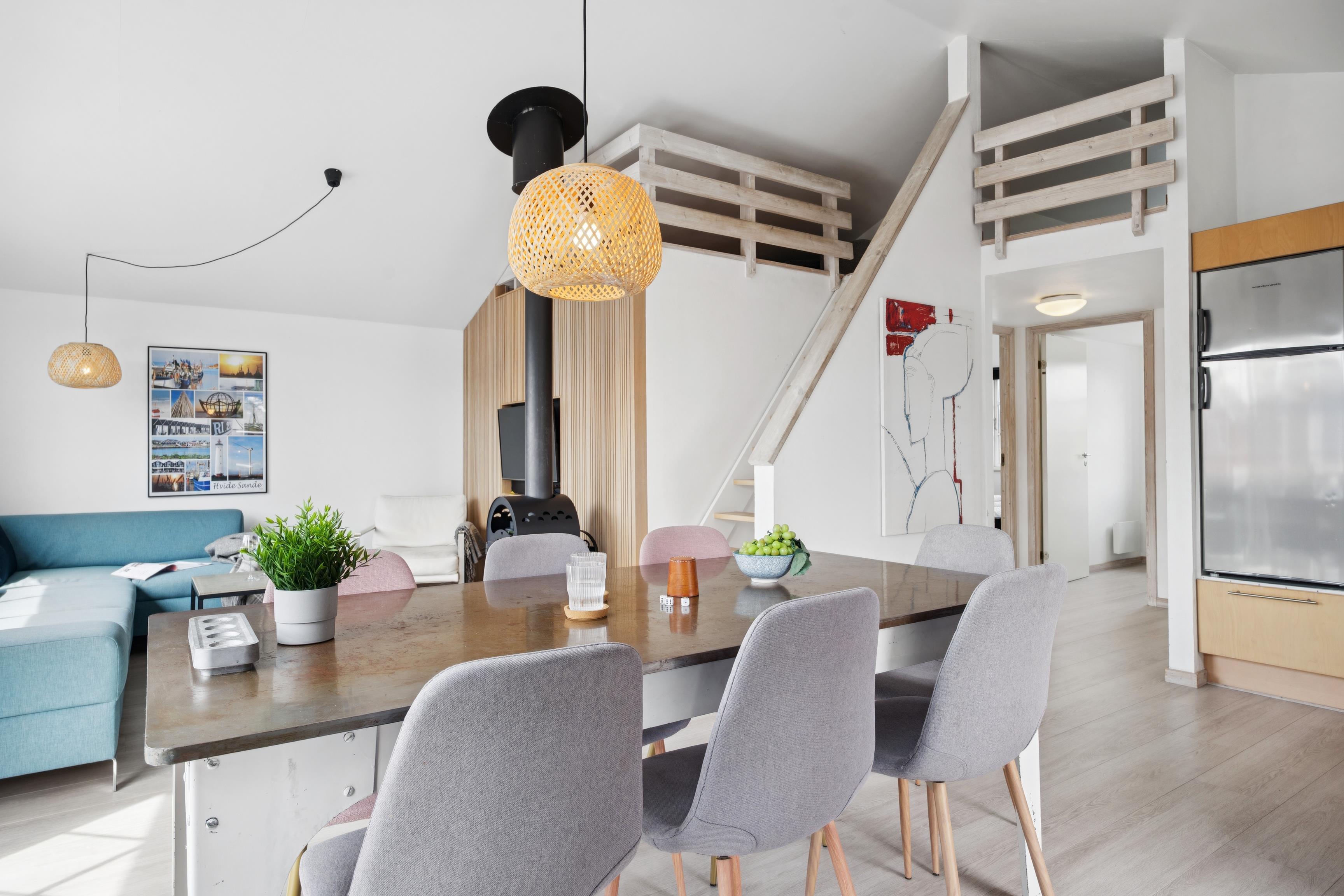 Huset har tre soveværelser, to med dobbeltsenge og et med køjeseng, plus et loft med ekstra soveplads. Det åbne køkken-alrum skaber en hyggelig atmosfære – perfekt til at tilbringe tid med familie, venner eller bare jer to. Nyd varmen fra brændeovnen på kølige aftener og lyt til knitren af ??brænde, når flammerne blusser op. Badeværelset har bruser, gulvvarme og et dejligt spabad til to personer, hvor I kan slappe af og koble fra. Fra stuen har I direkte adgang til en 50 m² stor terrasse mod både øst og syd. I kan nyde solen på liggestolene næsten hele dagen lang. Et stort bord og en komfortabel sofagruppe er til rådighed til aftener udendørs med familie eller venner.