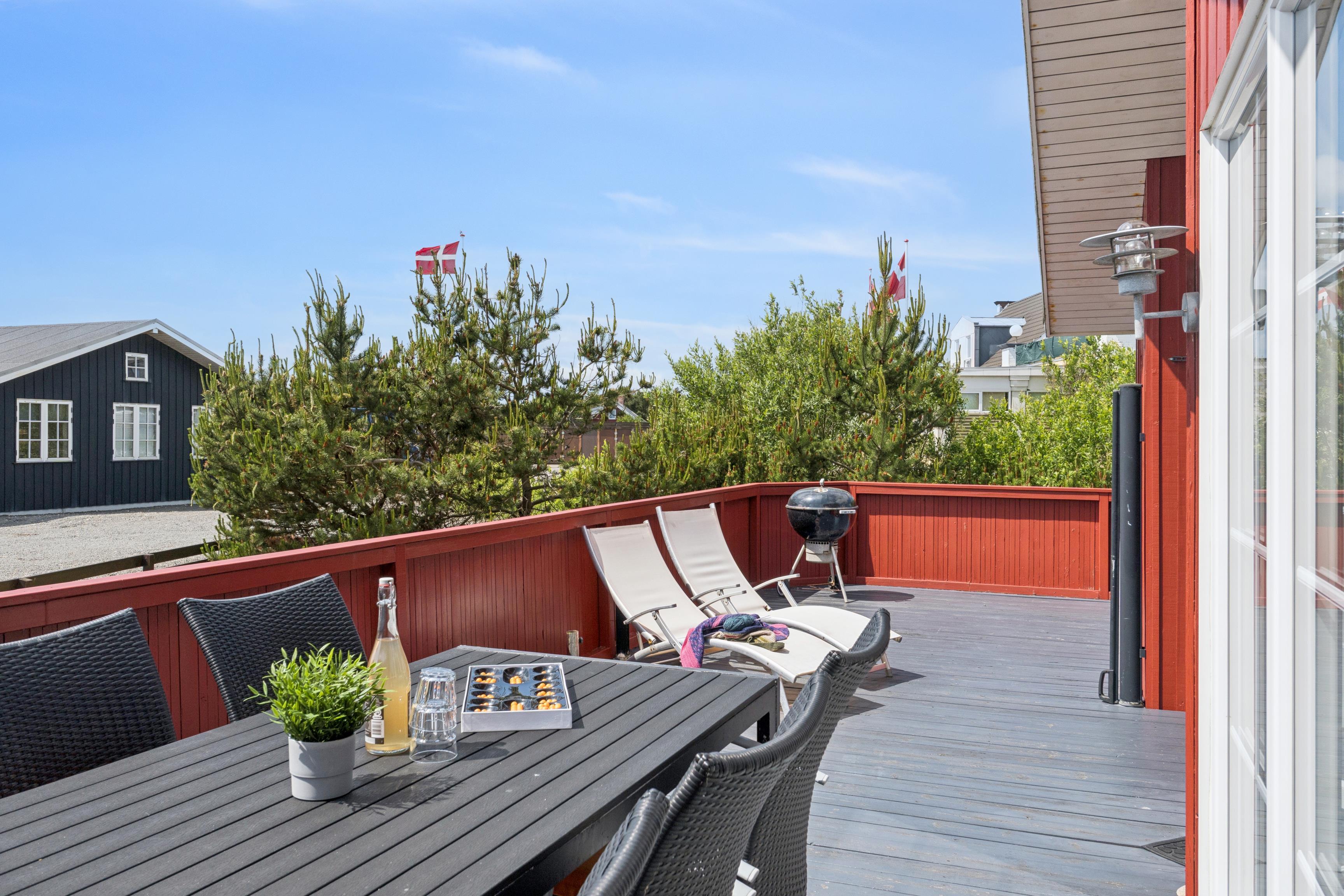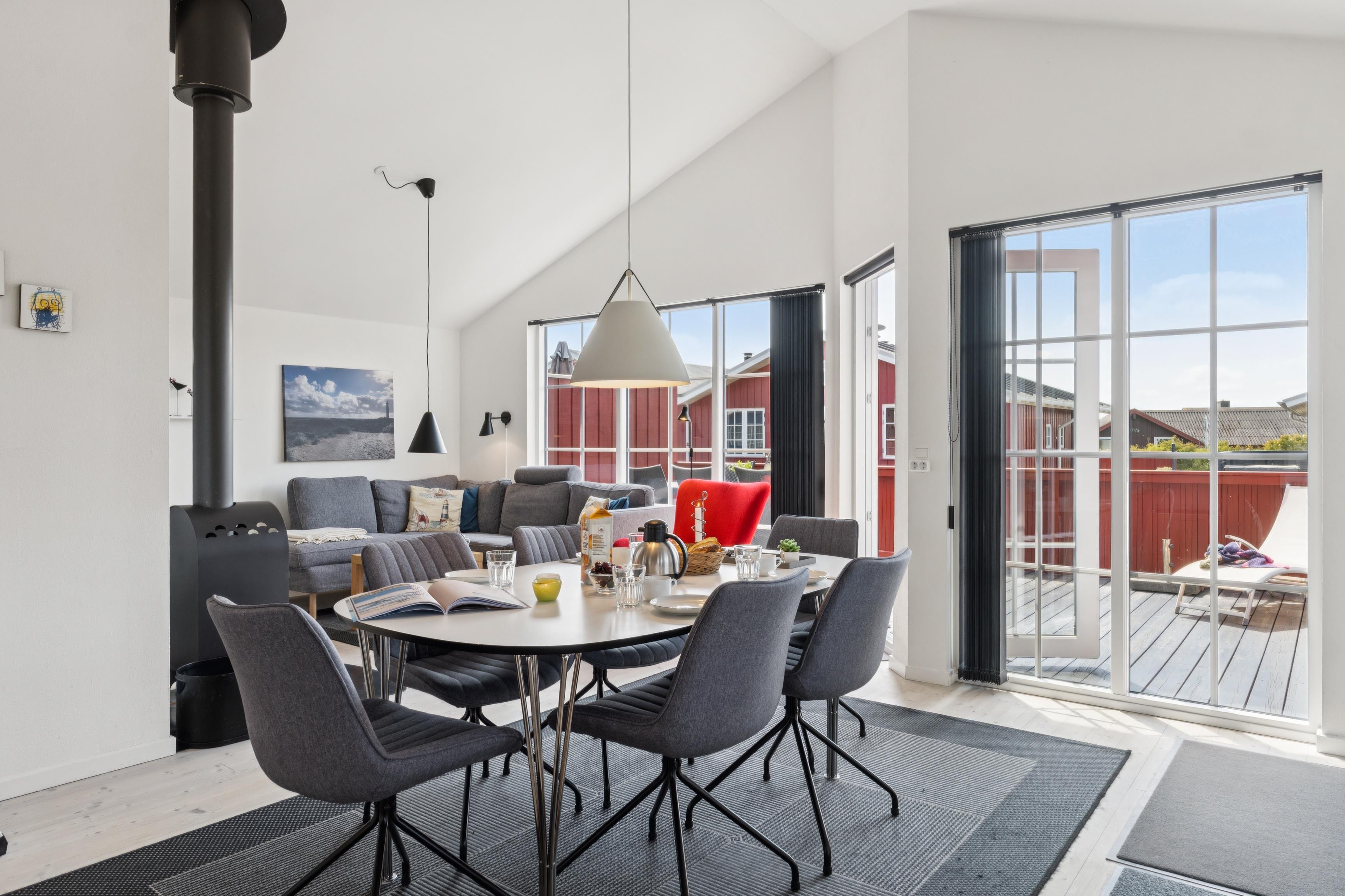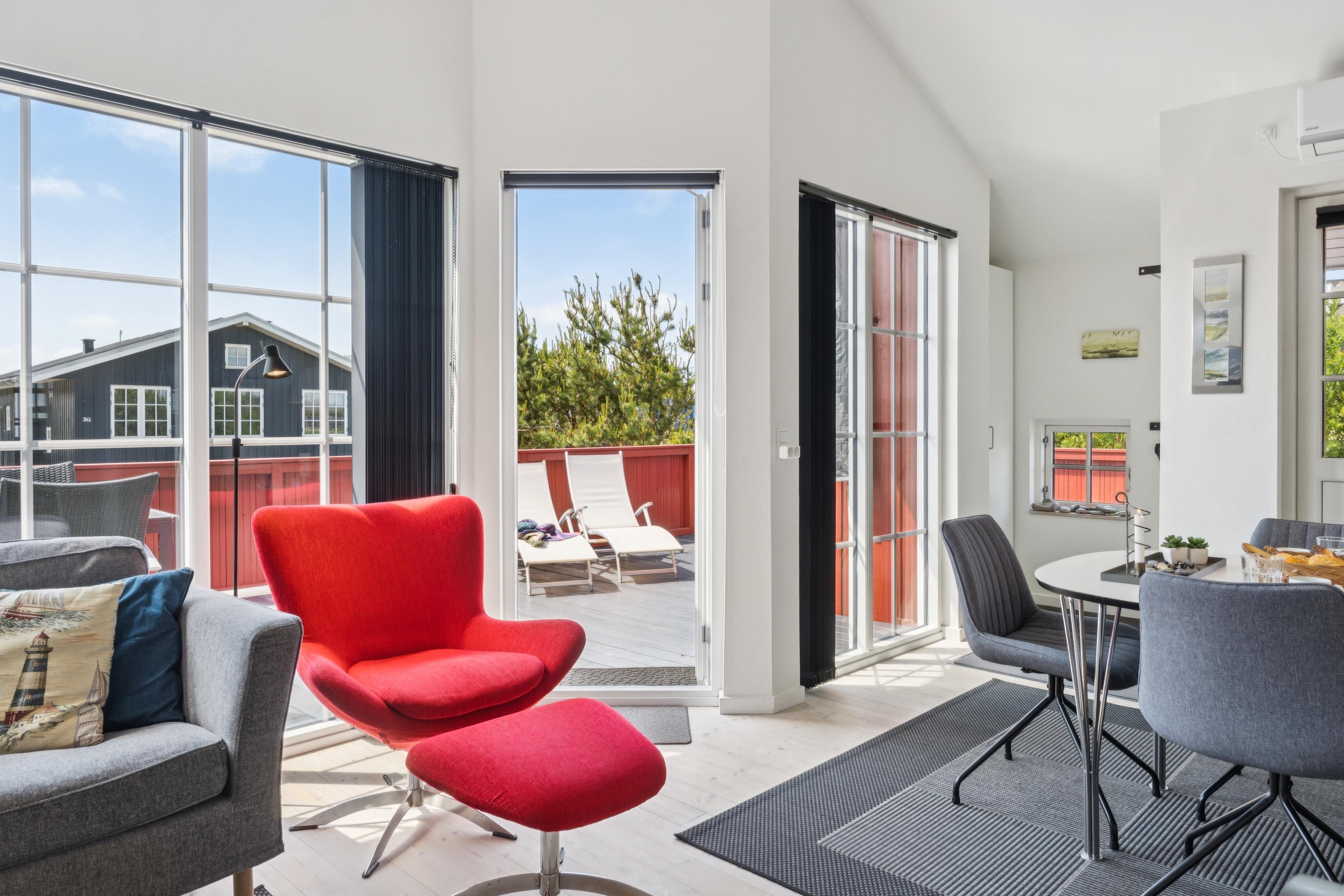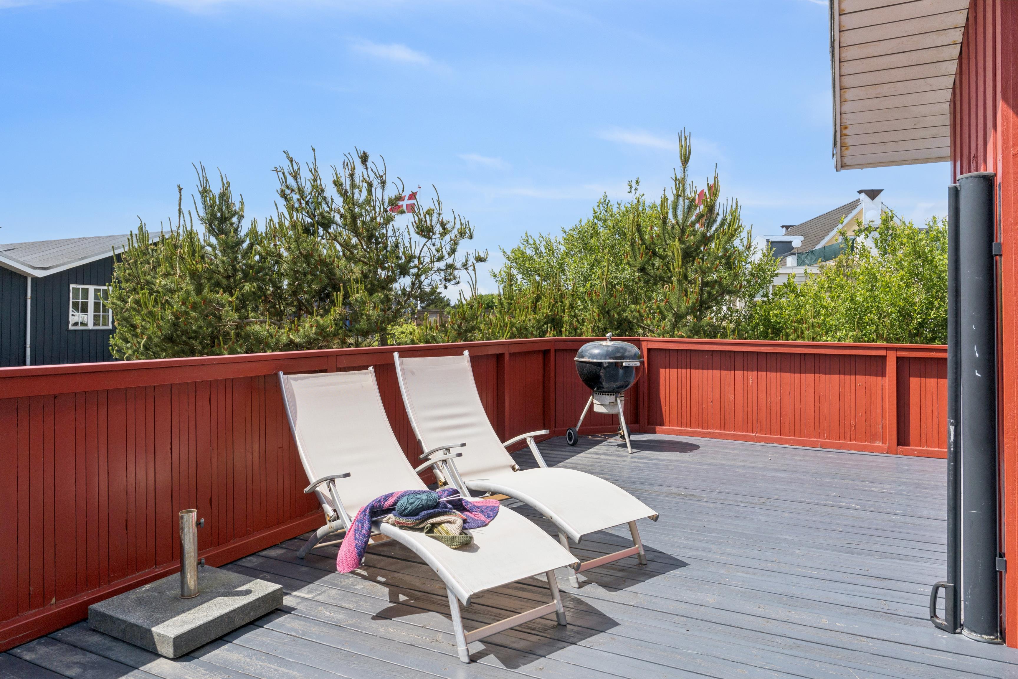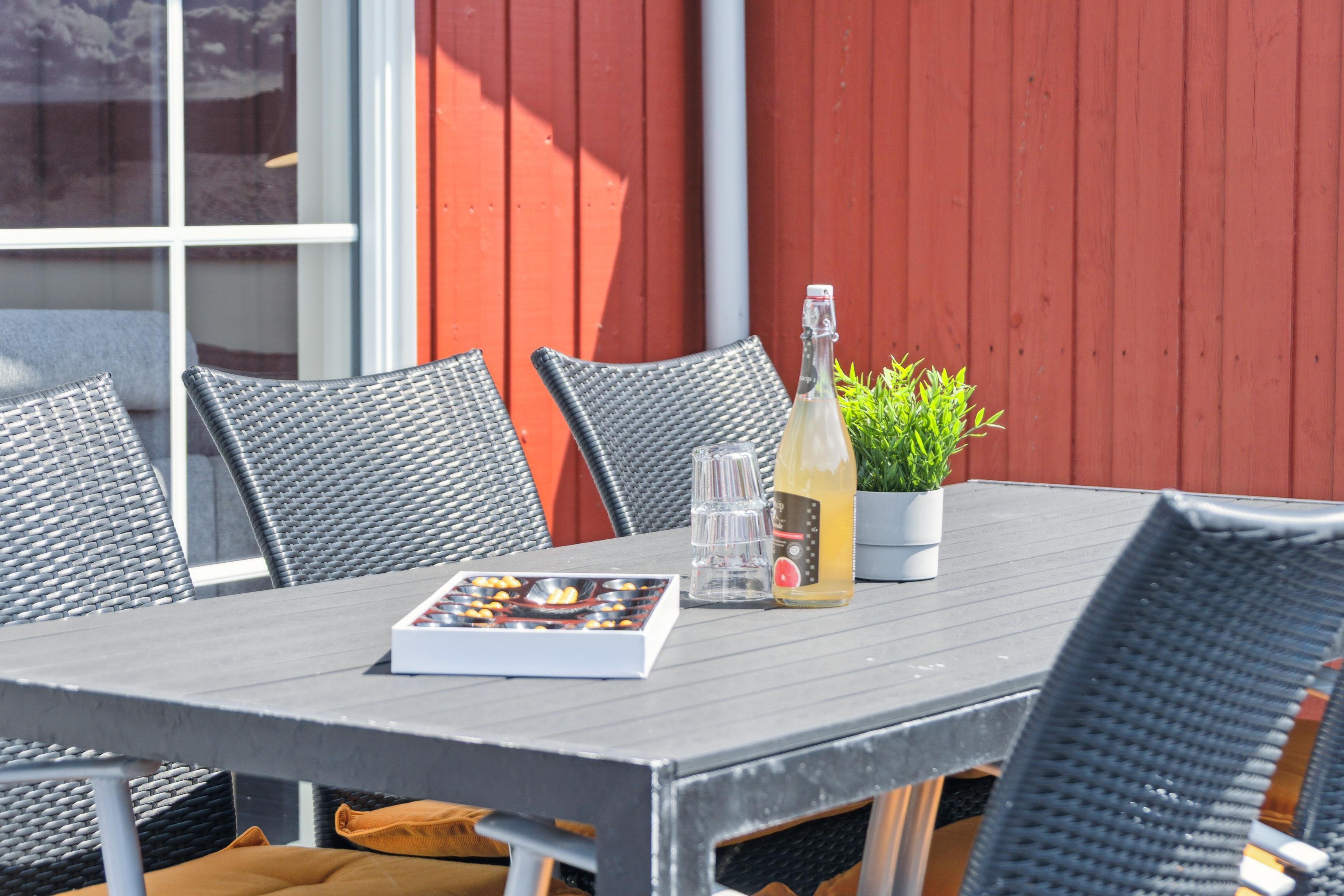 Fra stuen kommer du ud på en stor, solrig sydterrasse, hvor der står et bord med komfortable stole og en grill. Slap af i solen på de tilgængelige liggestole eller grill sammen under åben himmel. For familier med børn er der en legeplads med gynger og fodboldmål i nærheden.