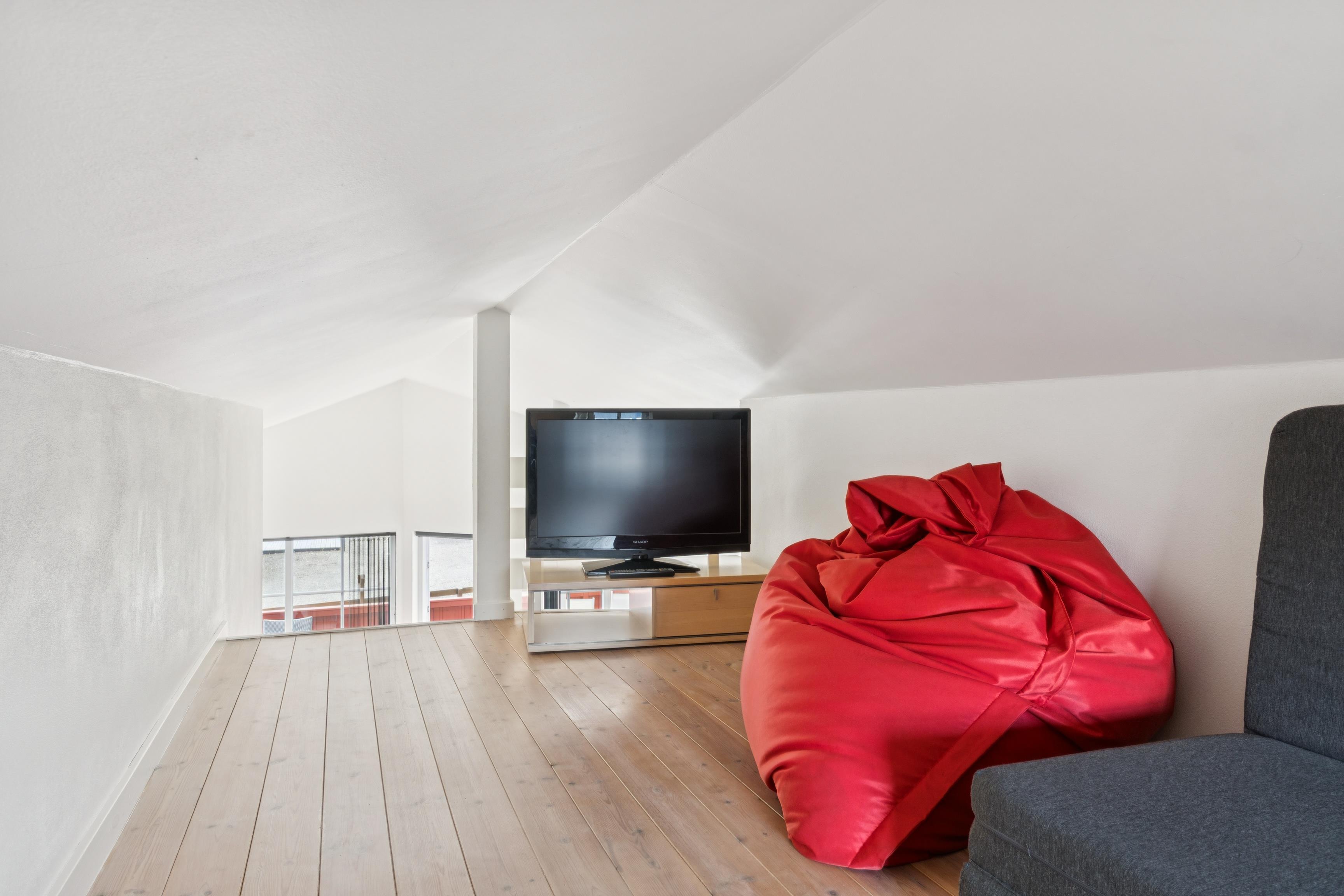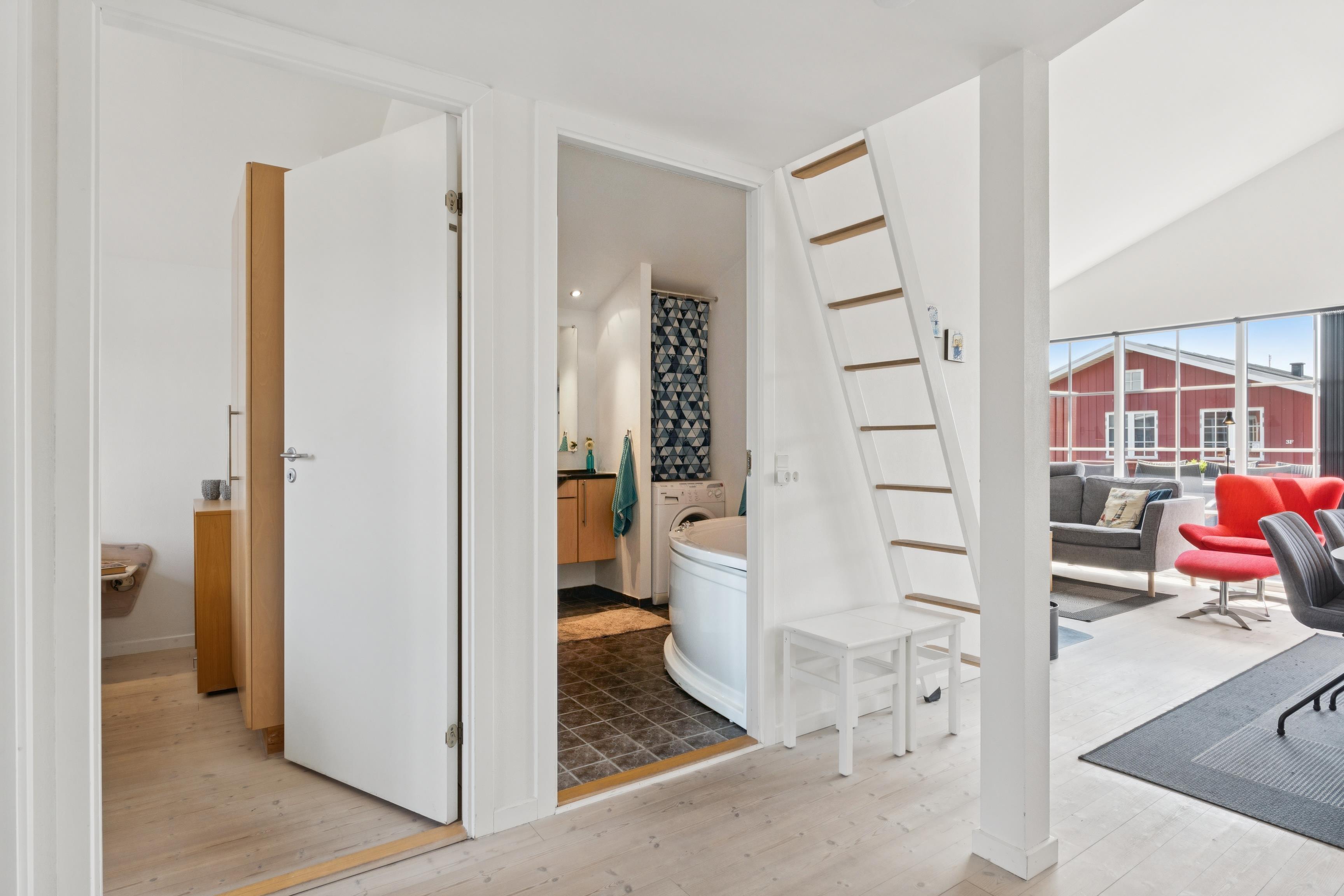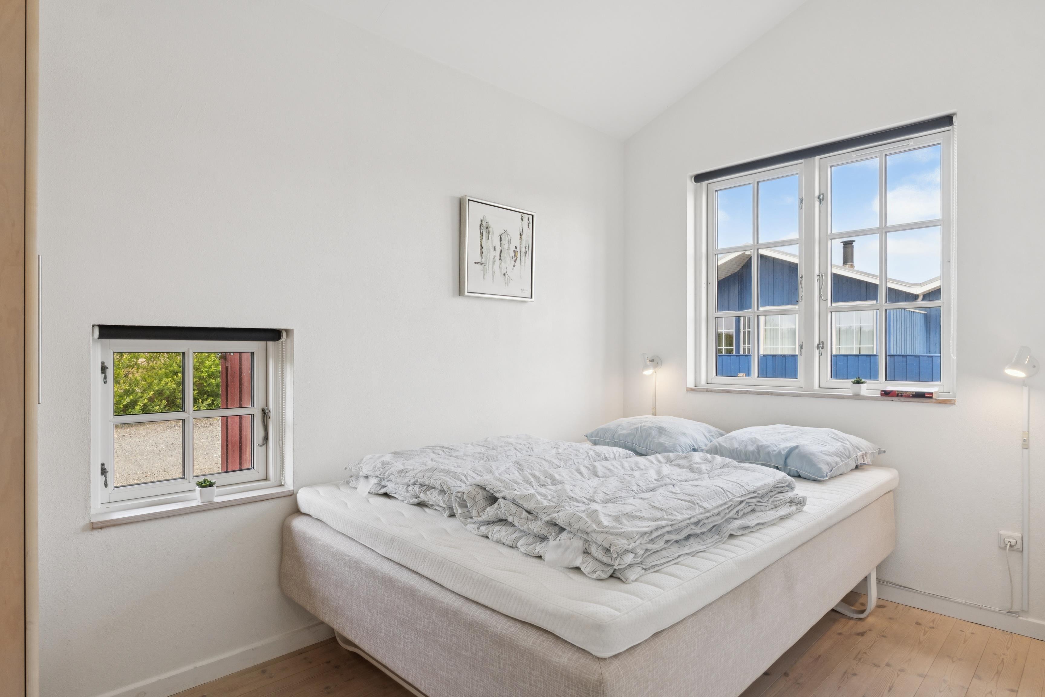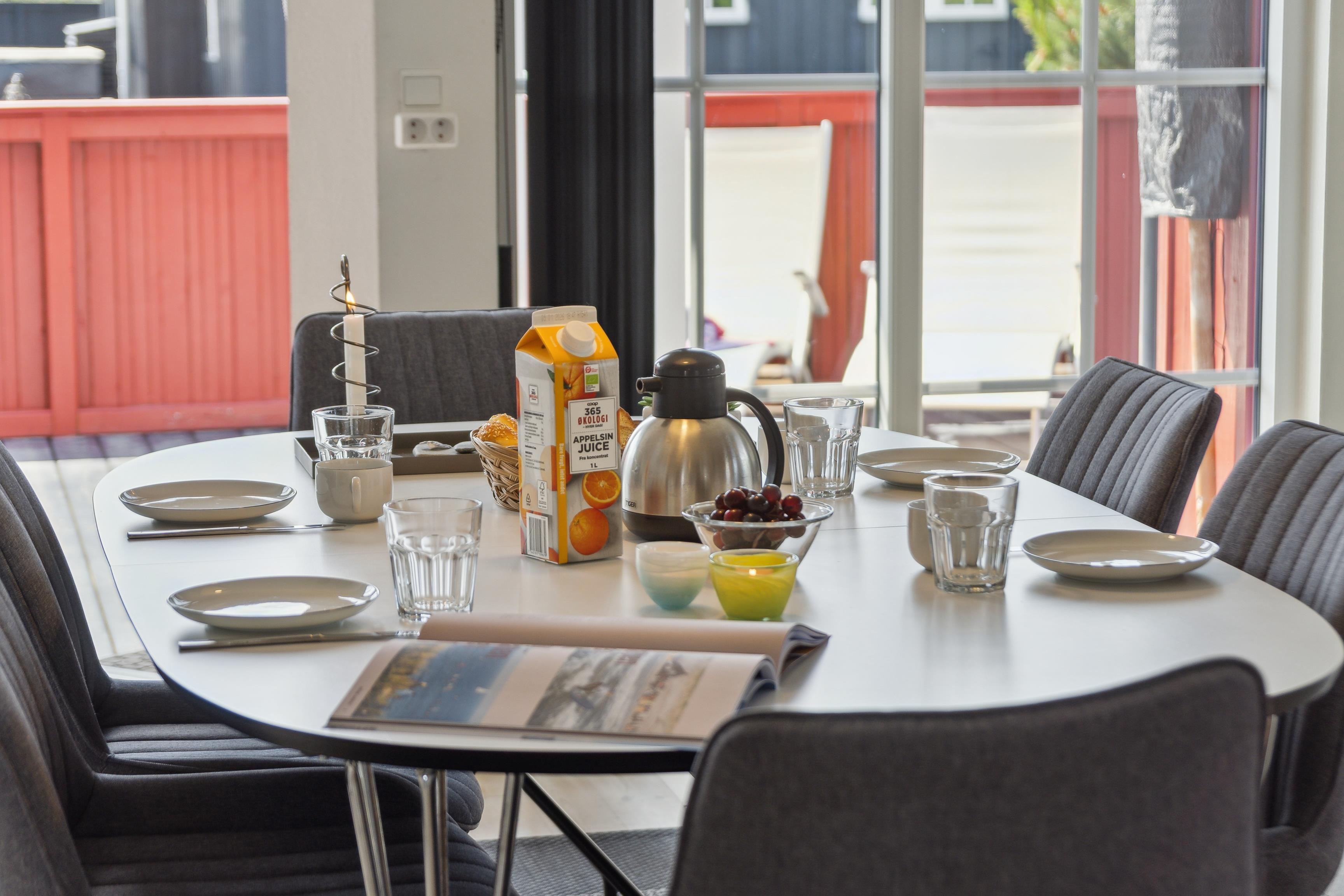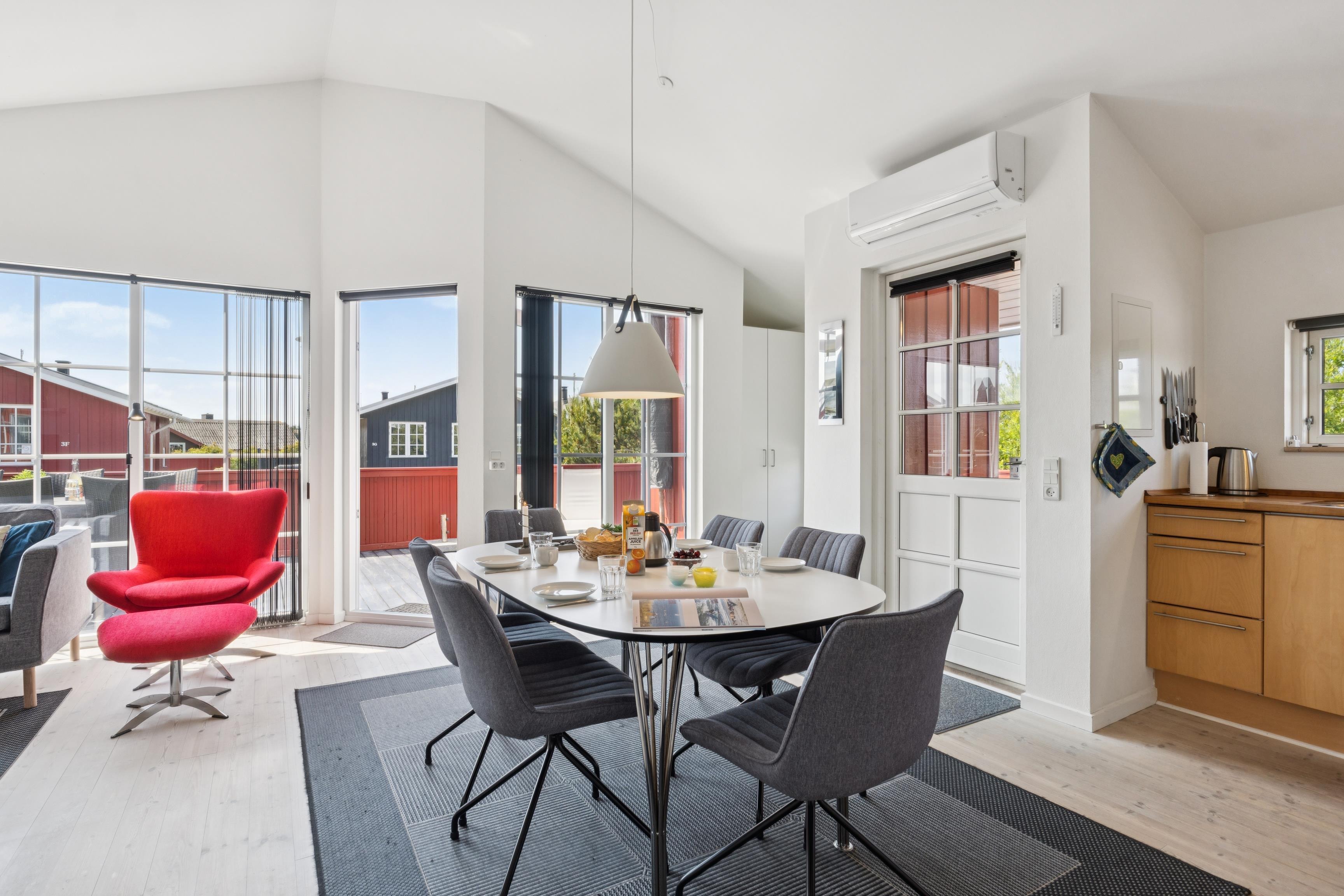Fra stuen kommer du ud på en stor, solrig sydterrasse, hvor der står et bord med komfortable stole og en grill. Slap af i solen på de tilgængelige liggestole eller grill sammen under åben himmel. For familier med børn er der en legeplads med gynger og fodboldmål i nærheden.