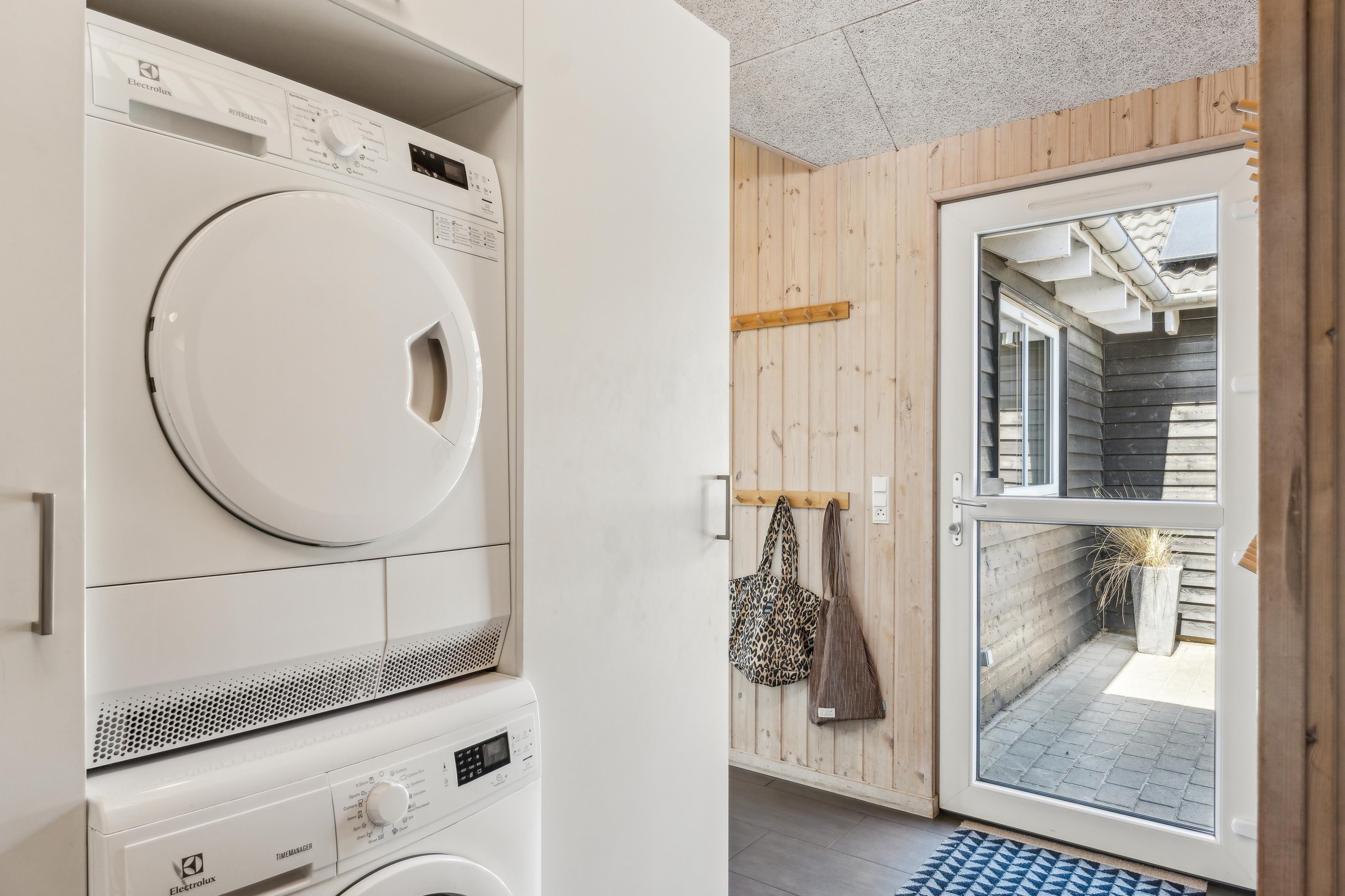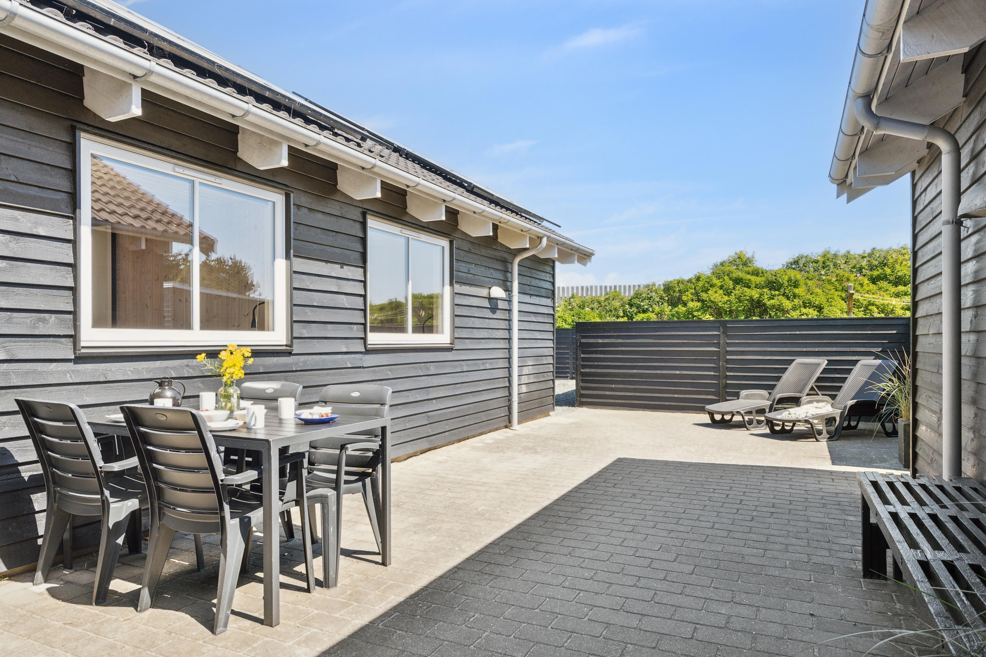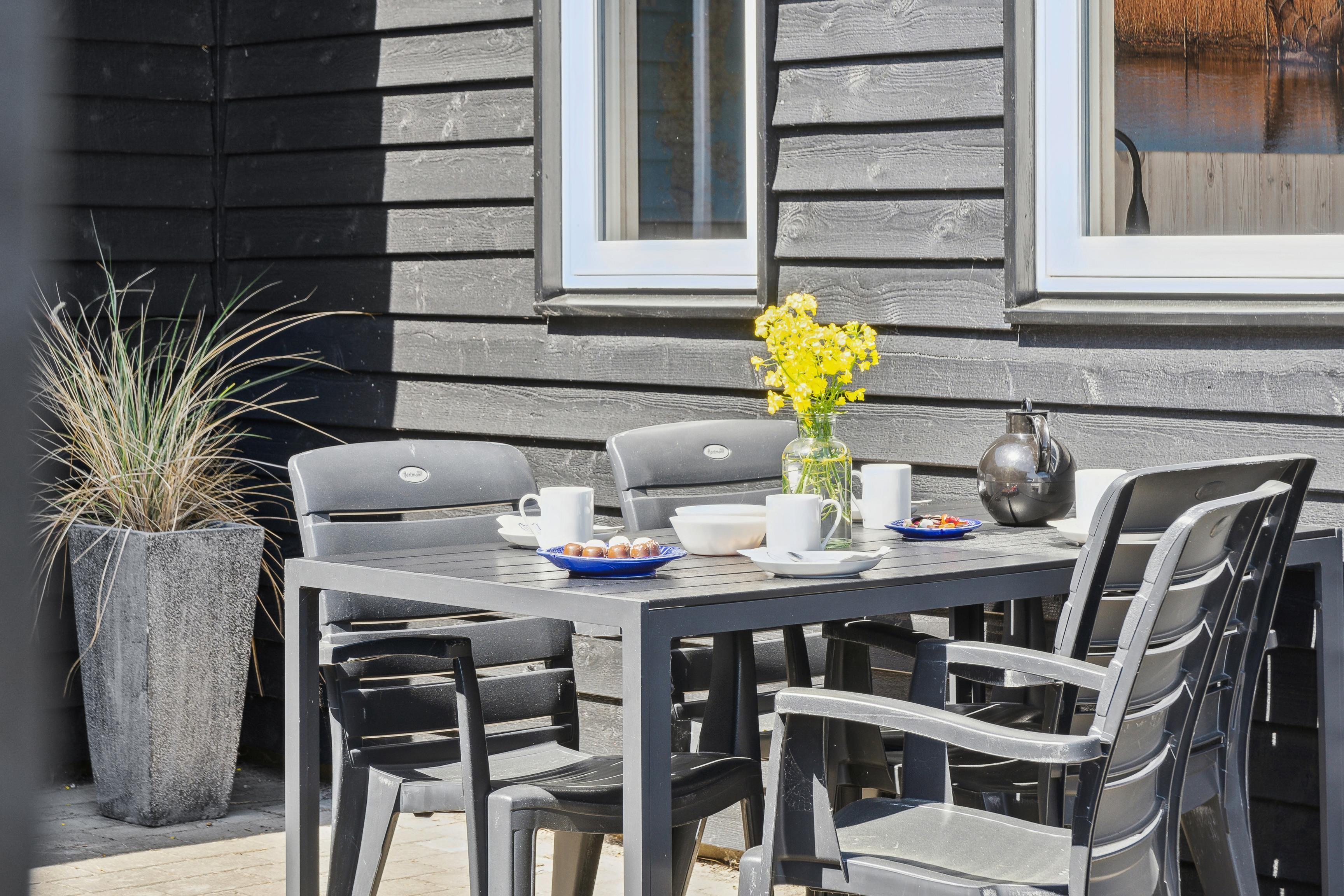 På den delvist overdækkede terrasse kan du nyde de solrige danske sommerdage i liggestolene eller grille de fisk, du måske selv har fanget, på kulgrillen. Du kan slappe af, gynger, spiller fodbold eller skyder et par bolde på minibasketbanen.