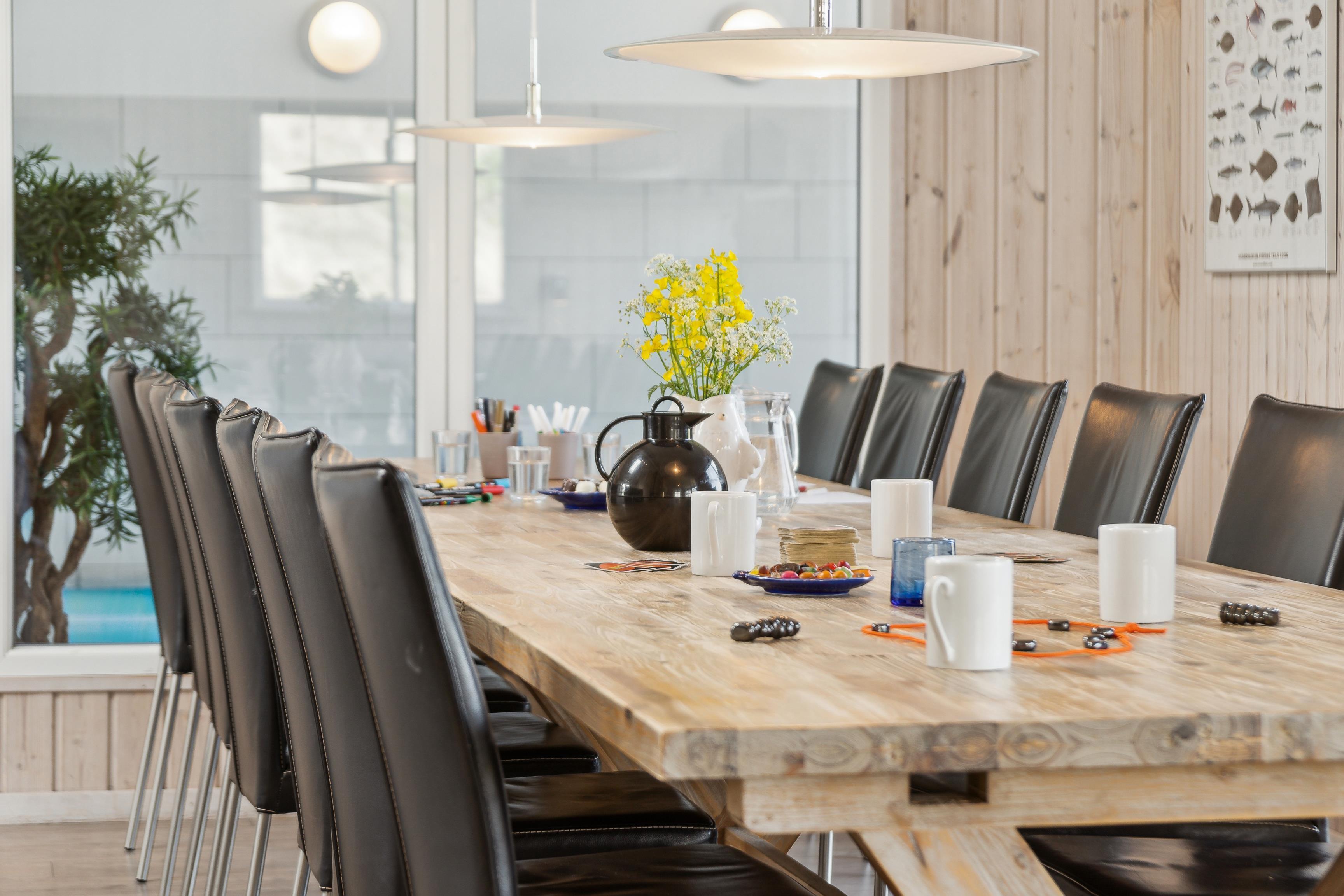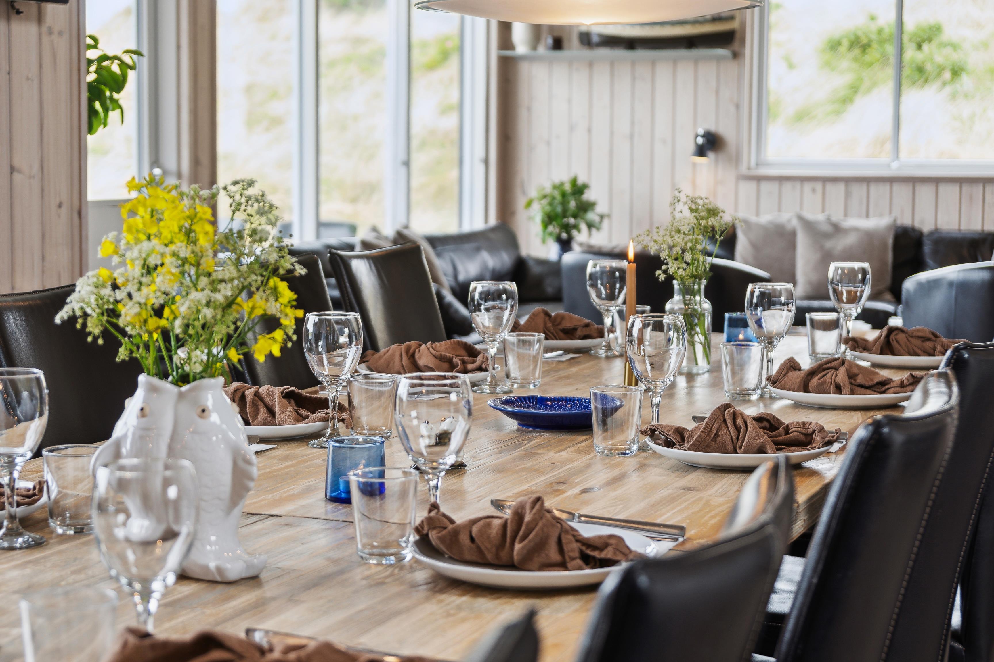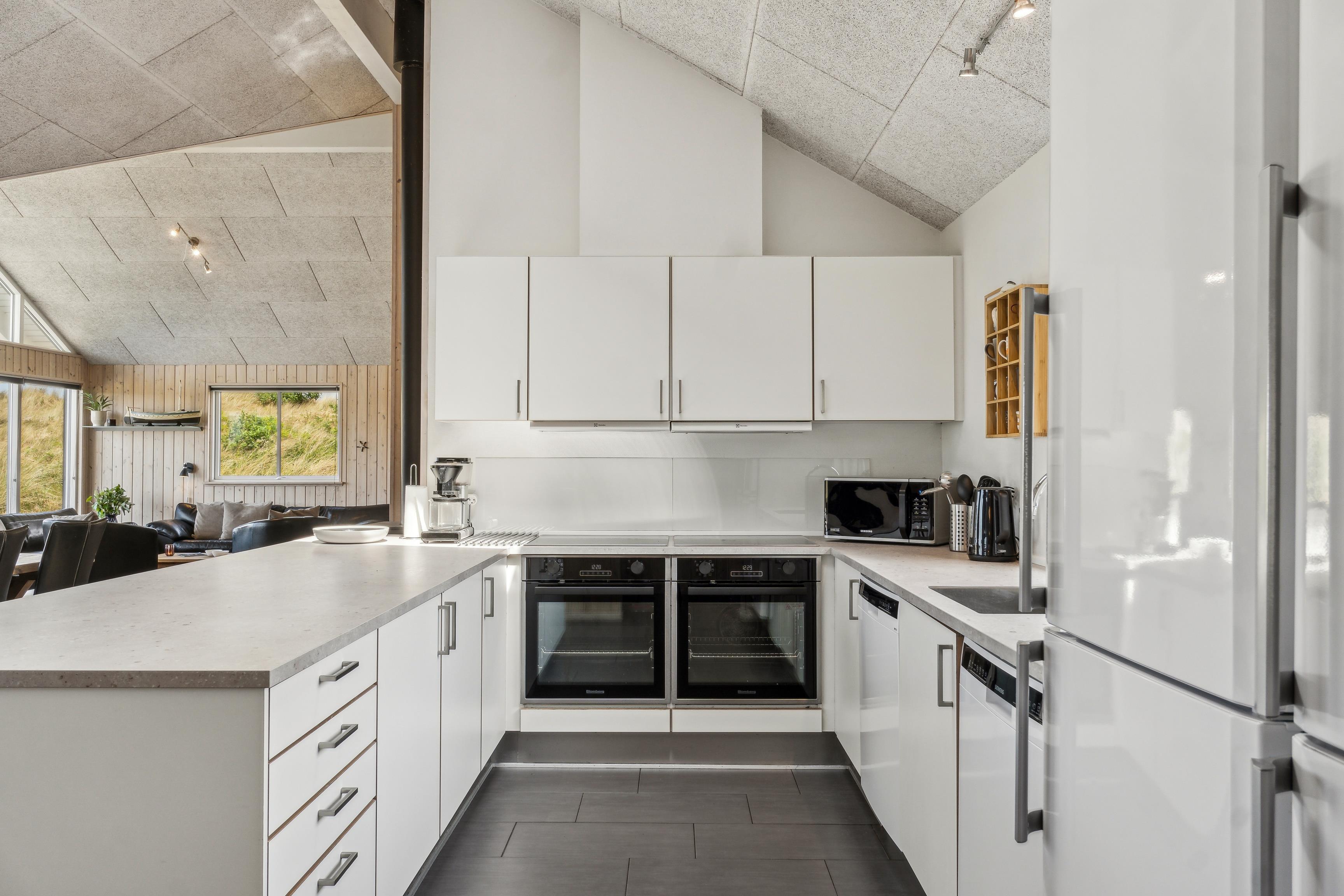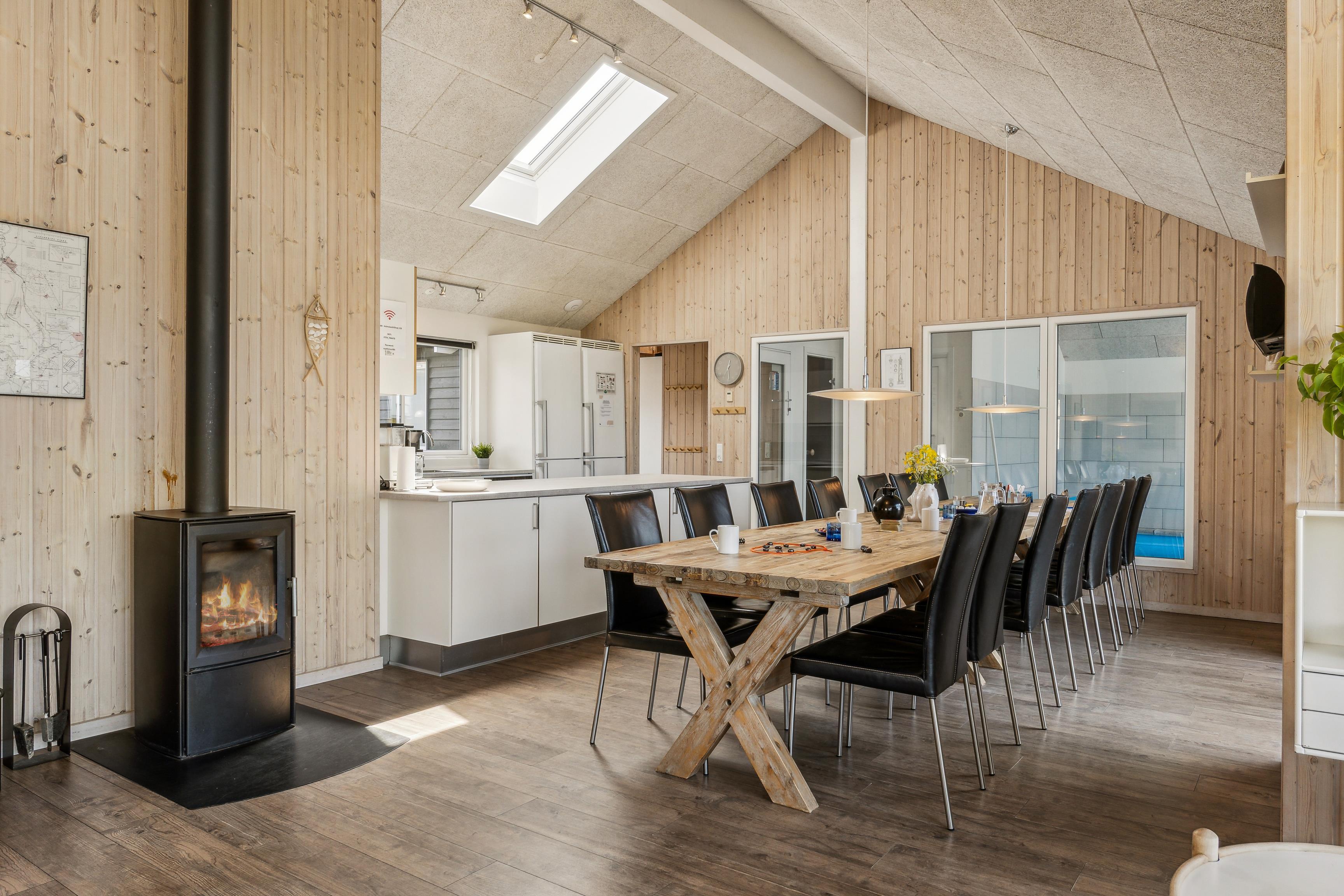 Køkkenet er moderne, meget funktionelt og veludstyret med 2 ovne, 2 opvaskemaskiner og 2 køleskabe/frysere - perfekt til at lave mad sammen til store grupper. Det er perfekt integreret i det store, åbne opholds-/spiseområde, så man får fornemmelsen af at være i ét rum. Det store træbord er det perfekte sted at få en god snak, nyde et måltid sammen eller tilbringe hyggelige aftener med at spille spil. Mens brændeovnen knitrer i baggrunden, spreder der sig en hyggelig varme på køligere dage og skaber en fantastisk atmosfære.
