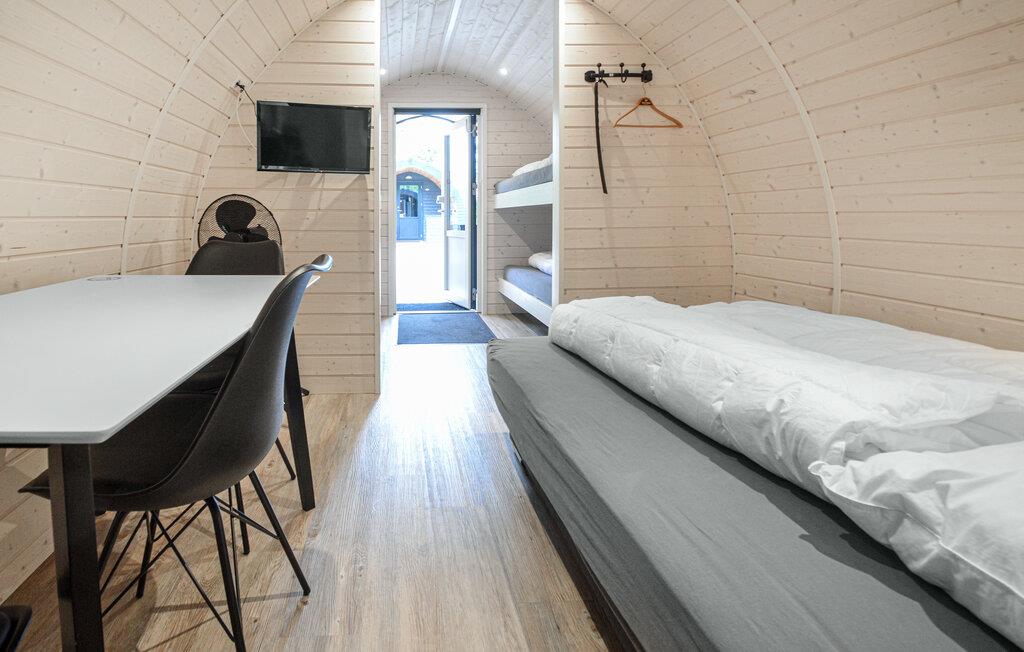 Tøndehytterne er godt indrettet med 2 køjesenge, 1 dobbeltseng, spisebord med 6 stole samt køleskab med fryser, miniovn og elkeddel. Og et badeværelse med bruser. Lejeprisen er inkl. Forbrug.