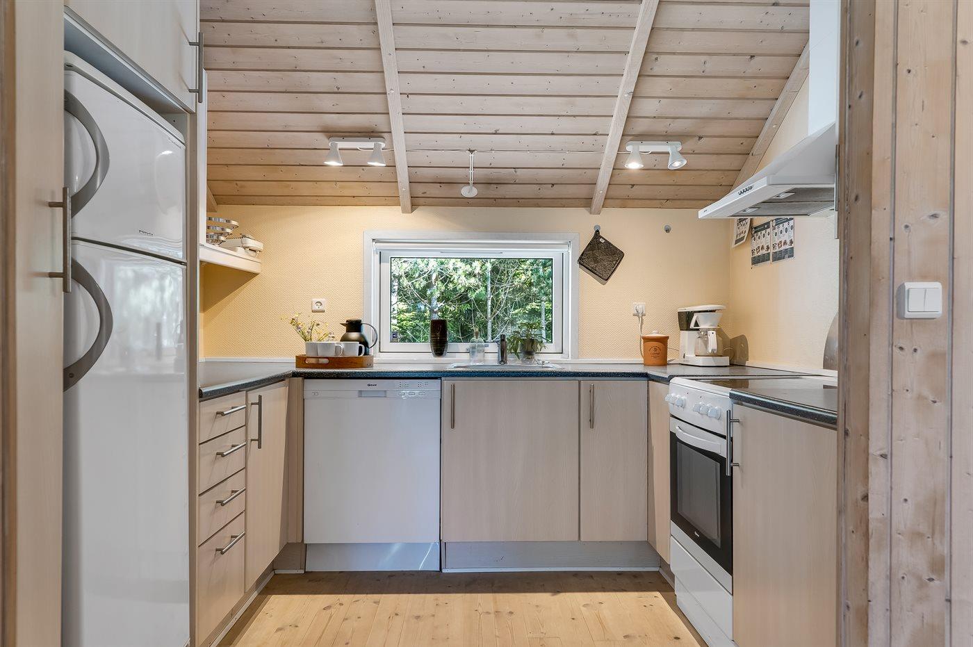 Køkkenet er udstyret med 1 køleskab. Der er 4 keramiske kogeplader, varmluftovn, mikrobølgeovn samt opvaskemaskine.