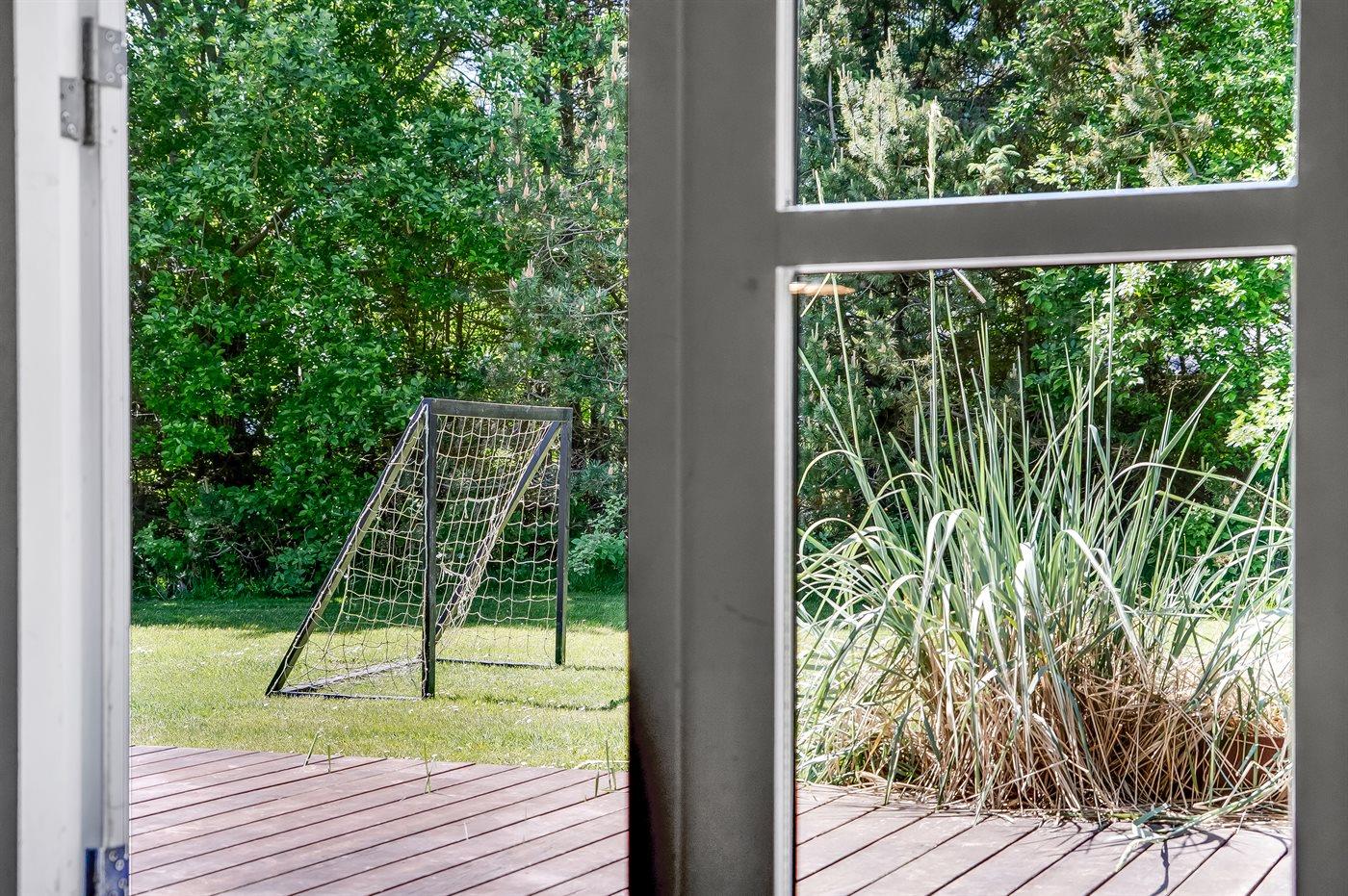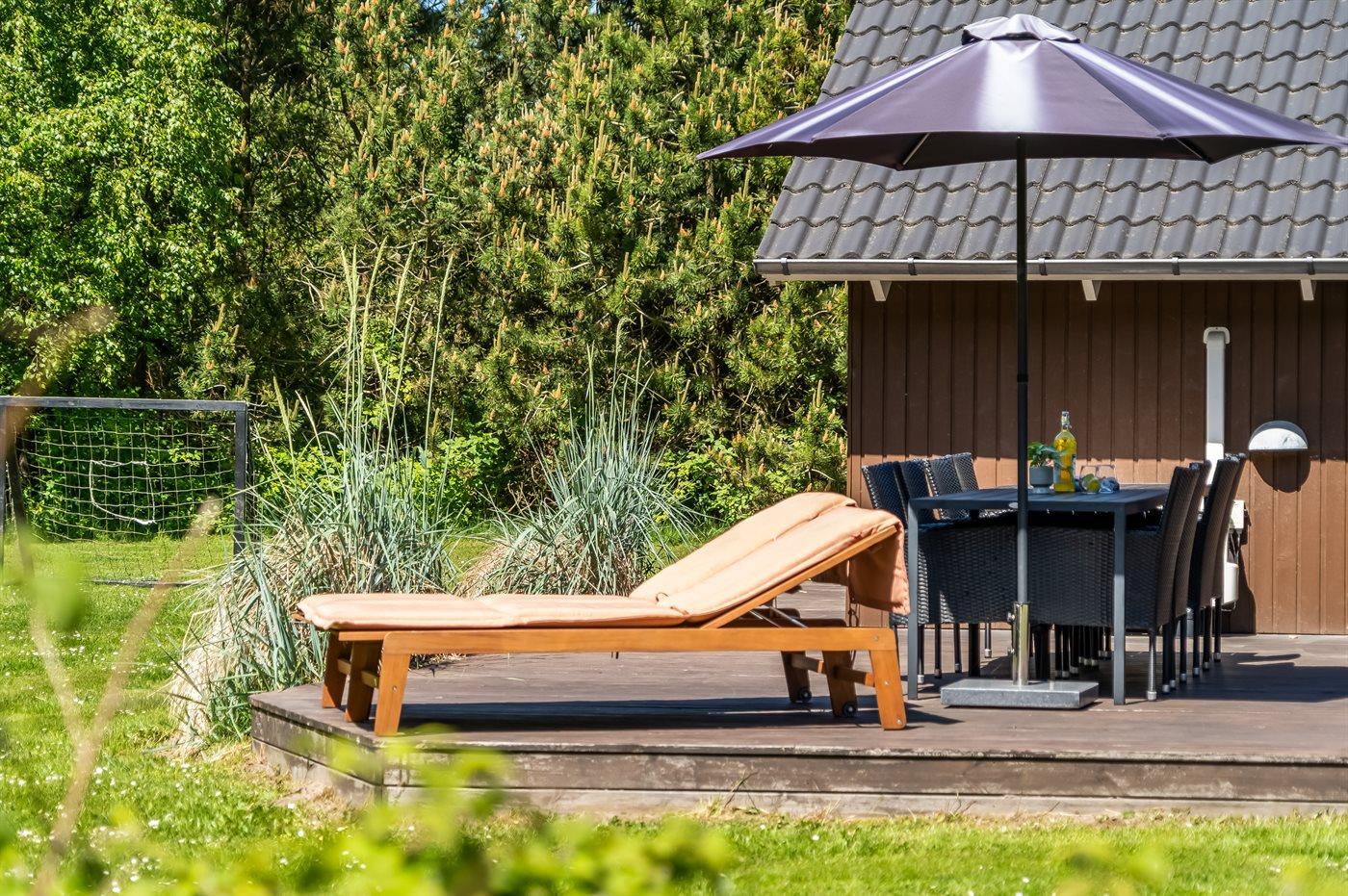 Ferieboligen er beliggende på en 2008 m² stor naturgrund. Der er 600 m til havet. Nærmeste forretning er beliggende i en afstand af 3350 m. Til ferieboligen hører 40 m² terrasseareal. Desuden er der 7 m² overdækket terrasse. Gynge. Legetårn. Fodboldmål. Bålsted. Der er installeret stik til opladning af elbil. Type 2 stik. Med 11 kW ladeeffekt. 4 parkeringspladser findes ved huset.