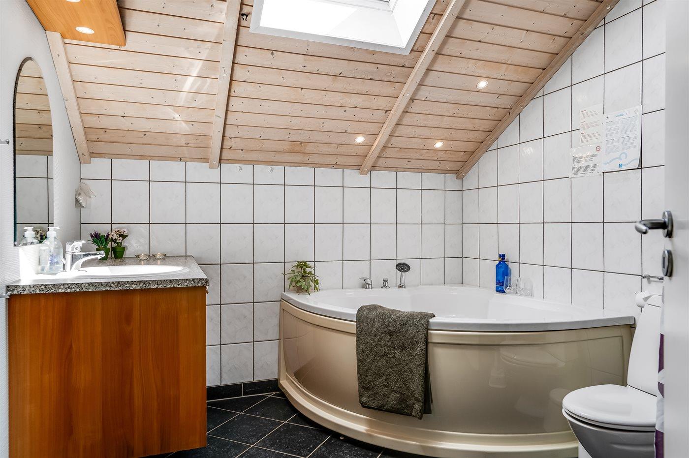 Der er 2 badeværelser med bruseniche og 2 toiletter. Der er gulvvarme på 2 badeværelser. I saunaen er der mulighed for afslapning.