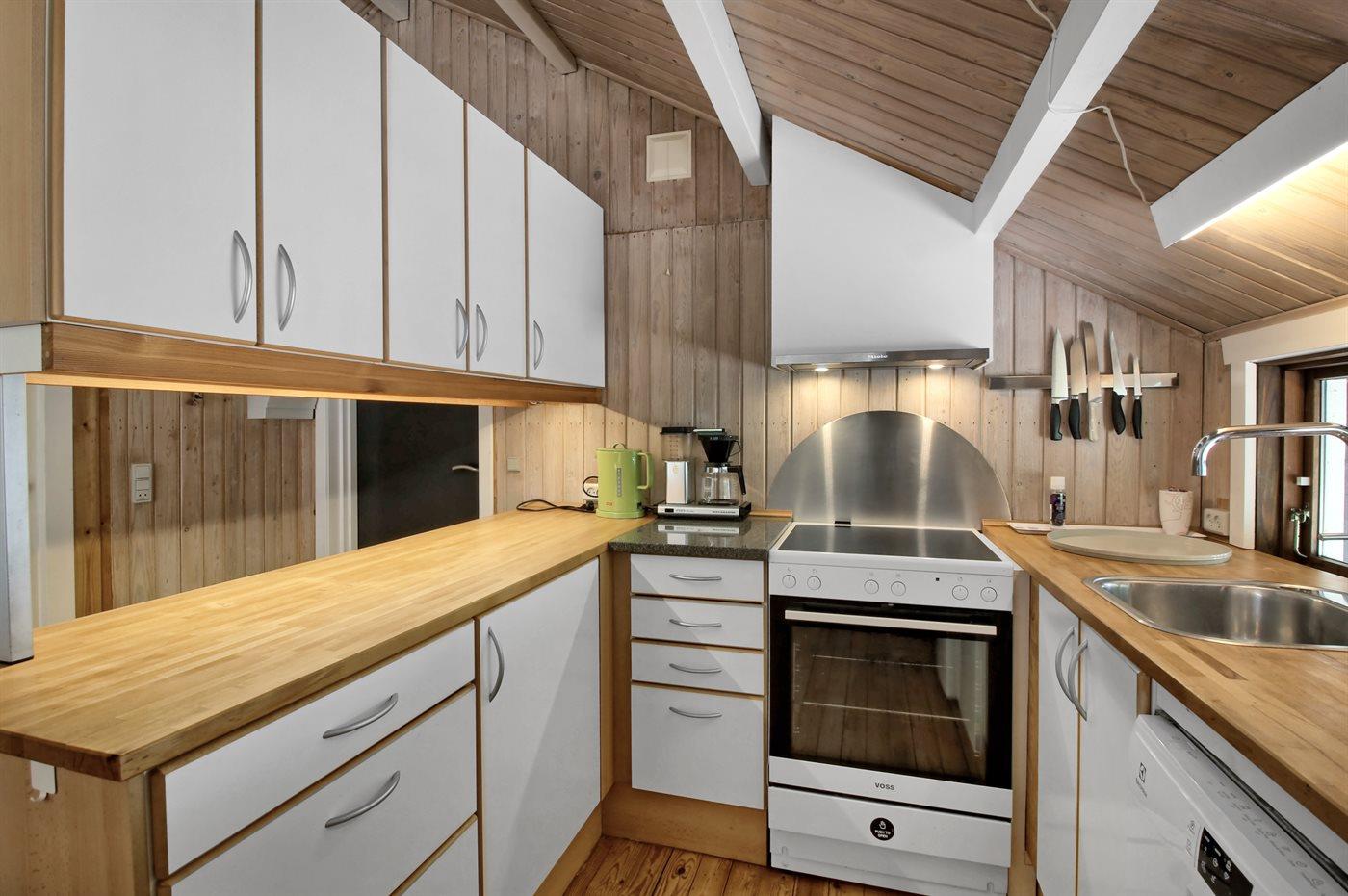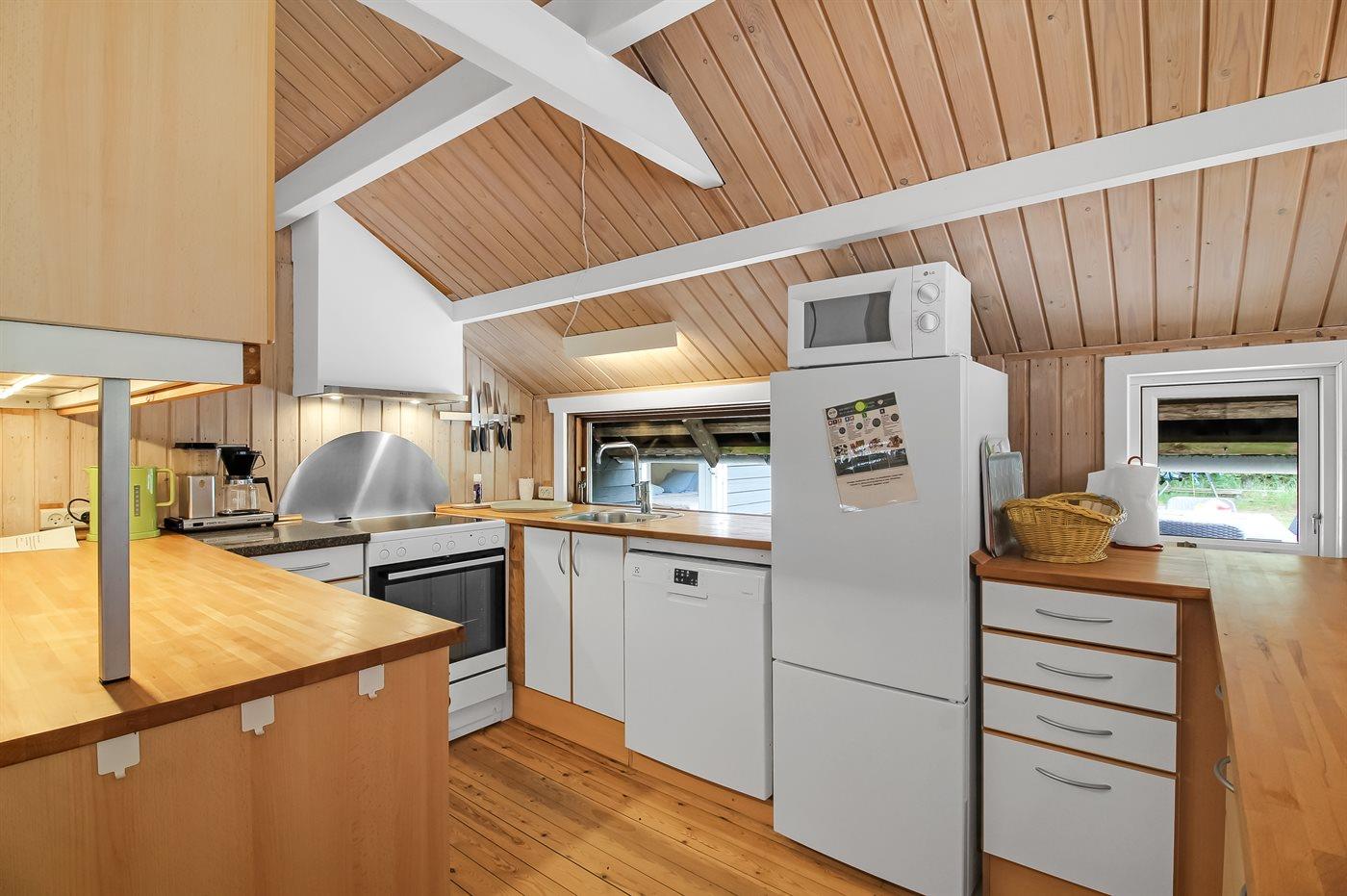 Køkkenet er udstyret med 1 køleskab. Der er 4 keramiske kogeplader, bageovn, mikrobølgeovn samt opvaskemaskine.