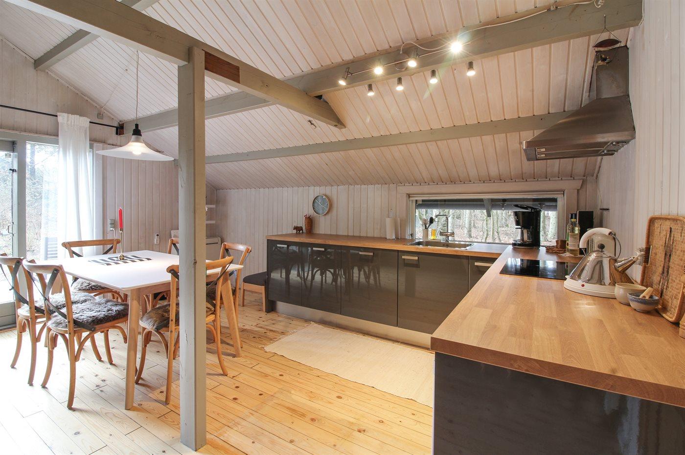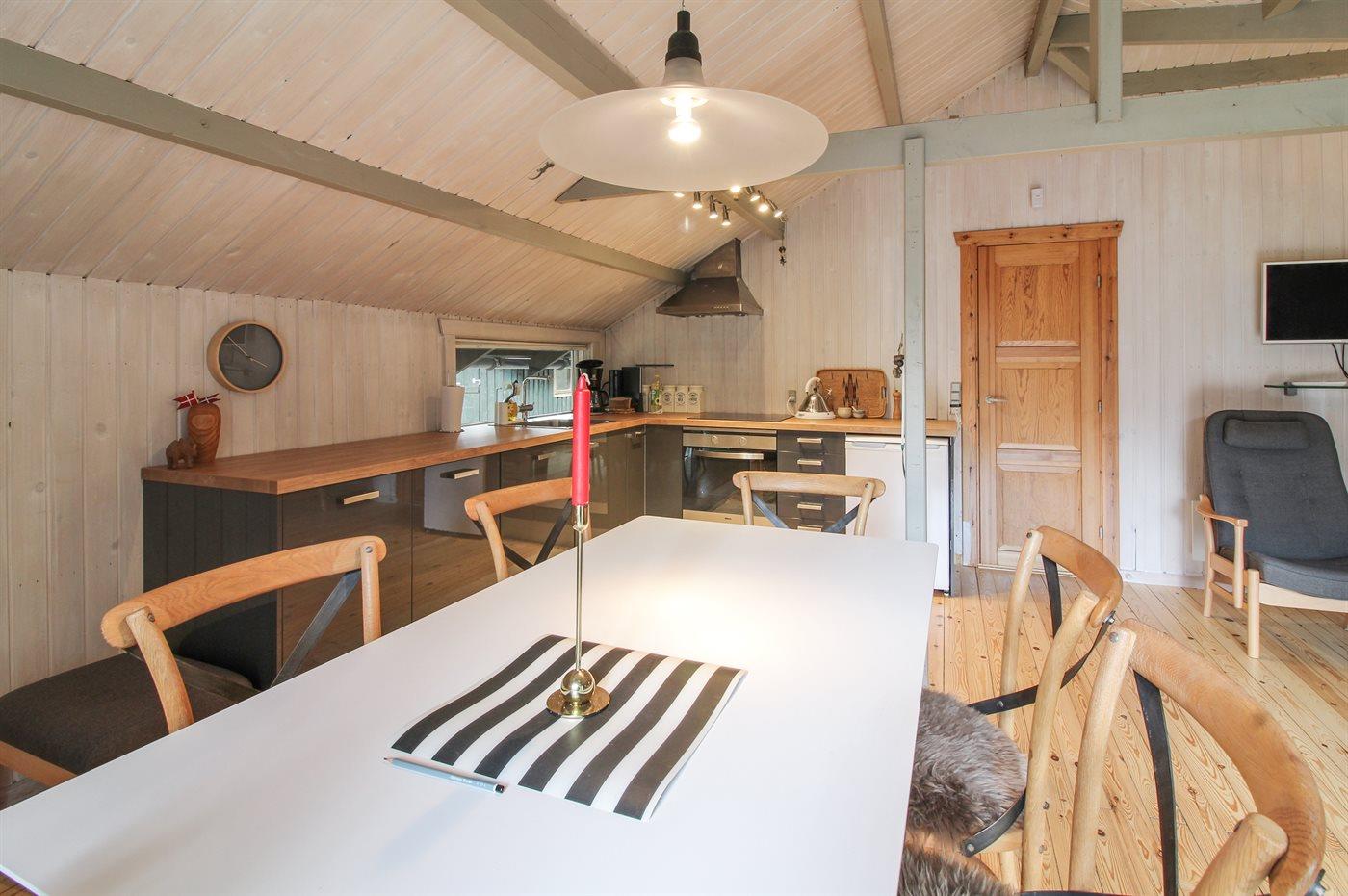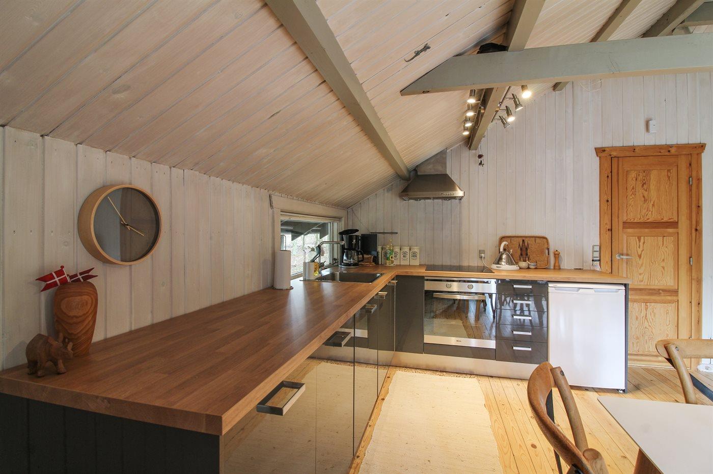 Køkkenet er udstyret med 1 køleskab. Der er 4 keramiske kogeplader, varmluftovn samt opvaskemaskine.