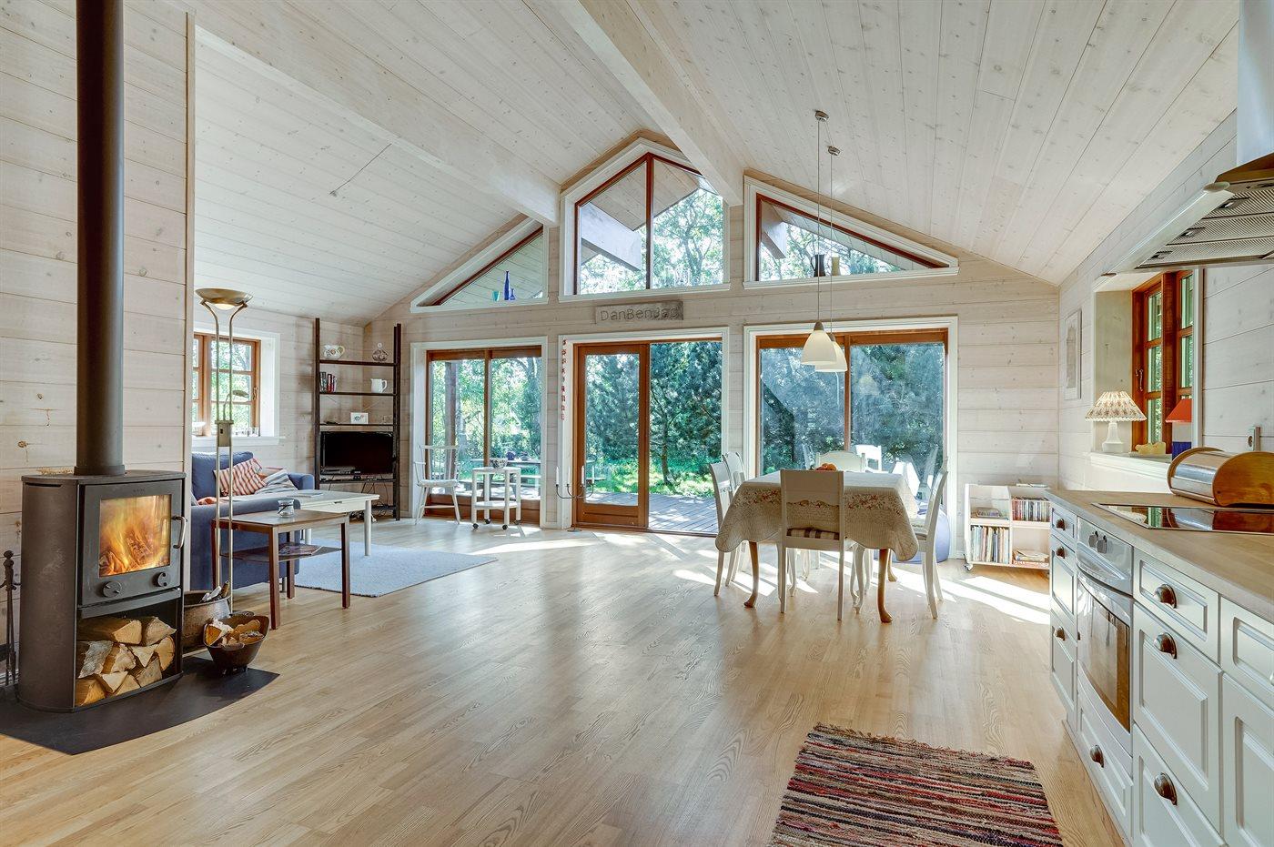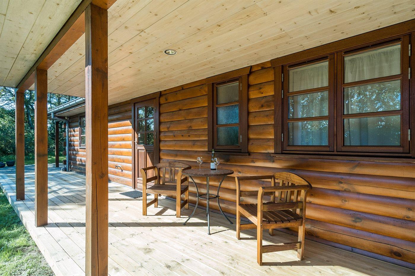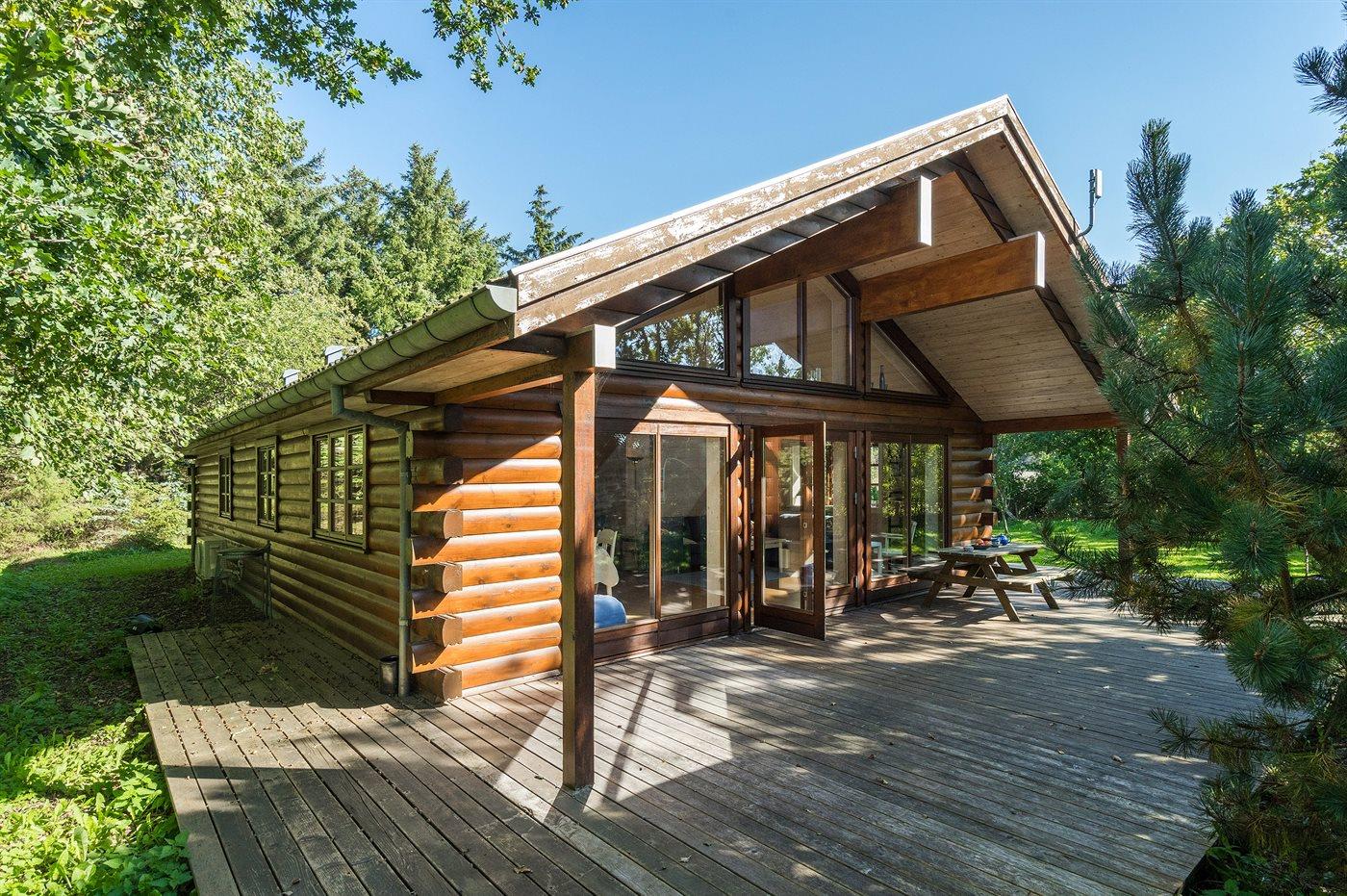 Skønt, lyst indrettet bjælkesommerhus med en rolig beliggenhed på en stor, lukket og ugenert grund med mange høje træer for enden af en blind vej.