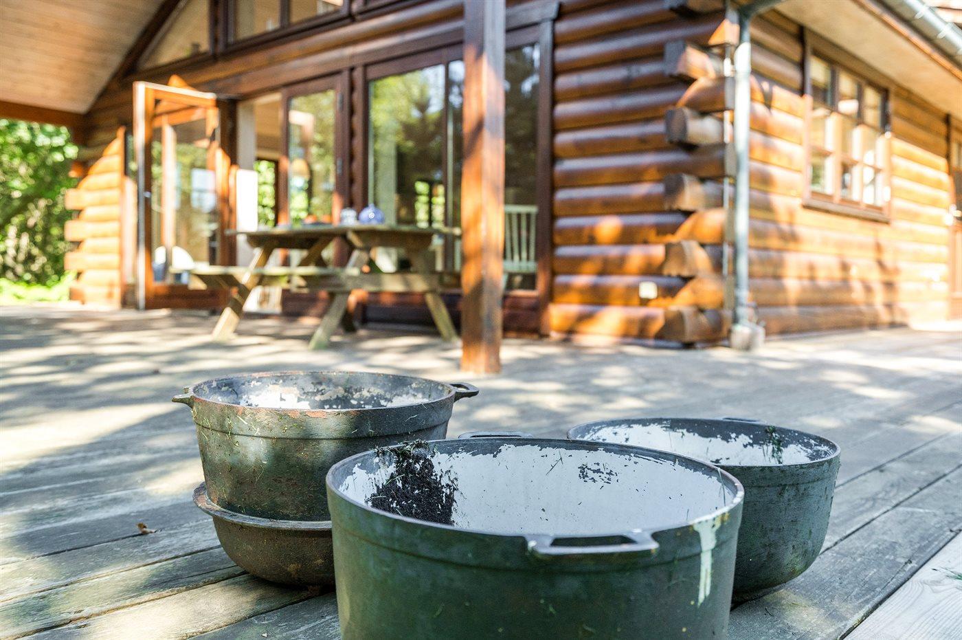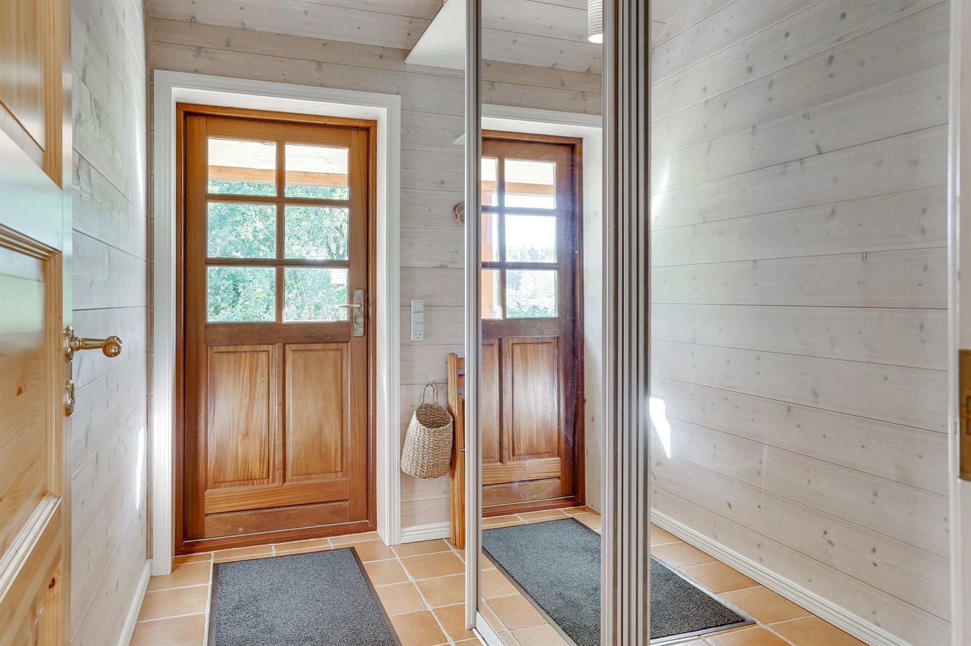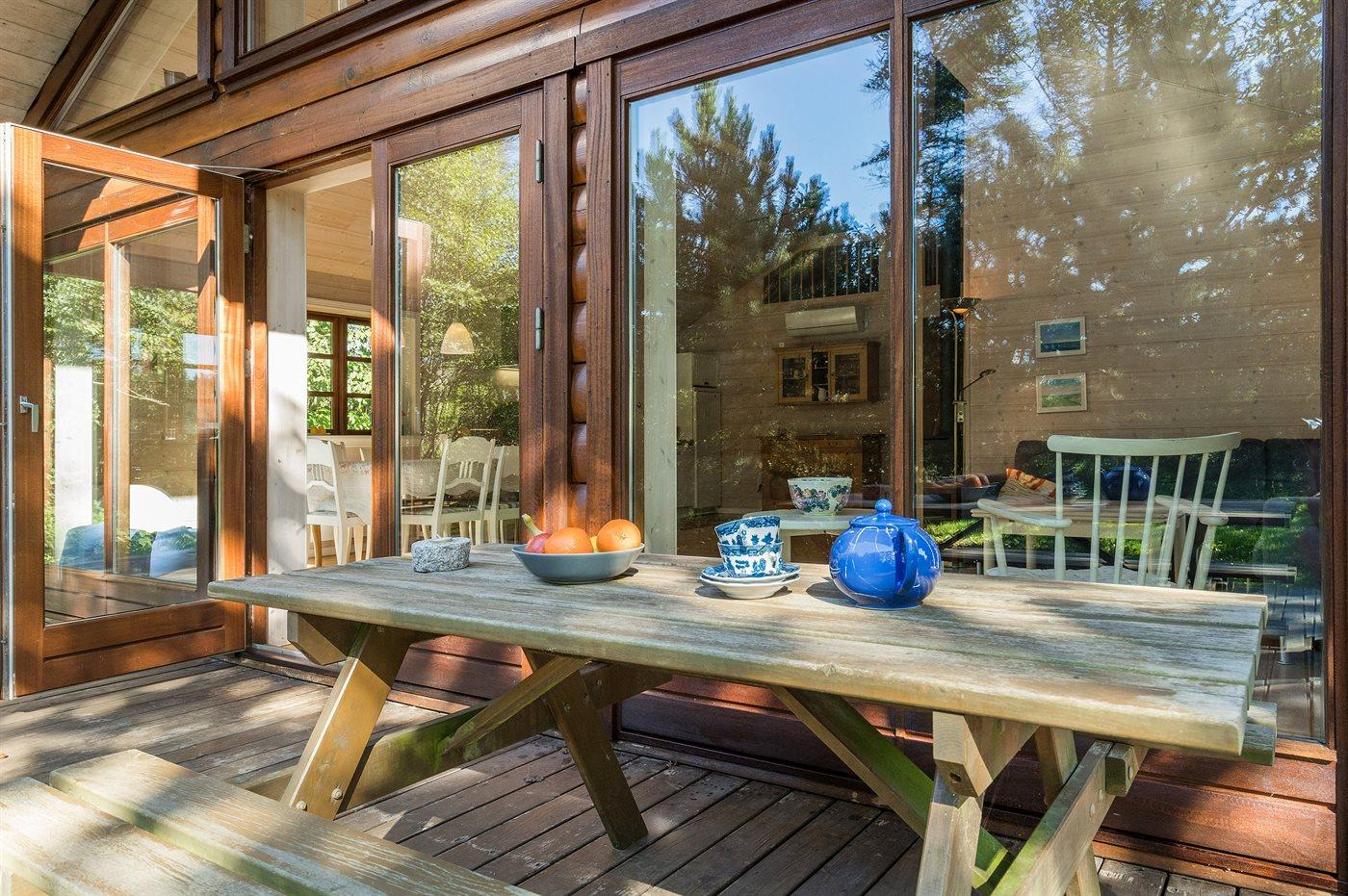 Skønt, lyst indrettet bjælkesommerhus med en rolig beliggenhed på en stor, lukket og ugenert grund med mange høje træer for enden af en blind vej.