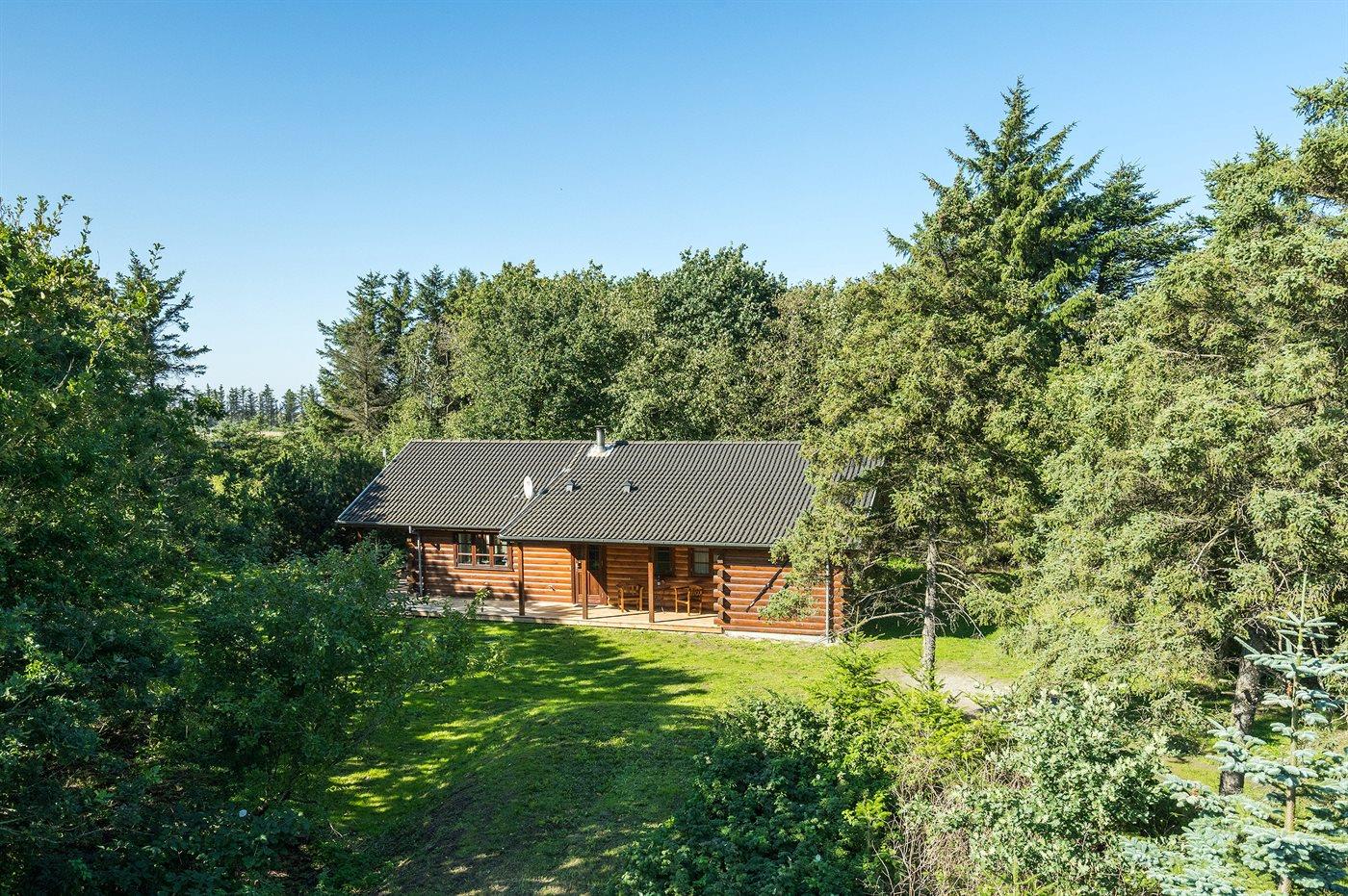 Lyst bjælkesommerhus i Løkken med rolig, ugenert beliggenhed på stor naturgrund nær havet.