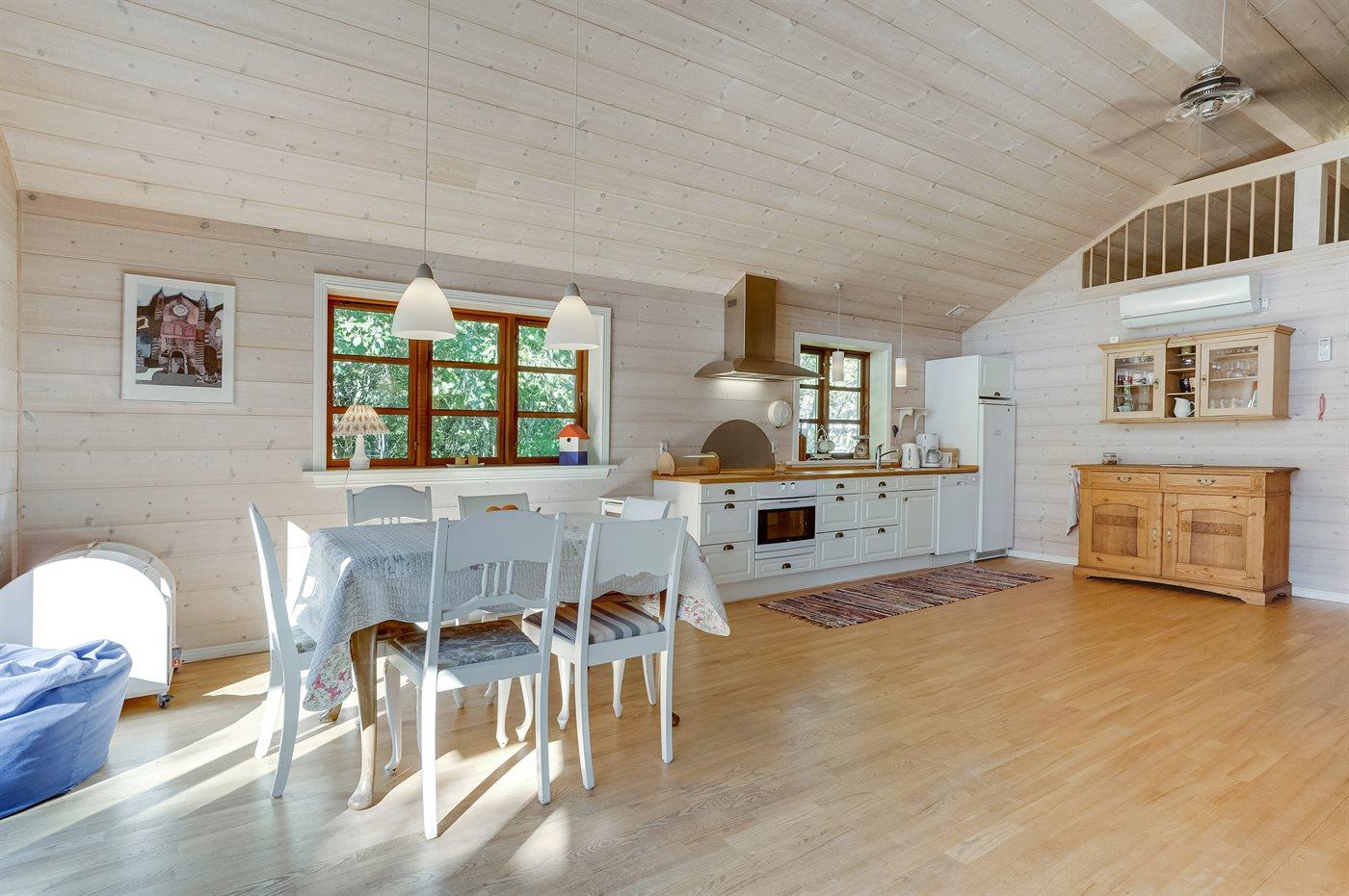 Køkkenet er udstyret med 1 køleskab. Der er 4 keramiske kogeplader, bageovn, mikrobølgeovn samt opvaskemaskine.