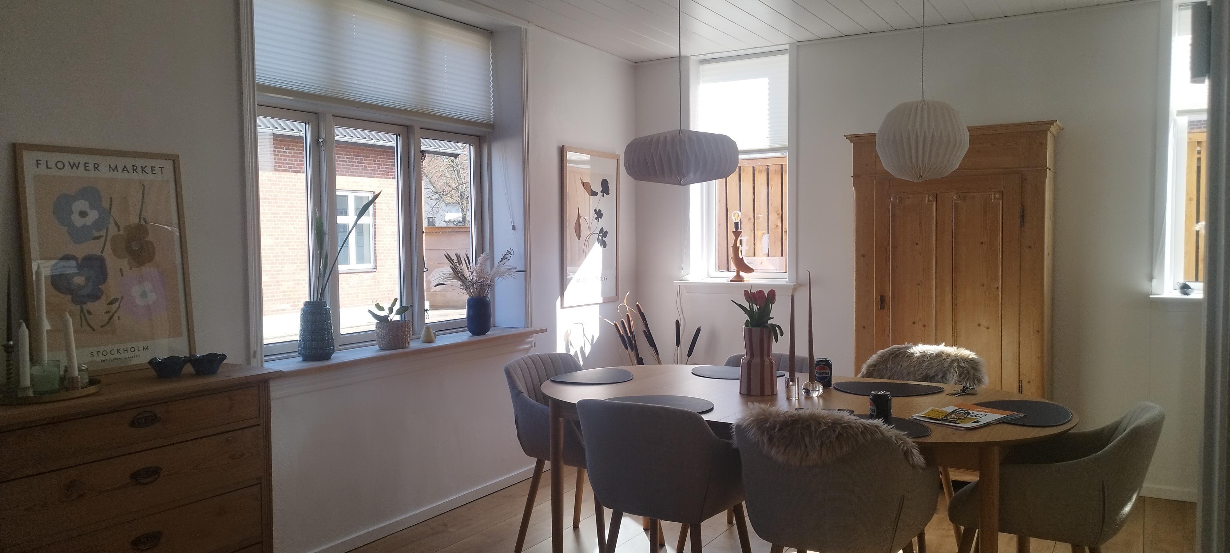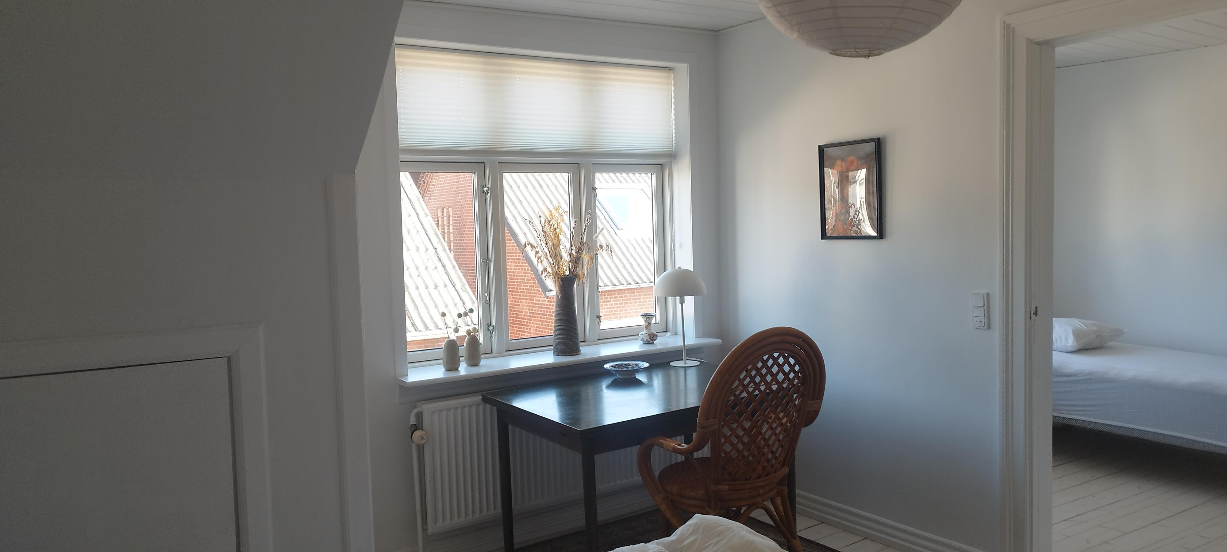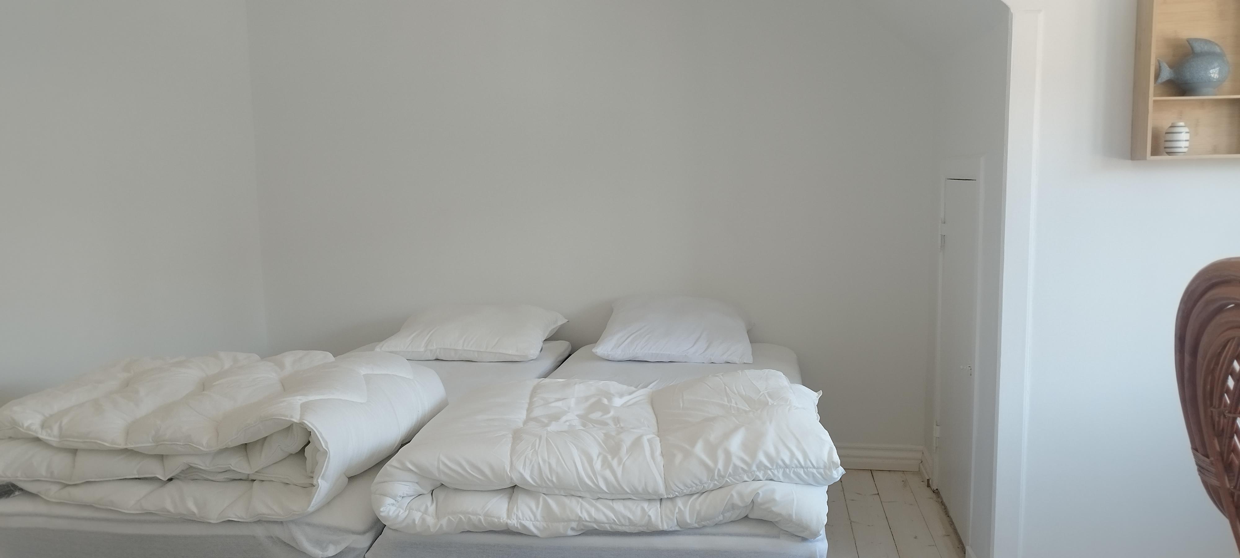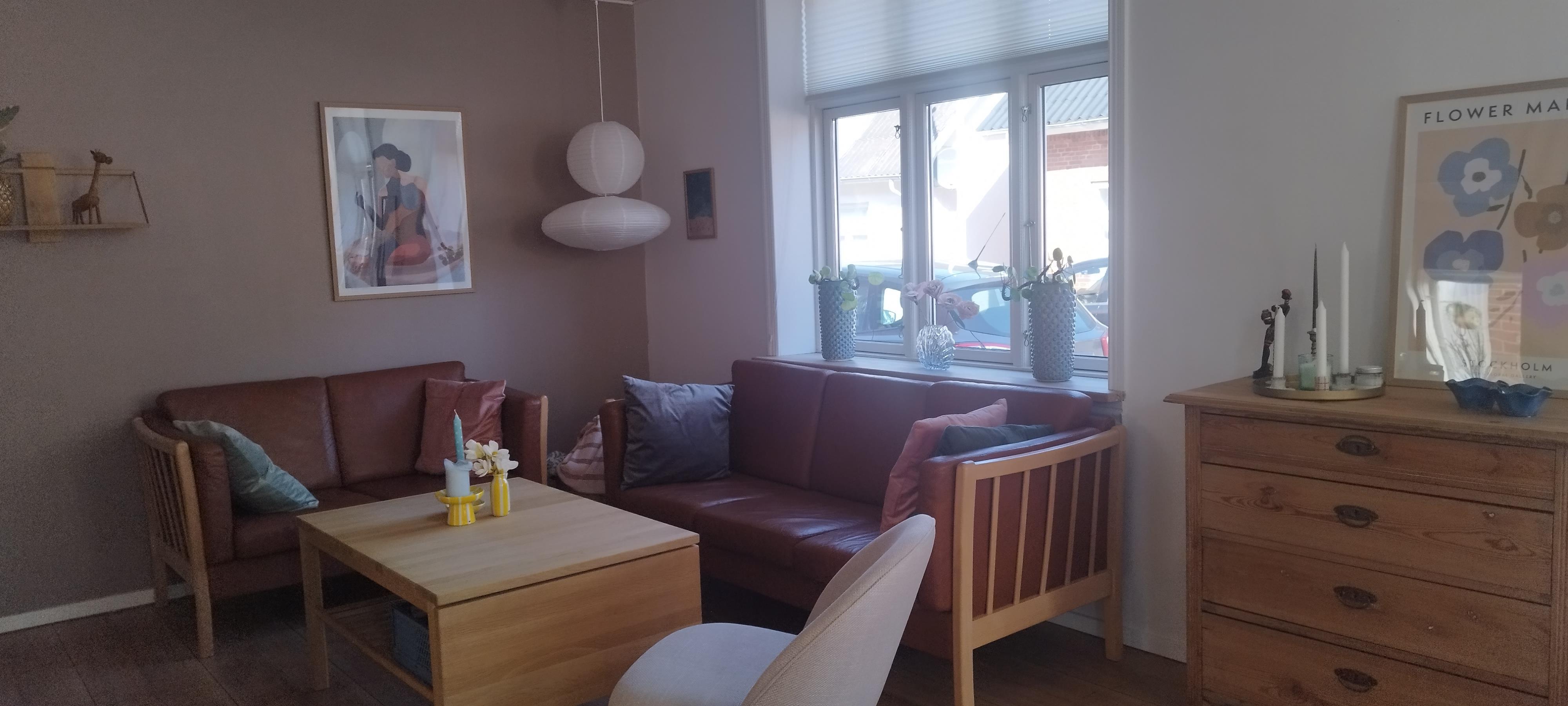 Dette charmerende byhus på 92 m² ligger tæt på Nykøbing Mors centrum og er ideelt til en afslappende ferie. Huset har tre værelser, hvoraf to ligger på første sal med hver to senge. For at komme til det andet værelse skal man gå igennem det første. Derudover er der et badeværelse, som kan tilgås både fra det bagerste værelse og fordelingsgangen. I stueetagen finder du det tredje værelse med to senge og udgang til en overdækket terrasse. Stuen er hyggelig med både sofagruppe og spiseafdeling, og køkkenet er fuldt udstyret med kaffemaskine, elkedel, brødrister og opvaskemaskine.