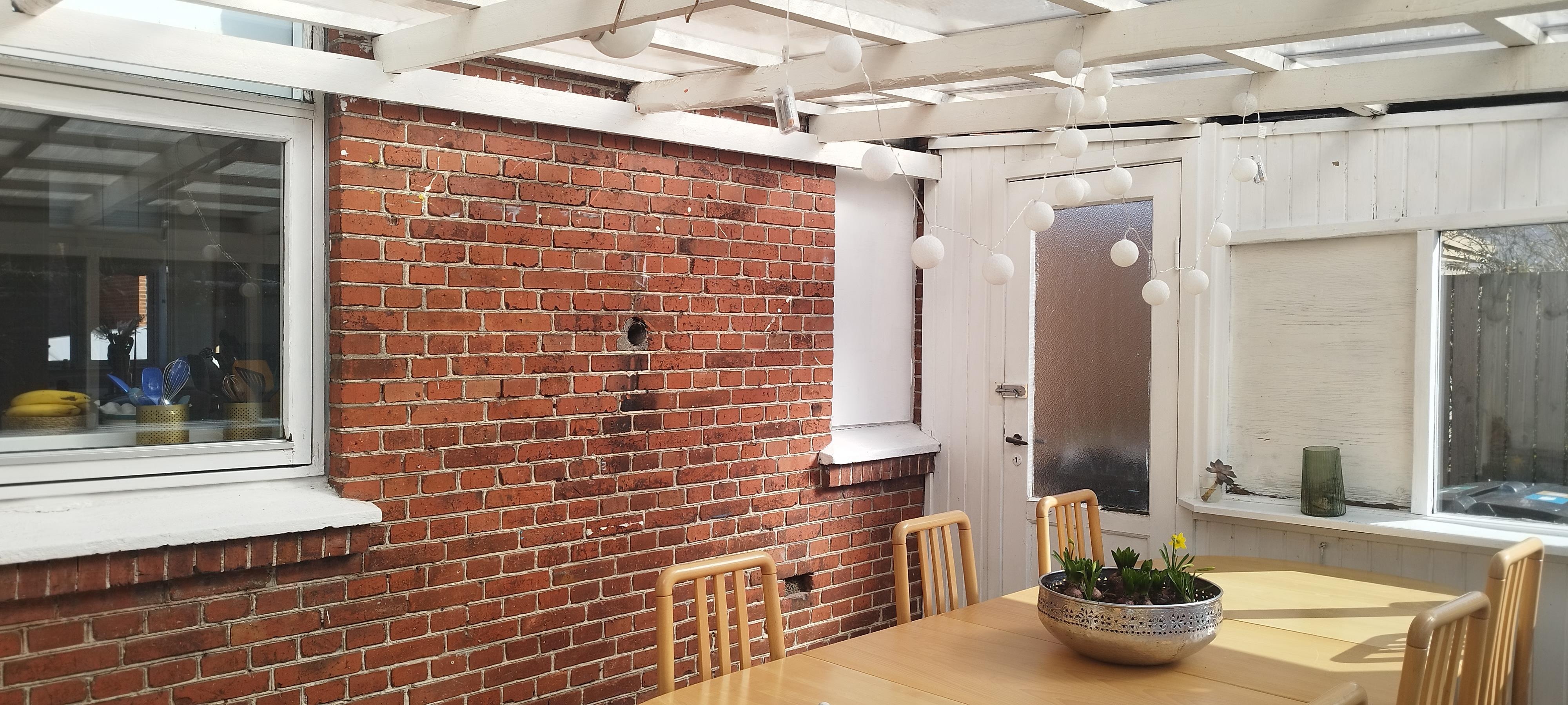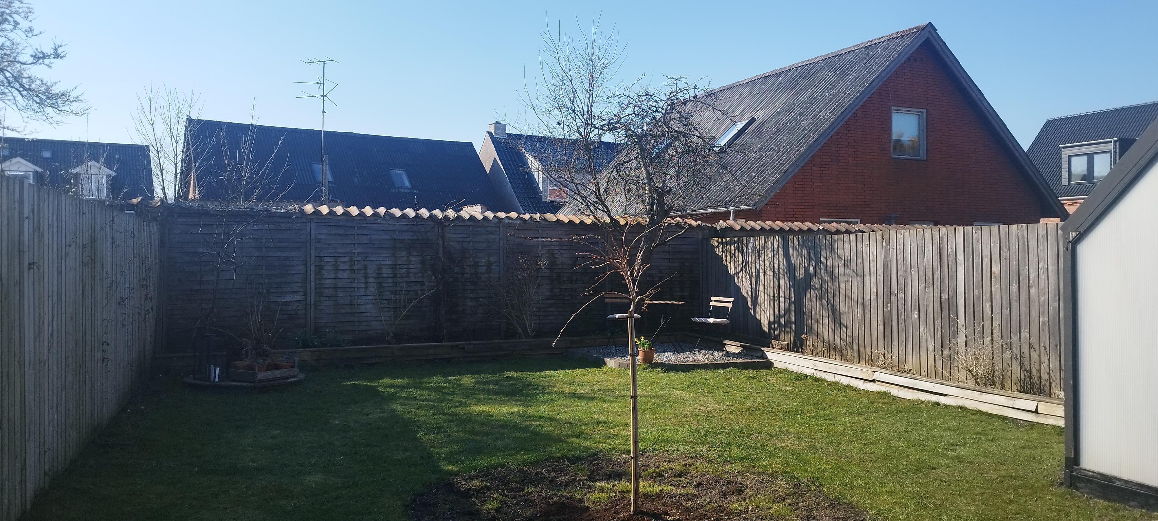 Bag huset er der en overdækket terrasse og en dejlig lille have med sofagruppe i den ene ende og en lille terrasse under et blommetræ i den anden ende. Parkering er tilgængelig foran huset på vejen.