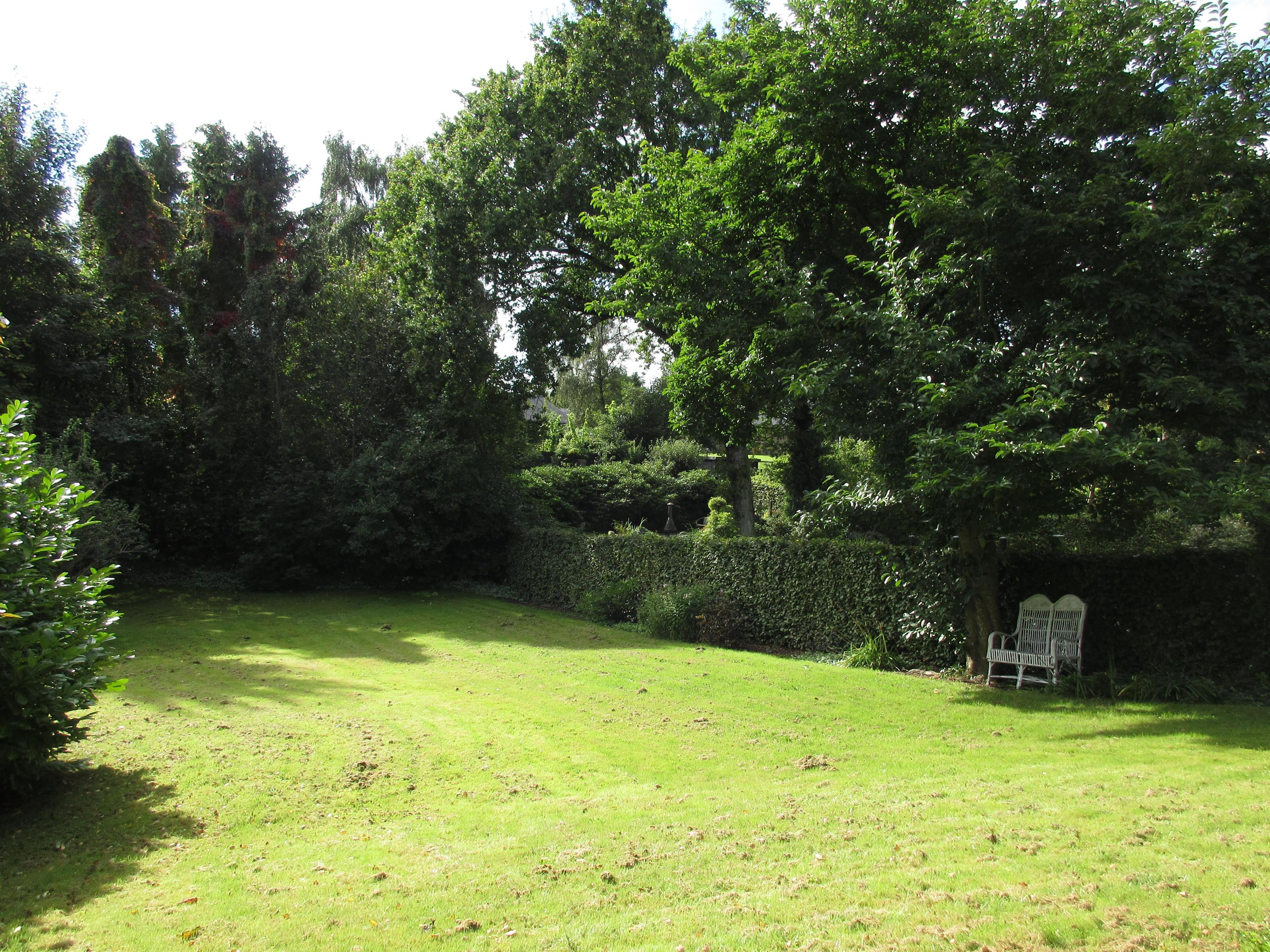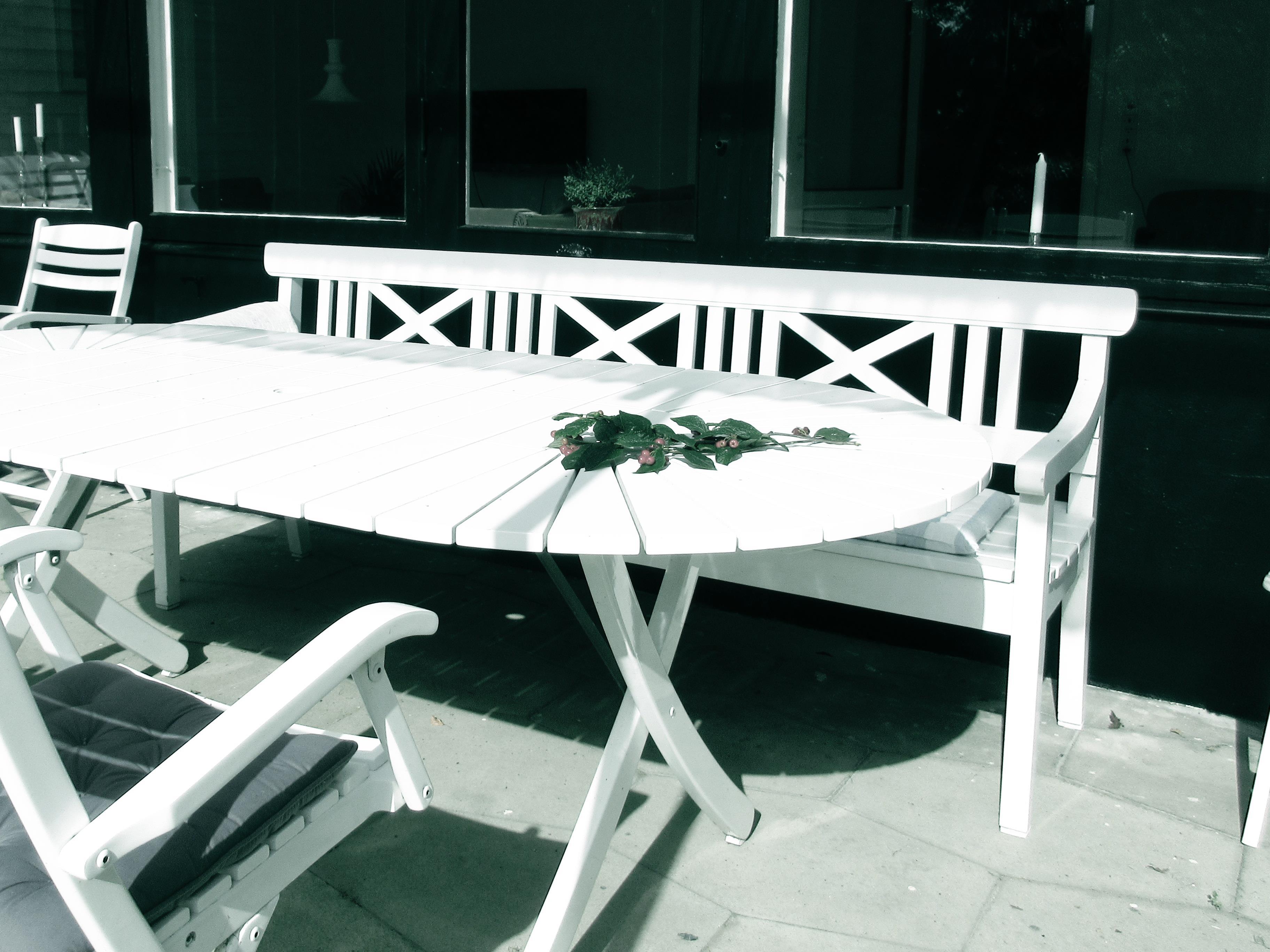 Stor dejlig lys opholdsstue og stor spisestue med udgang til overdækket terrasse med havemøbler og grill.