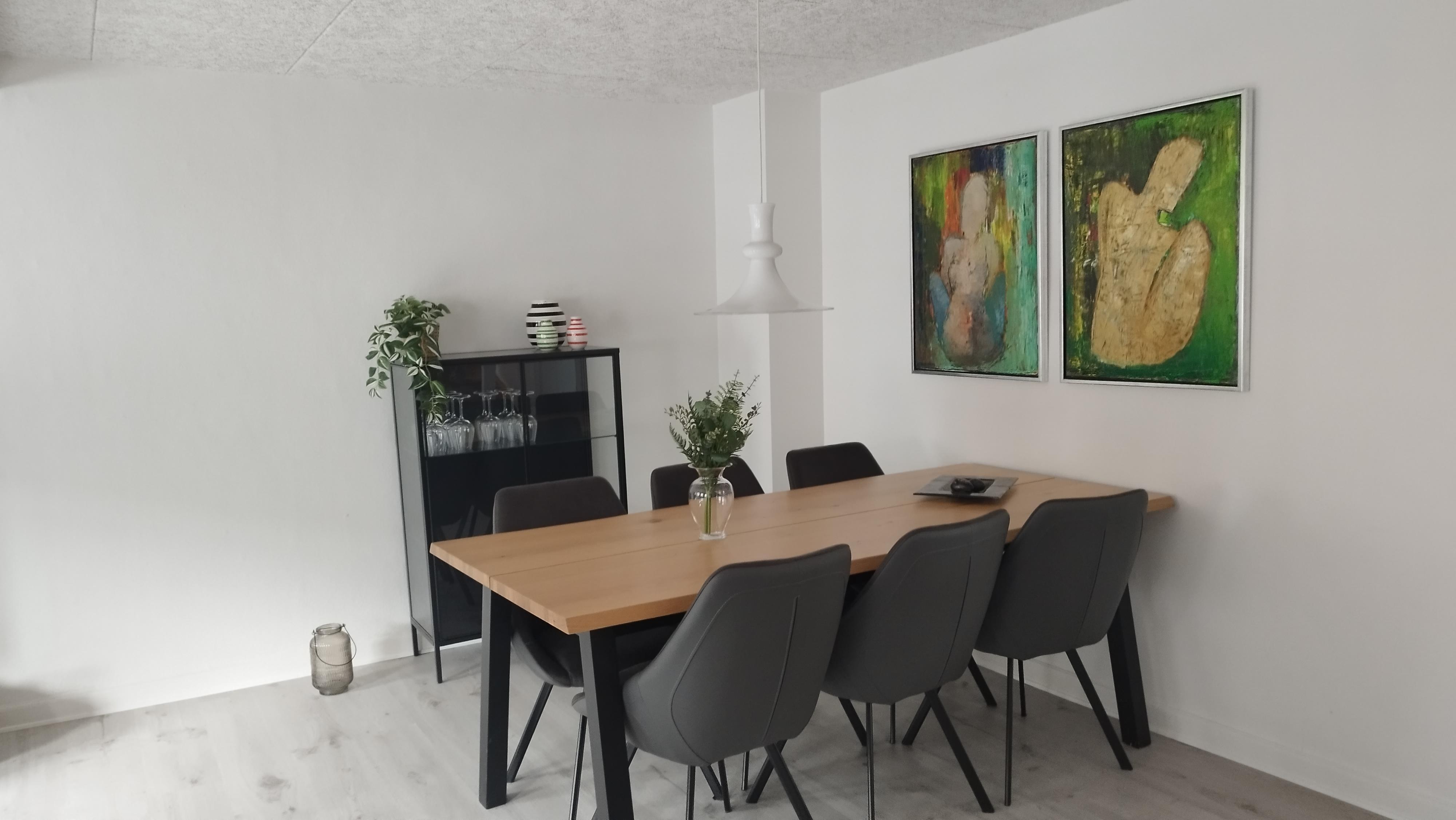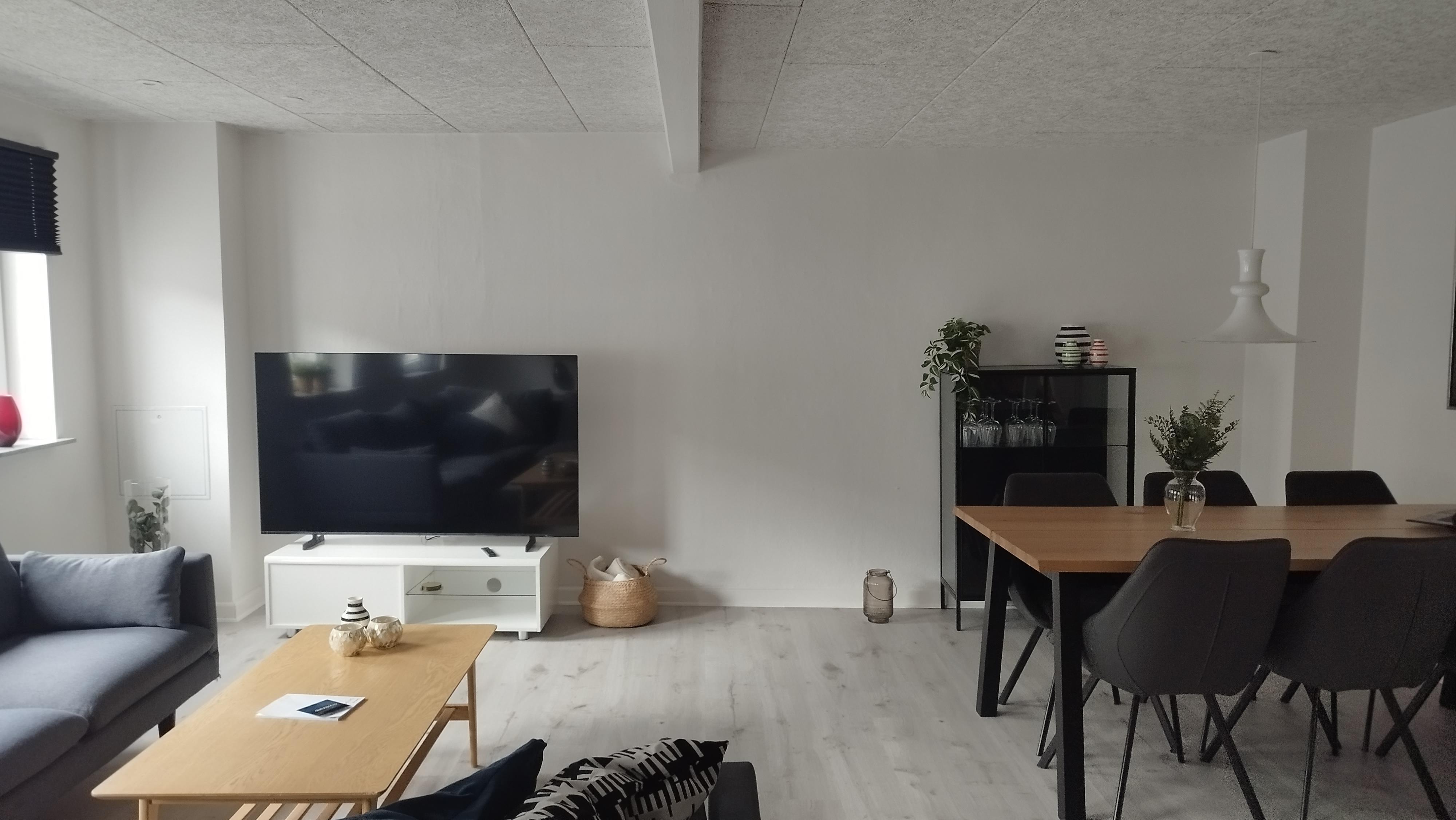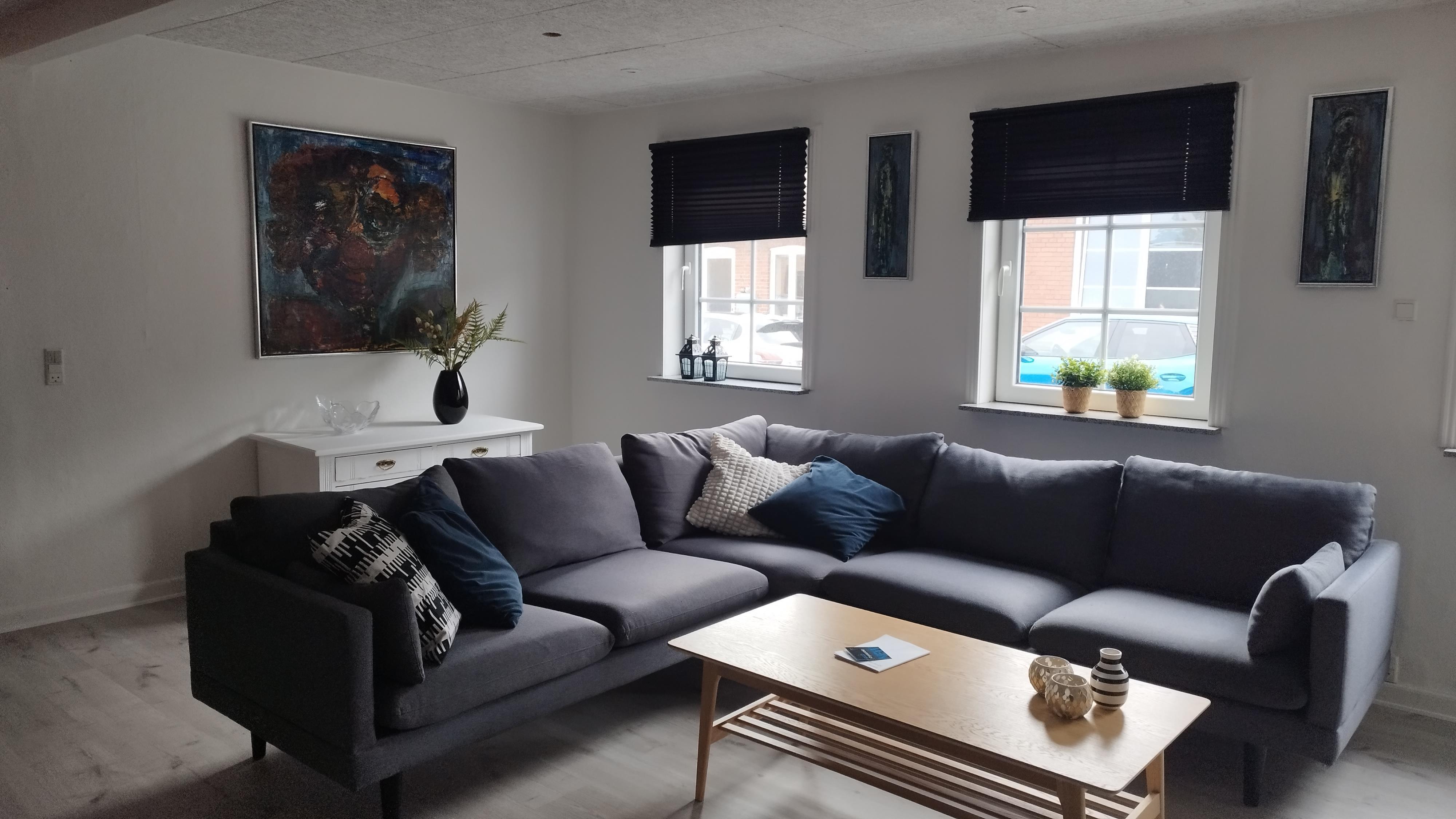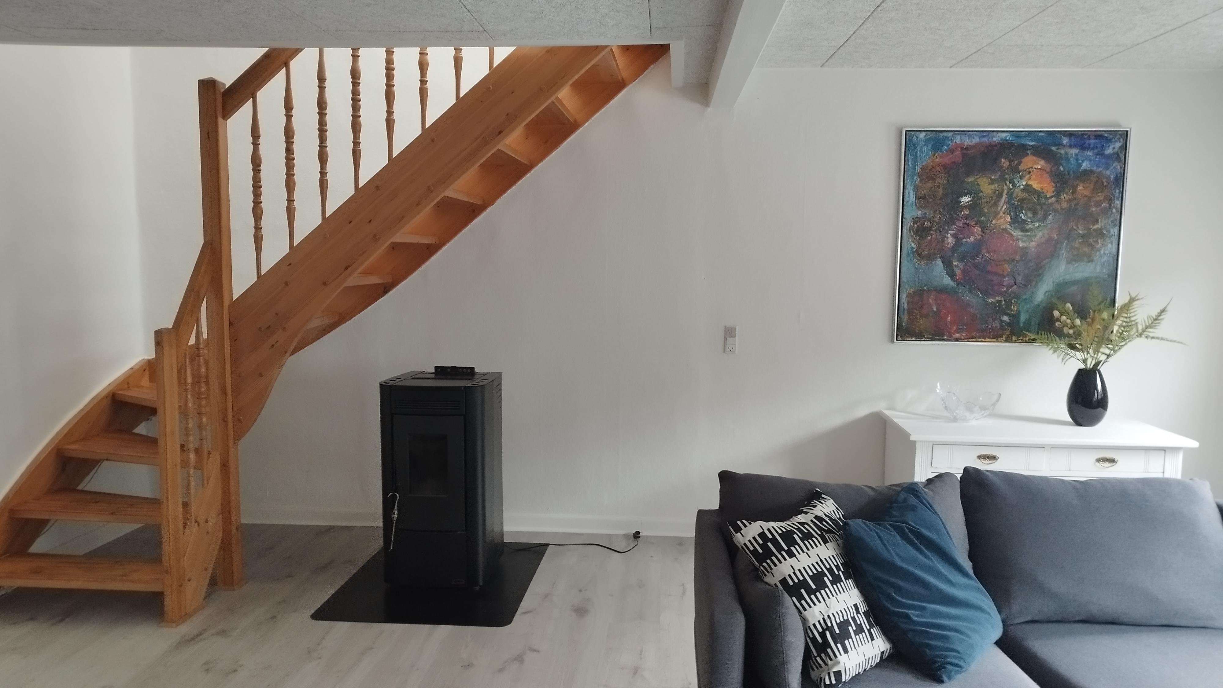 Stuen er møbleret med nye, tidssvarende møbler og har både Smart TV og WiFi, samt en effektiv pilleovn, der skaber en behagelig varme og hyggelig atmosfære. Huset fremstår som en velholdt og stilfuld bolig med respekt for den oprindelige charme.