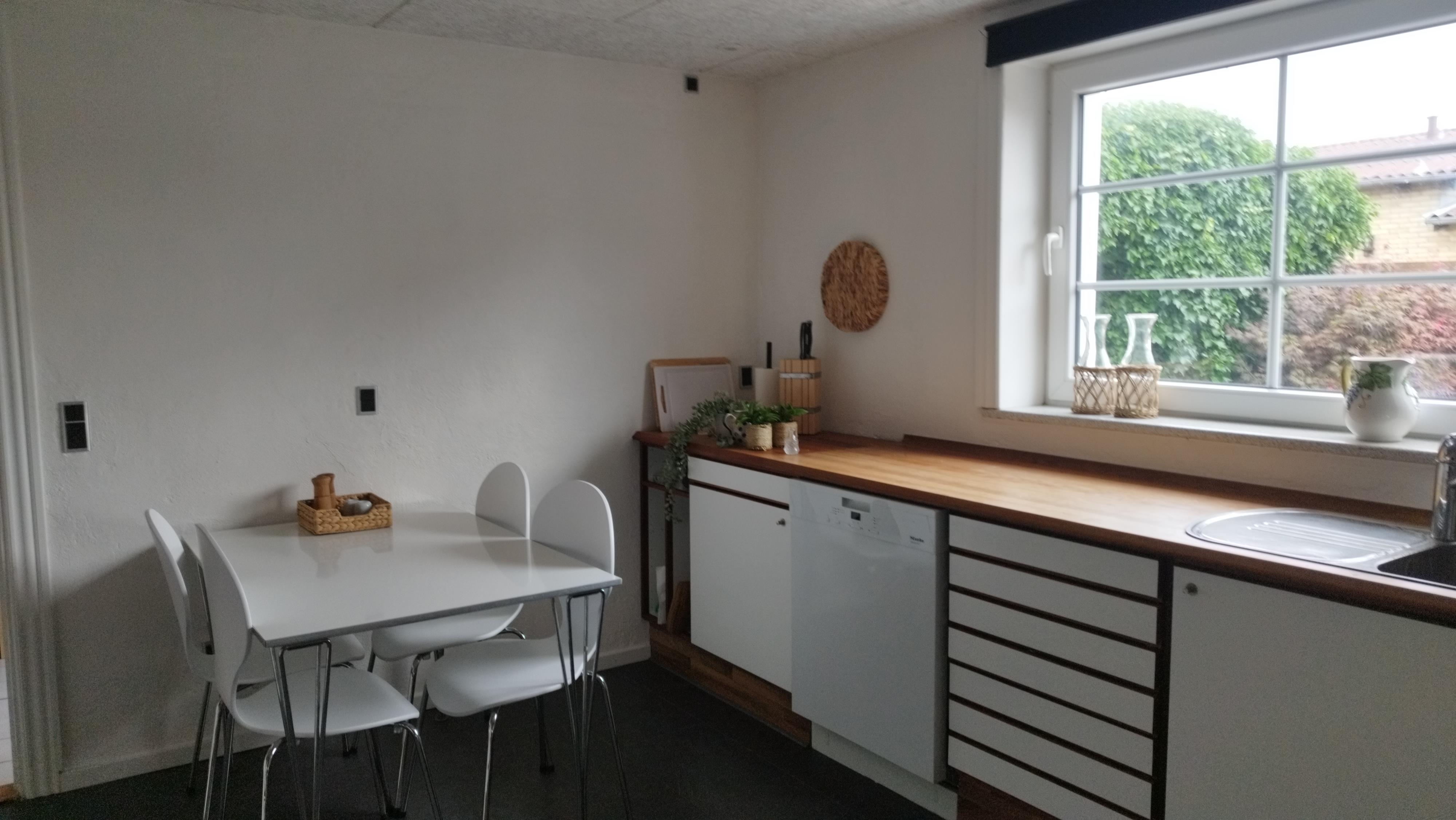 Indretningen byder på tre soveværelser med dobbeltsenge – to i stueetagen og ét på første sal. Det moderne køkken er fuldt udstyret med opvaskemaskine, køle-/fryseskab, kaffemaskine, mikroovn, elkedel og brødrister, så der er rig mulighed for at tilberede måltider hjemme. I entreen findes både vaskemaskine og tørretumbler, hvilket gør huset velegnet til længere ophold.