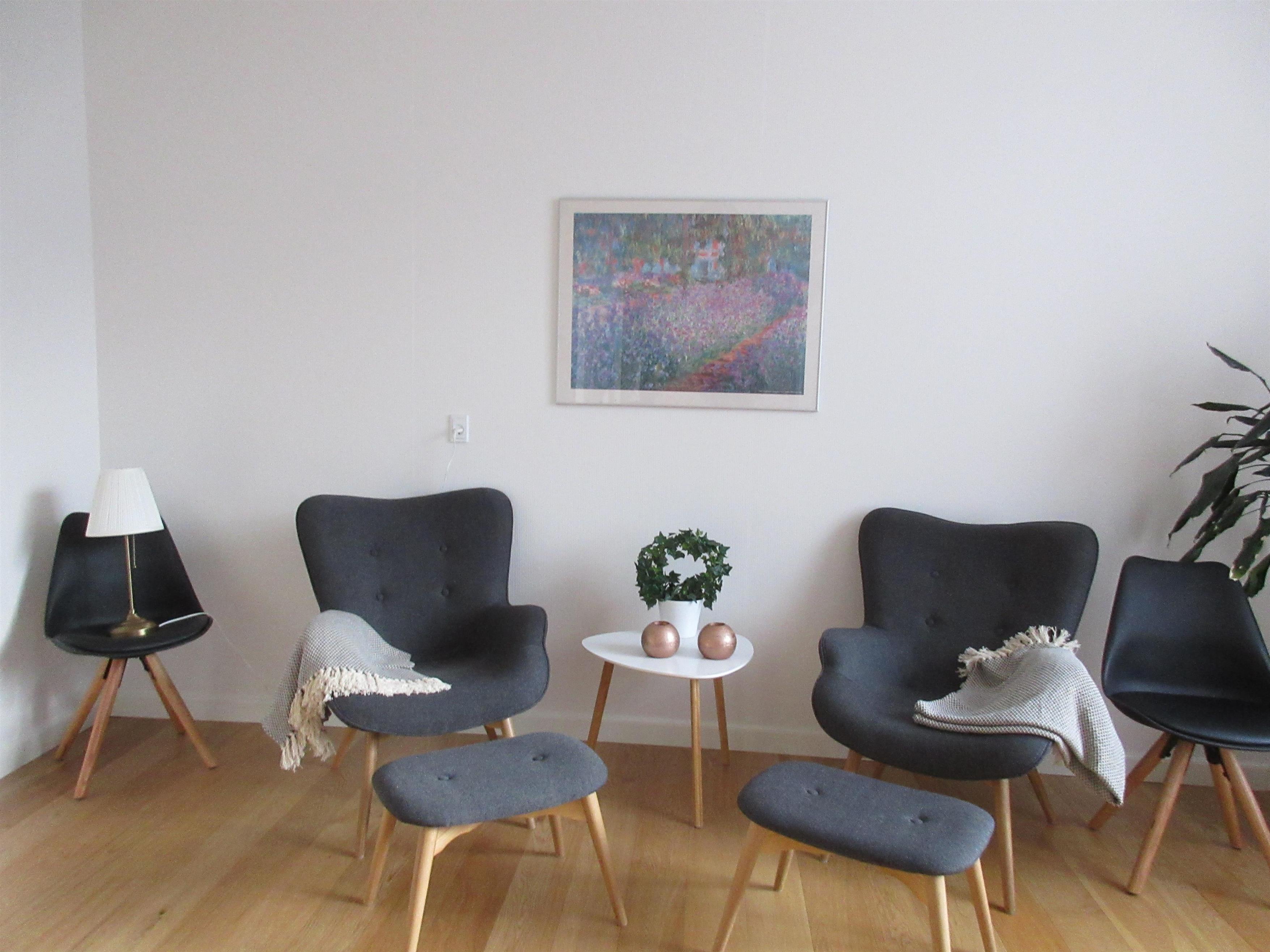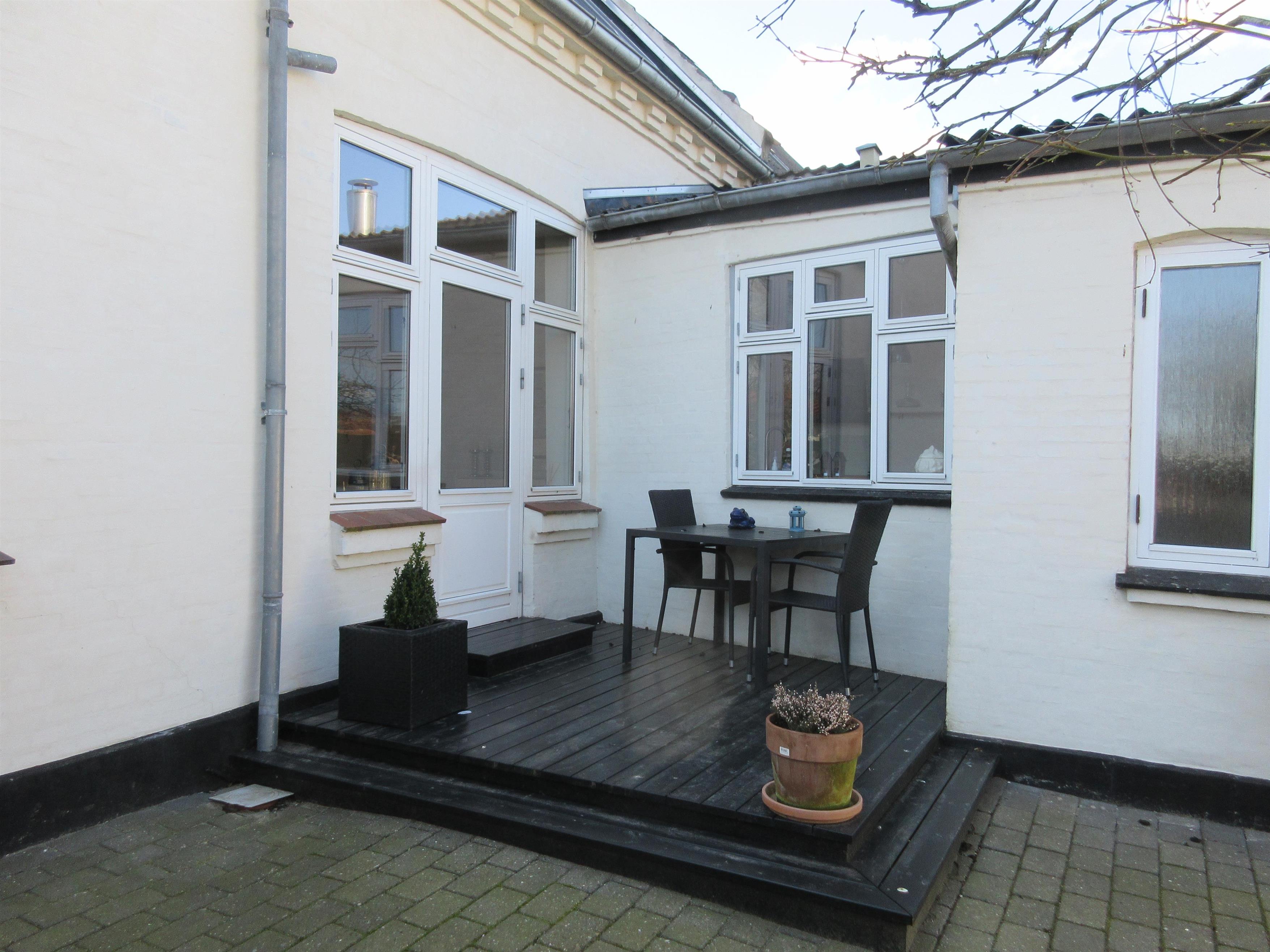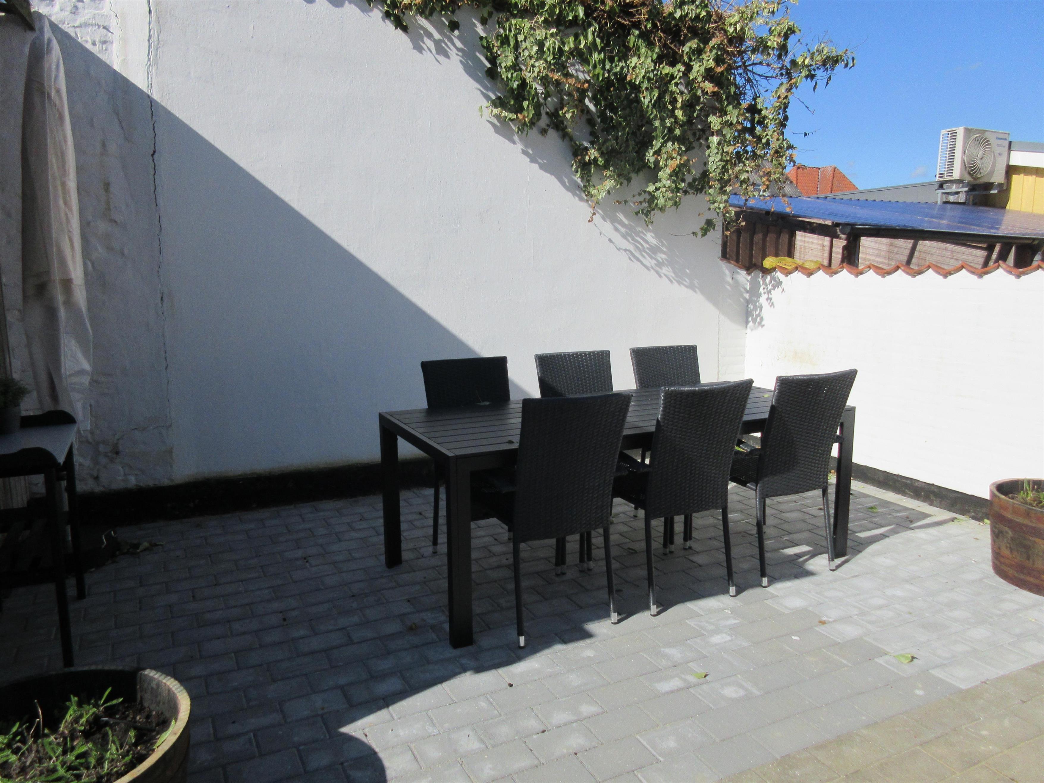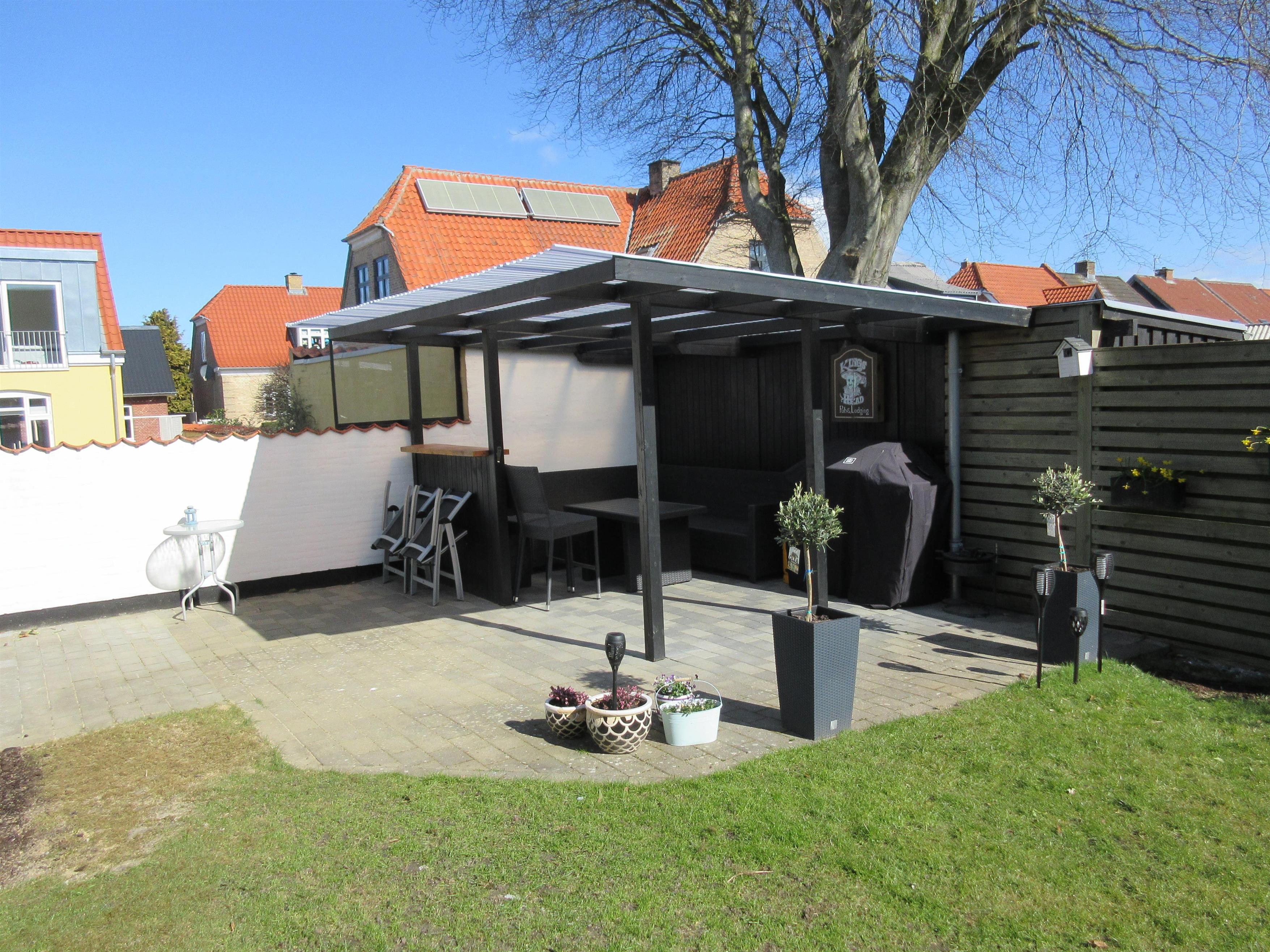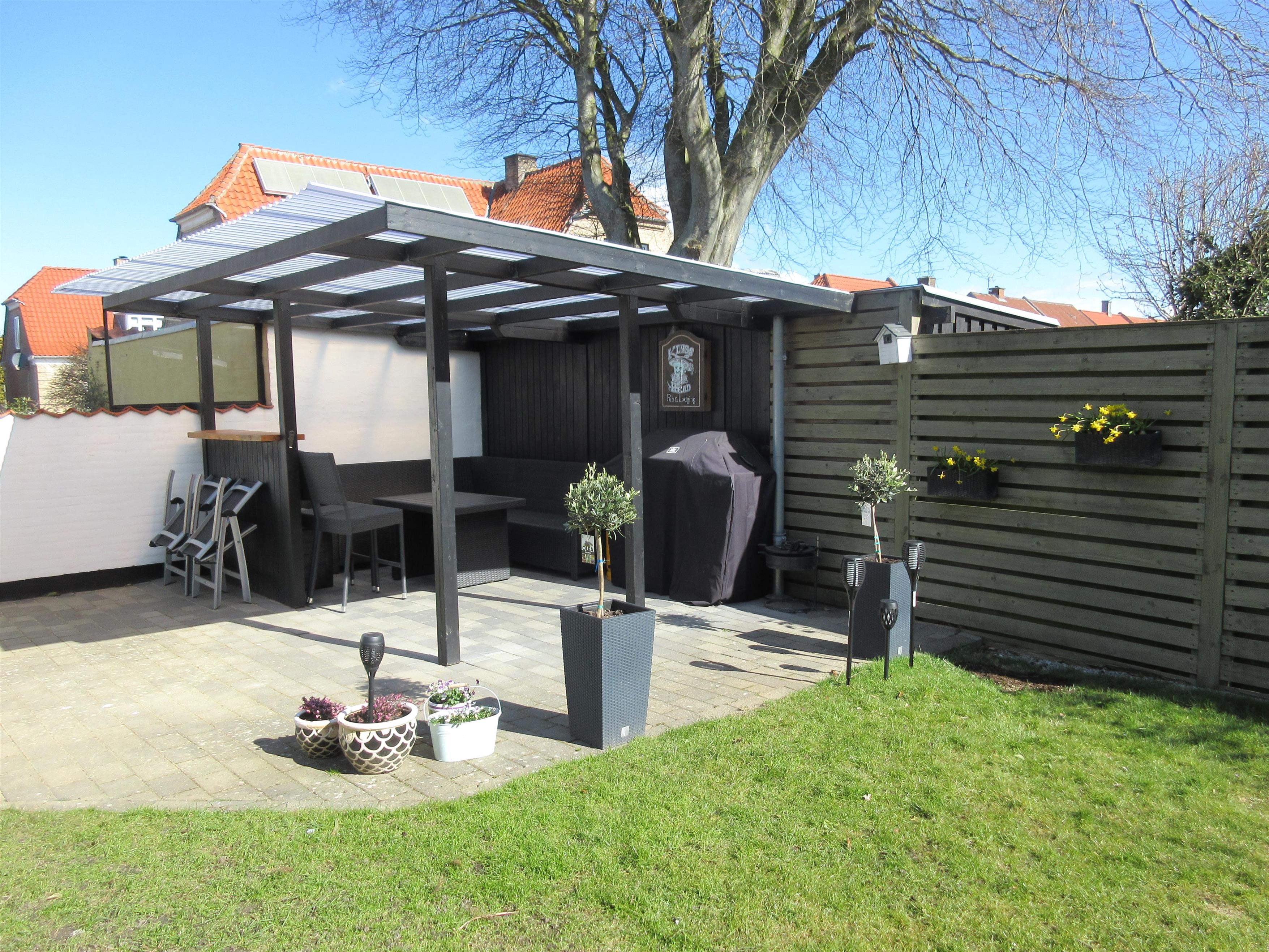 Skøn gårdhave med overdækket terrasse og et lille stykke græs.