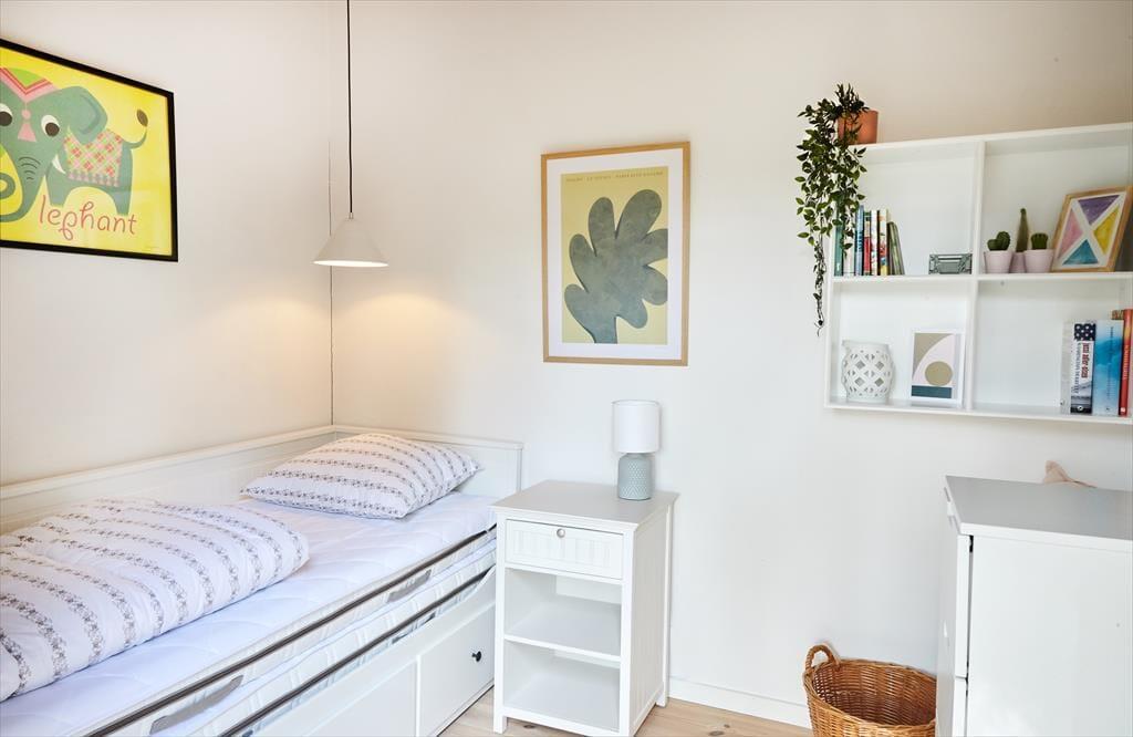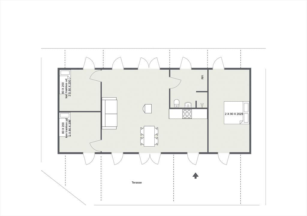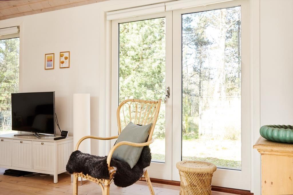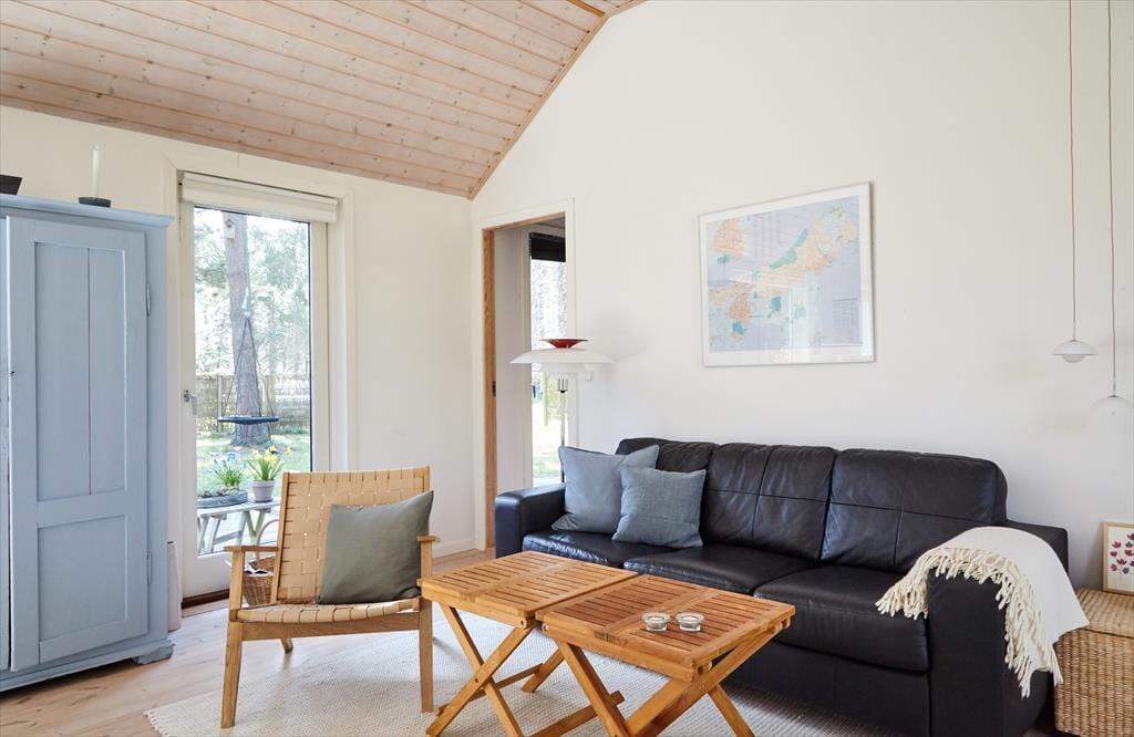 Her kan ferien nydes i et lyst og indbydende sommerhus. Med højt til loftet er der en rummelighed i huset, men uden at sommerhusstemningen og nærværet mistes. Der er masser af lysindfald i alle rum fra de mange udgangsdøre til terrasse. Køkkenet er i åben forbindelse med stuen, så står du for madlavningen kan du stadig være en del af fællesskabet. Når aftenen falder på i en kølig aftenstund, så kan der tændes op i brændeovnen og hygges rundt om sofabordet med en kop varm kakao, og måske endda med friskbagte boller.