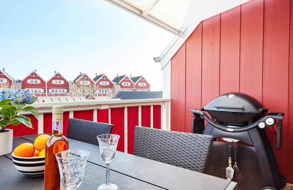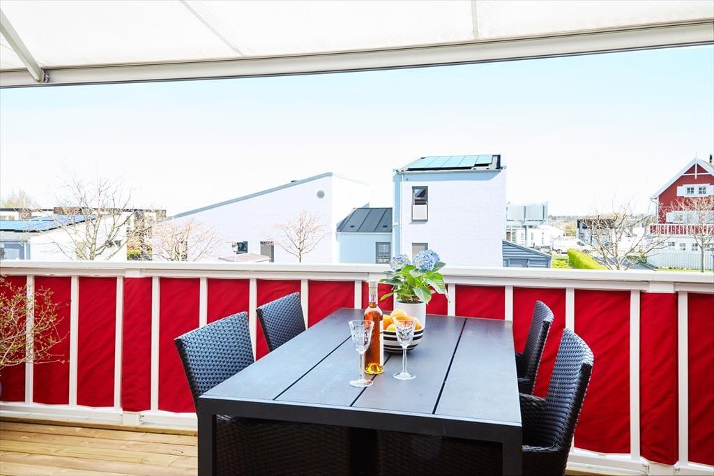 Lejligheden ligger på 1. sal, der er udgang til både en østvendt og en vestvendt terrasse samt balkon. Så her er alle muligheder for at nyde solen fra morgen til aften. I den skønne stue kan du fordybe dig i en god bog eller I kan tage jer et spil kort. Lejligheden har et stort, smukt og veludstyret Køkken med alle bekvemmeligheder. Der er to dejlige badeværelser. Bryggers med både tørretumbler og vaskemaskine samt to dejlige soveværelser med dobbelt senge og god skabsplads. Stor tv-pakke og internet.