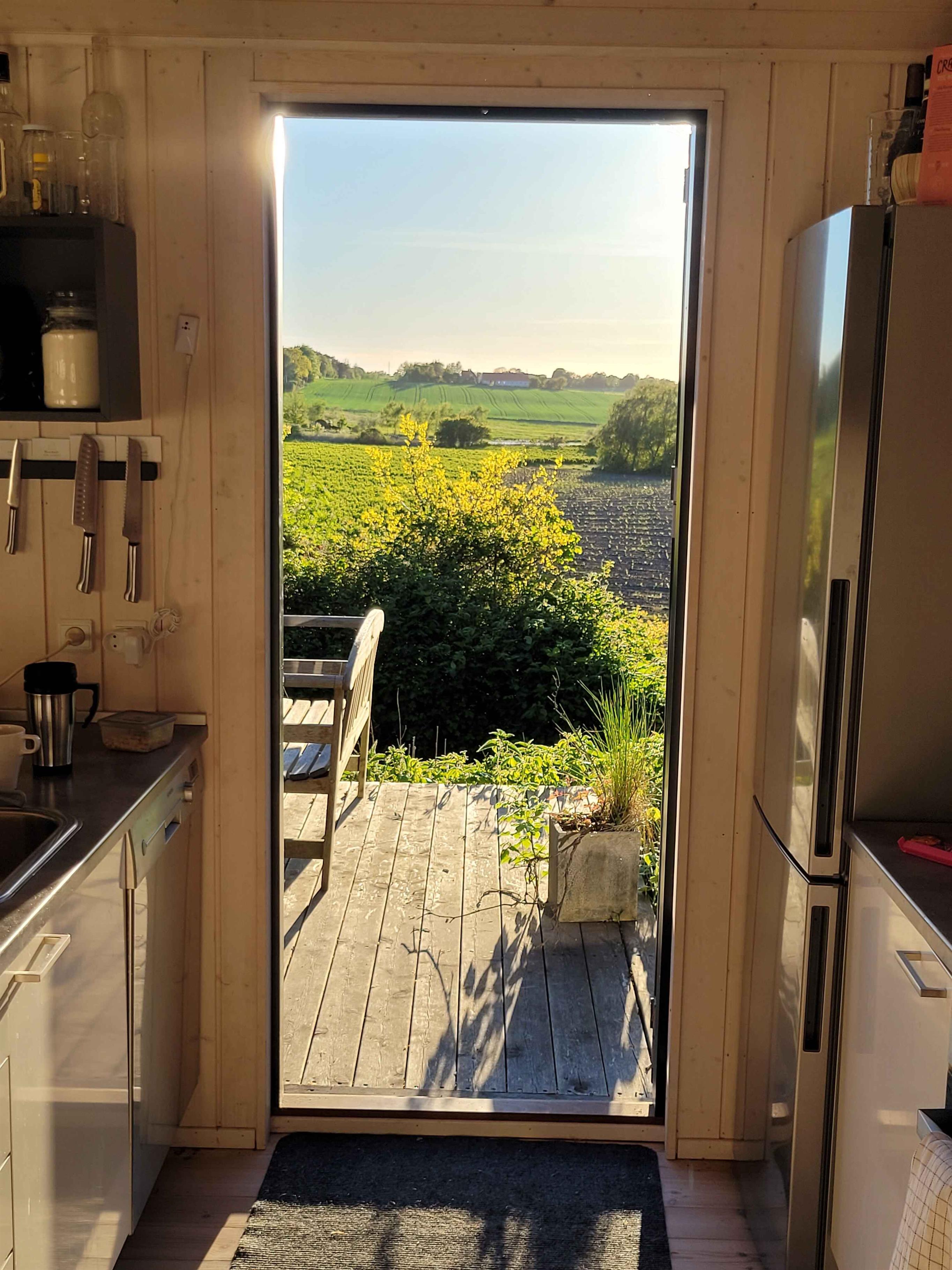 Sommerhuset ligger på en bakke med direkte udsigt over det kuperede landskab. Her føler man virkelig at man er kommet på landet. Huset er kun 4 år gammelt og alt fremstår helt nyt. Der er 7 minutters gang til skov og strand og 1 km til indkøb.
