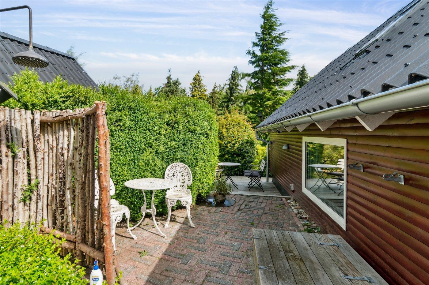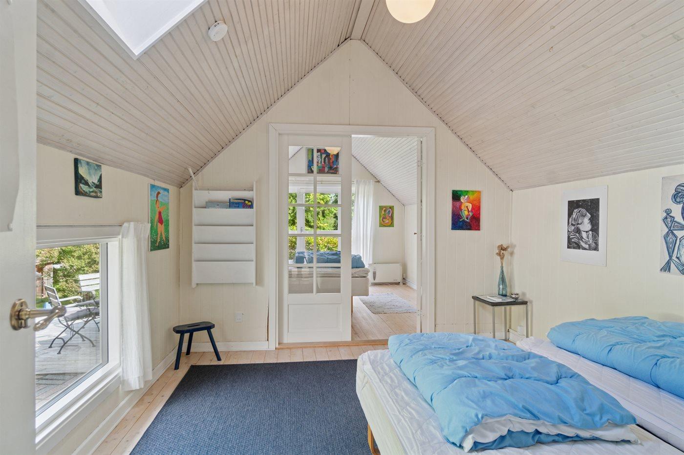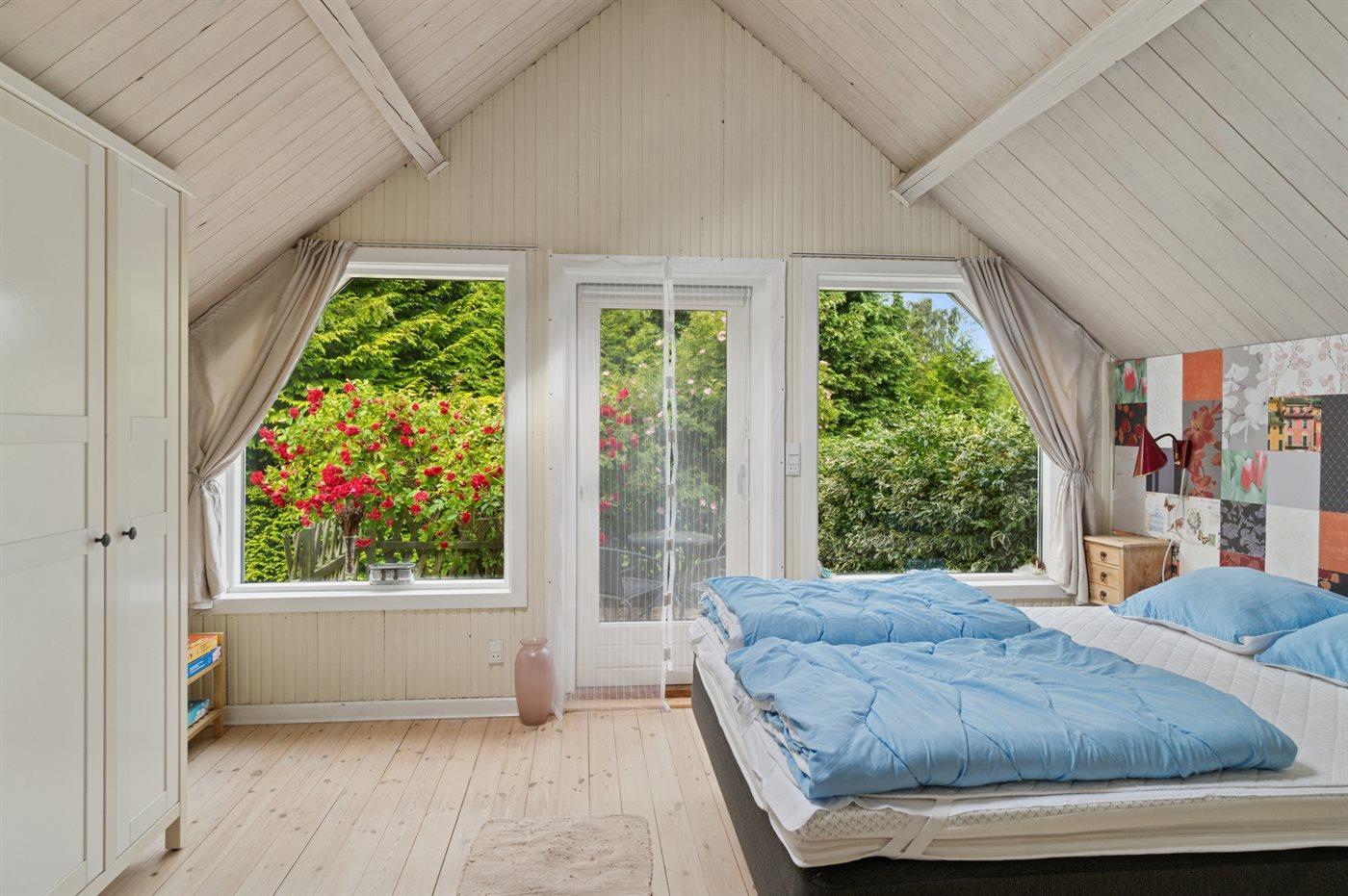 Huset indeholder et dejligt køkkenalrum i forbindelse med stuen, hvorfra udsigten over haven og trætoppene kan nydes. Rundt om huset er flere små hyggekroge, som indbyder til afslapning, og det overdækkede terrasseområde giver god mulighed for at finde skygge og læ og nyde de lange lyse sommeraftener.