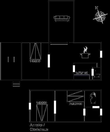 I hovedhuset er der 1 soveværelse med dobbeltseng. Der er desuden 1 soveplads i køjeseng (på grund af sengemålene på 70x185 cm. er denne soveplads bedst egnet til børn og unge). I det store anneks er der 2 soveværelser, hvor der i det ene soveværelse er en dobbeltseng, og i det andet er 2 enkeltsenge, som kan stilles sammen til den dobbeltseng. Der er separate indgange til de 2 soveværelser i annekset, dørene kan lukkes mellem de 2 soveværelser, og der kan rulles for med rullegardiner.