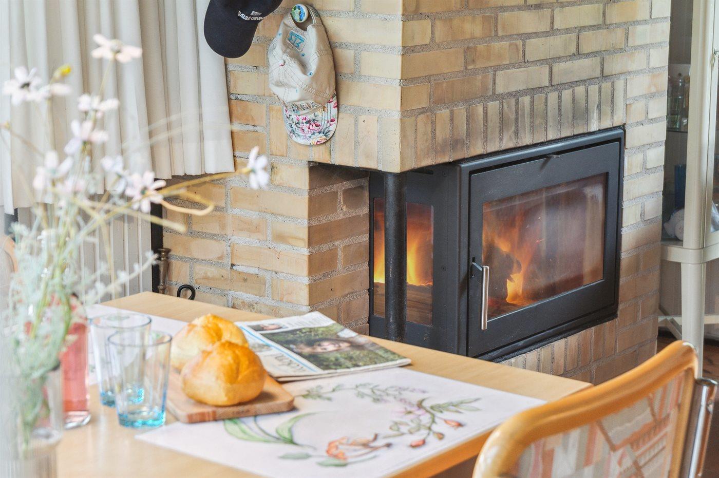 Huset opvarmes energivenligt med luft-til-luft varmepumpe og til at sørge for hyggen er der brændeovn.