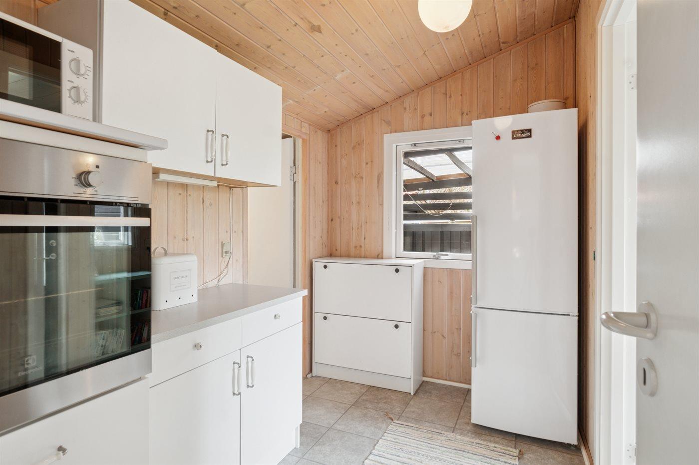 Køkkenet er udstyret med 1 køleskab. Der er 4 keramiske kogeplader, varmluftovn, mikrobølgeovn samt opvaskemaskine.