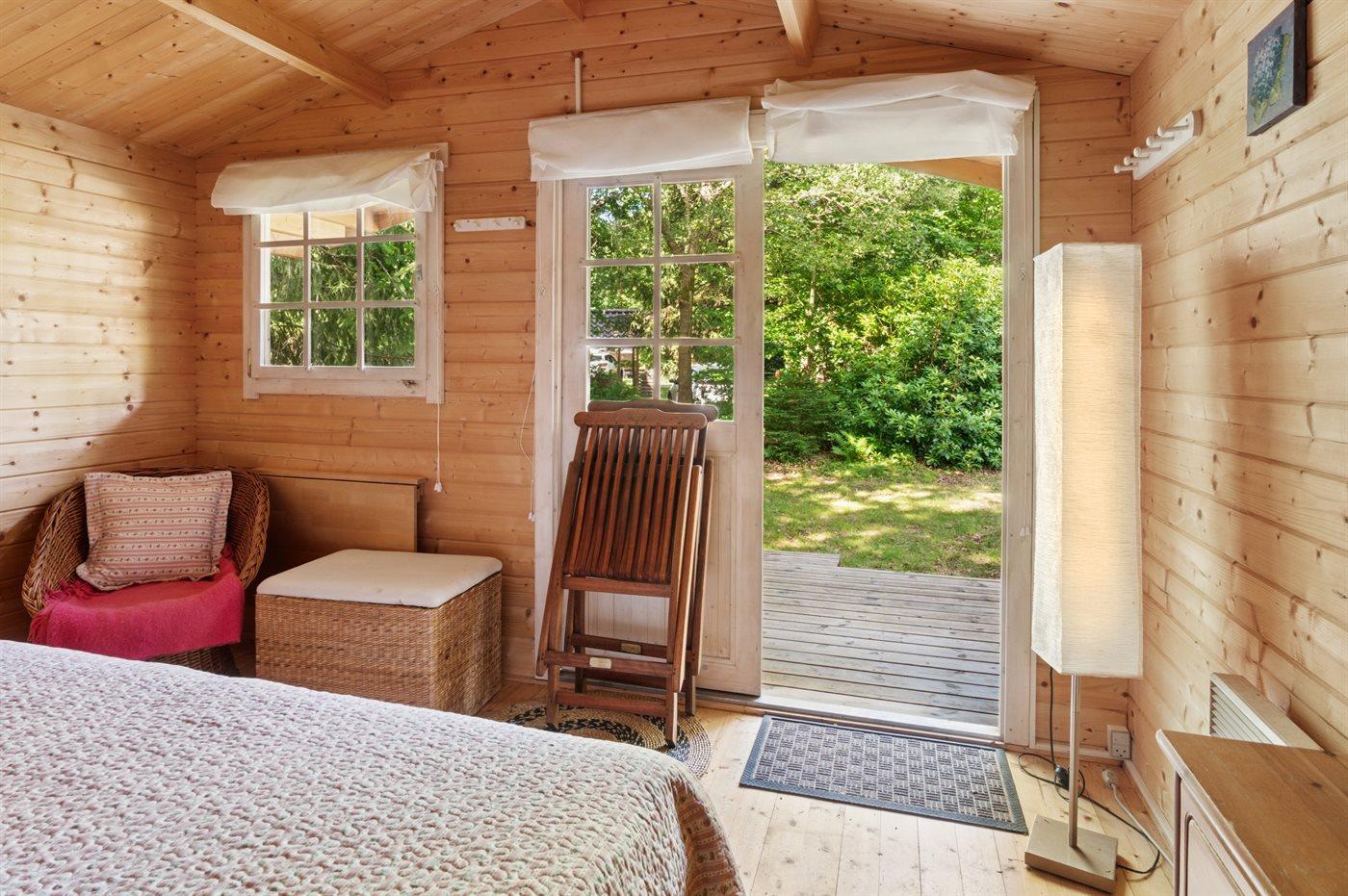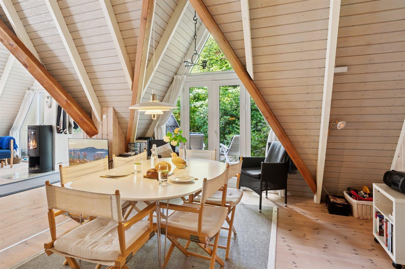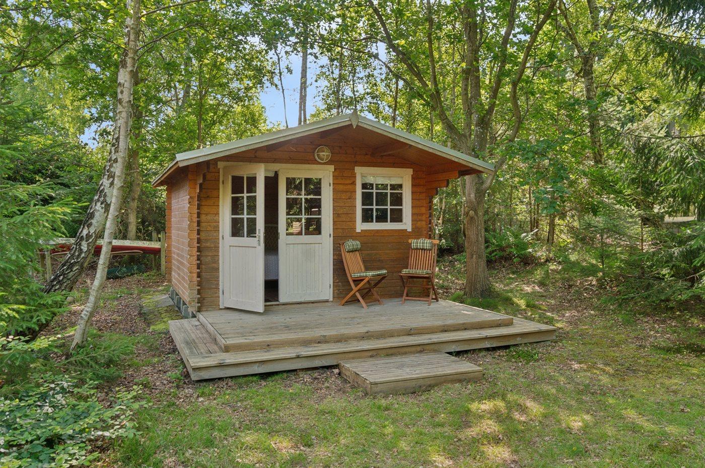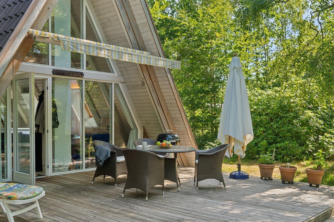 Huset er beliggende i et roligt sommerhusområde og ligger ugenert omgivet af beplantning og høje træer.