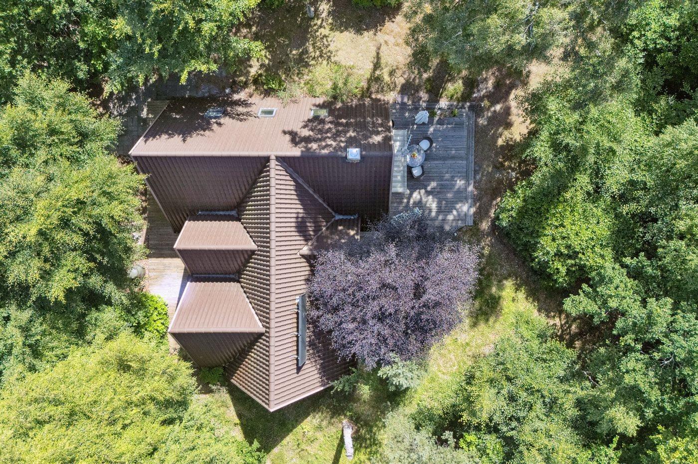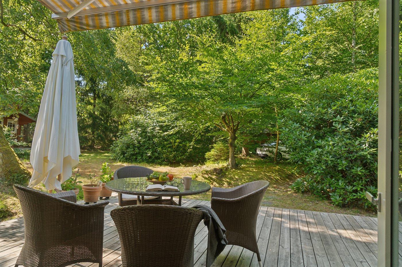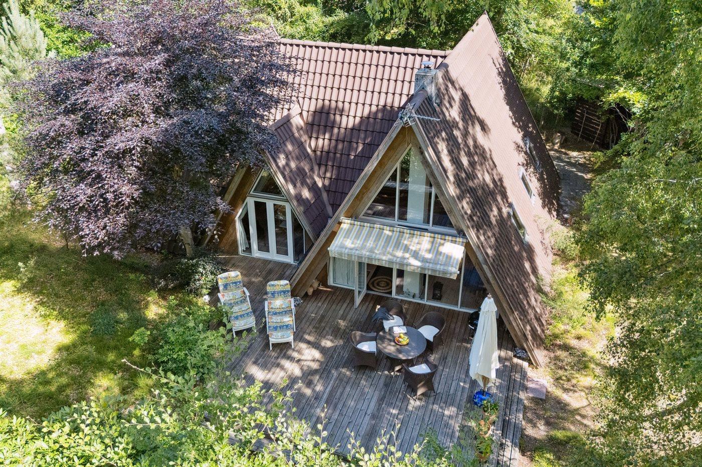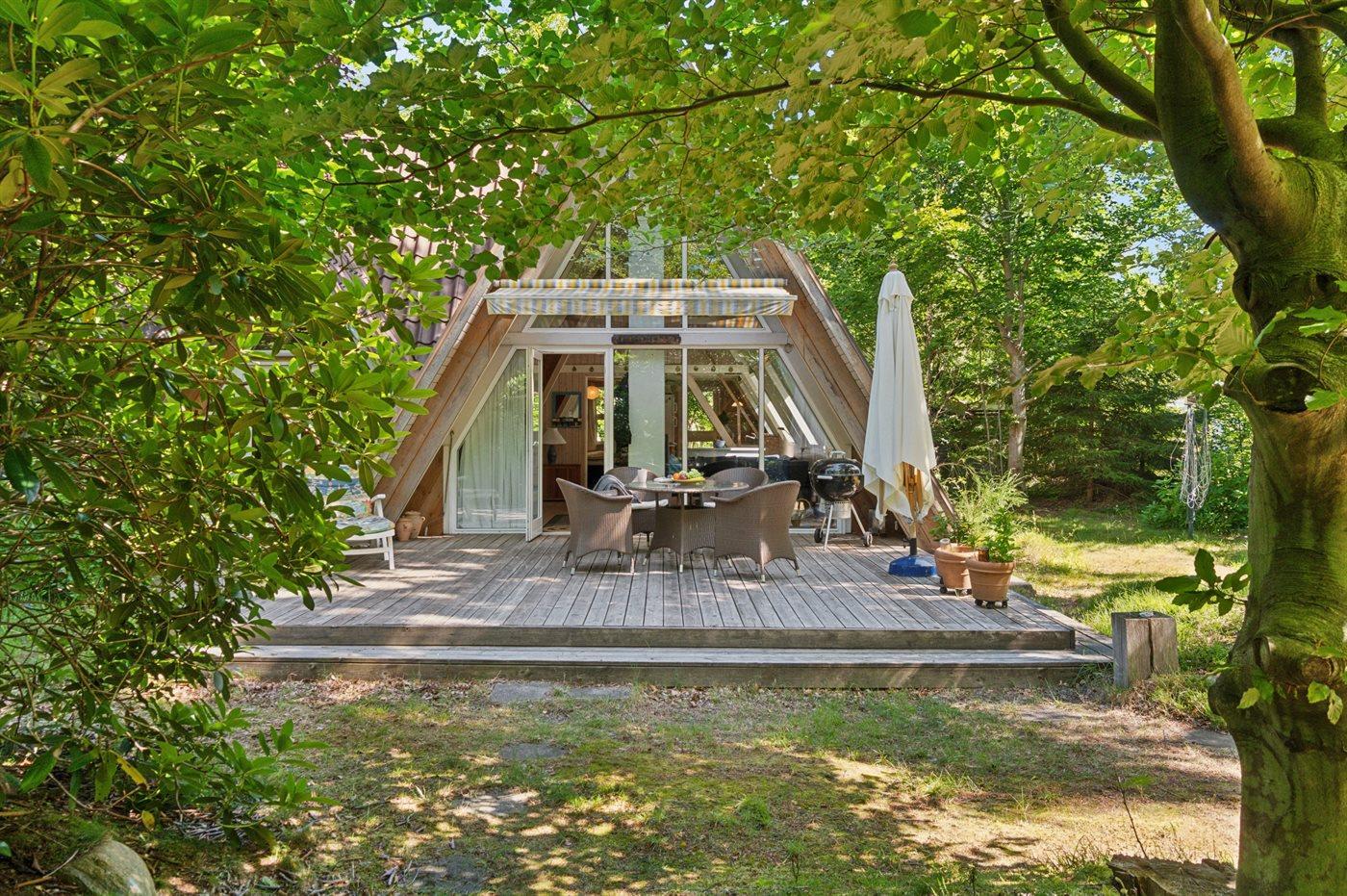 Huset er beliggende i et roligt sommerhusområde og ligger ugenert omgivet af beplantning og høje træer.