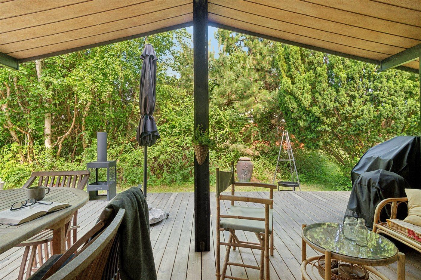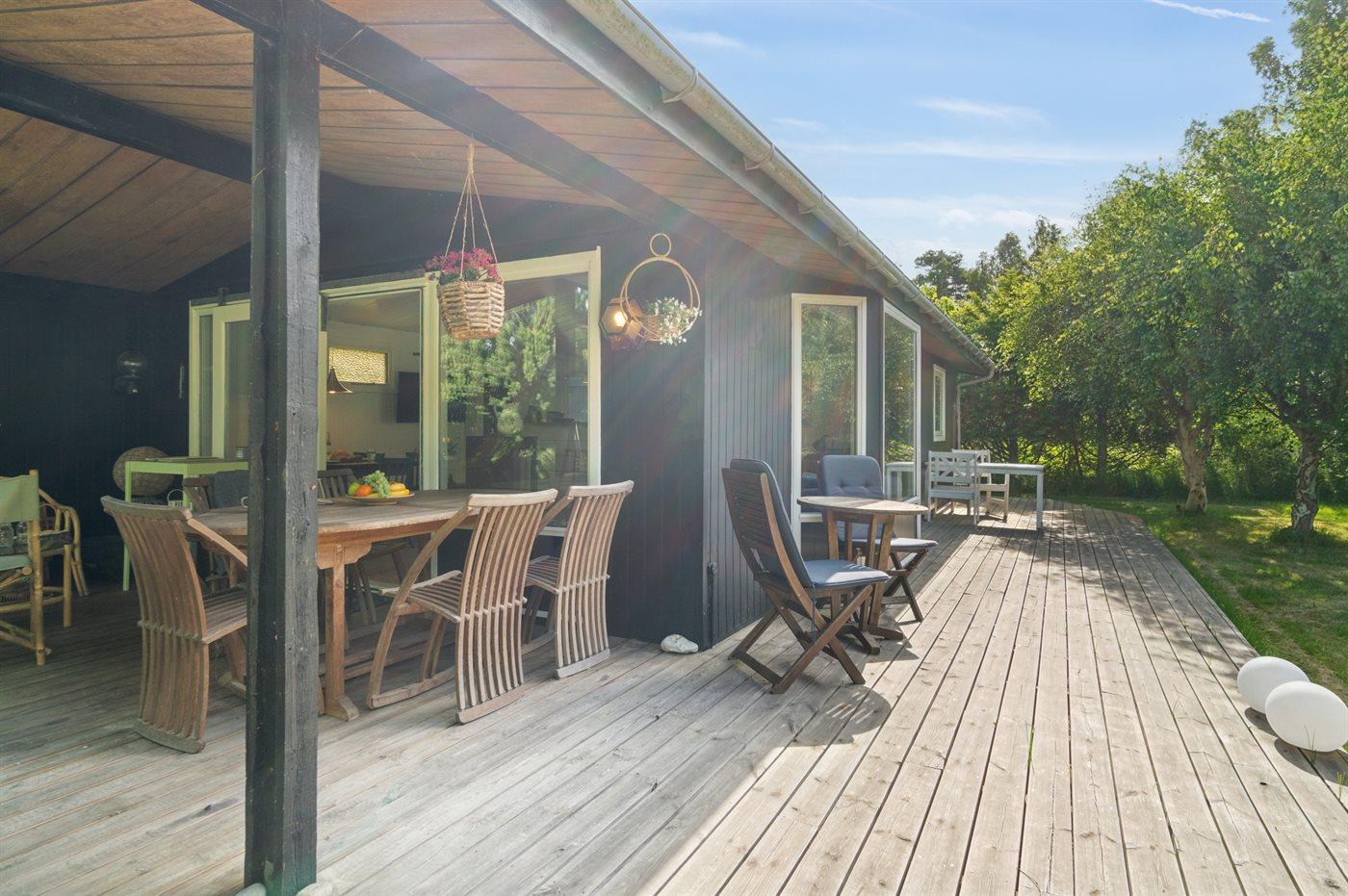 Ferieboligen er beliggende på en 1277 m² stor havegrund. Der er 350 m til havet. Der er en badebro i nærheden. Nærmeste forretning er beliggende i en afstand af 2850 m. Der er en golfbane i en afstand af 7750 m. Til ferieboligen hører 45 m² terrasseareal. Desuden er der 20 m² overdækket terrasse. Sandkasse. Bålsted. Grill til rådighed. Der er installeret stik til opladning af elbil. Type 2 stik. Med 11 kW ladeeffekt. Parkering ved ferieboligen.