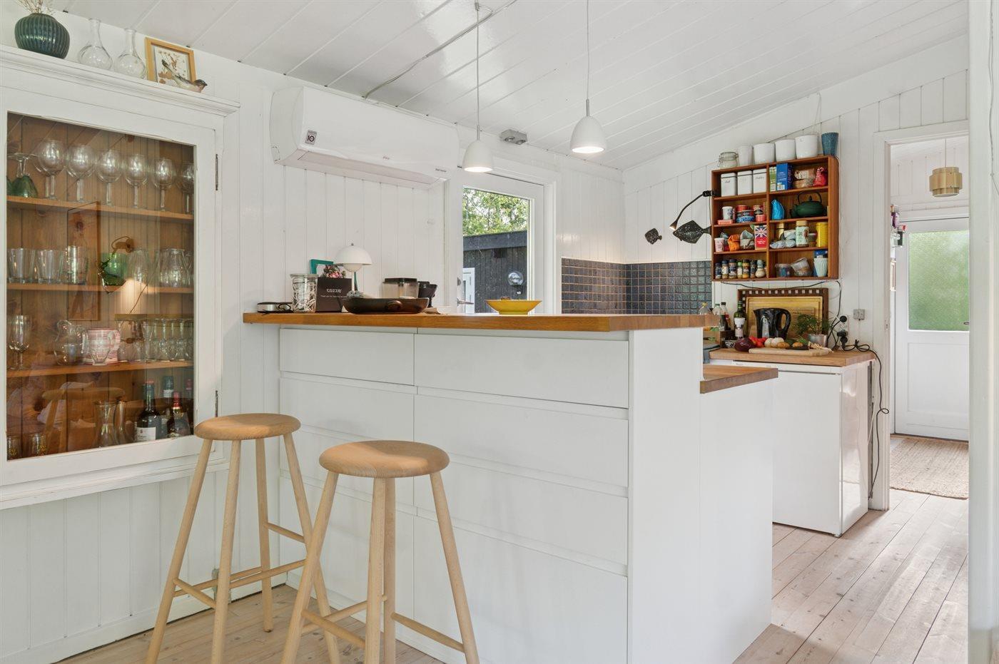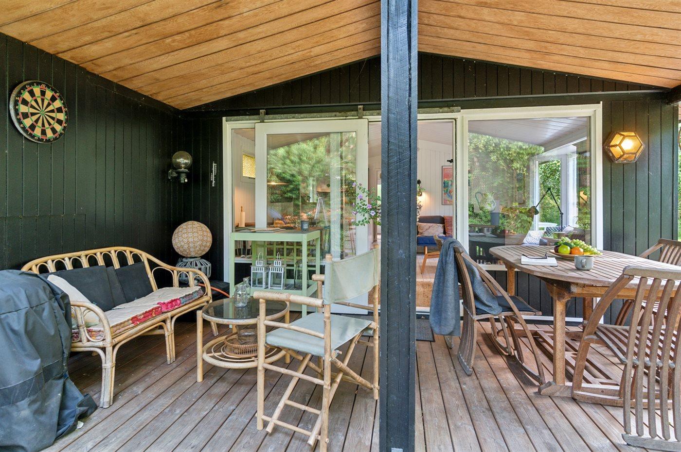 Huset indeholder et dejligt køkkenalrum i forbindelse med stuen. Herfra er der udgang til et stort terrasseareal, hvor en større del er overdækket. Her er rig mulighed for at nyde solen og finde skygge og læ og nyde de lange sommeraftener. Fra køkkenet er der desuden en terrassedør ud til de to annekser. Det største af de 2 annekser er opført i 2025. I begge annekser er der 2 sovepladser i dobbeltsenge.
