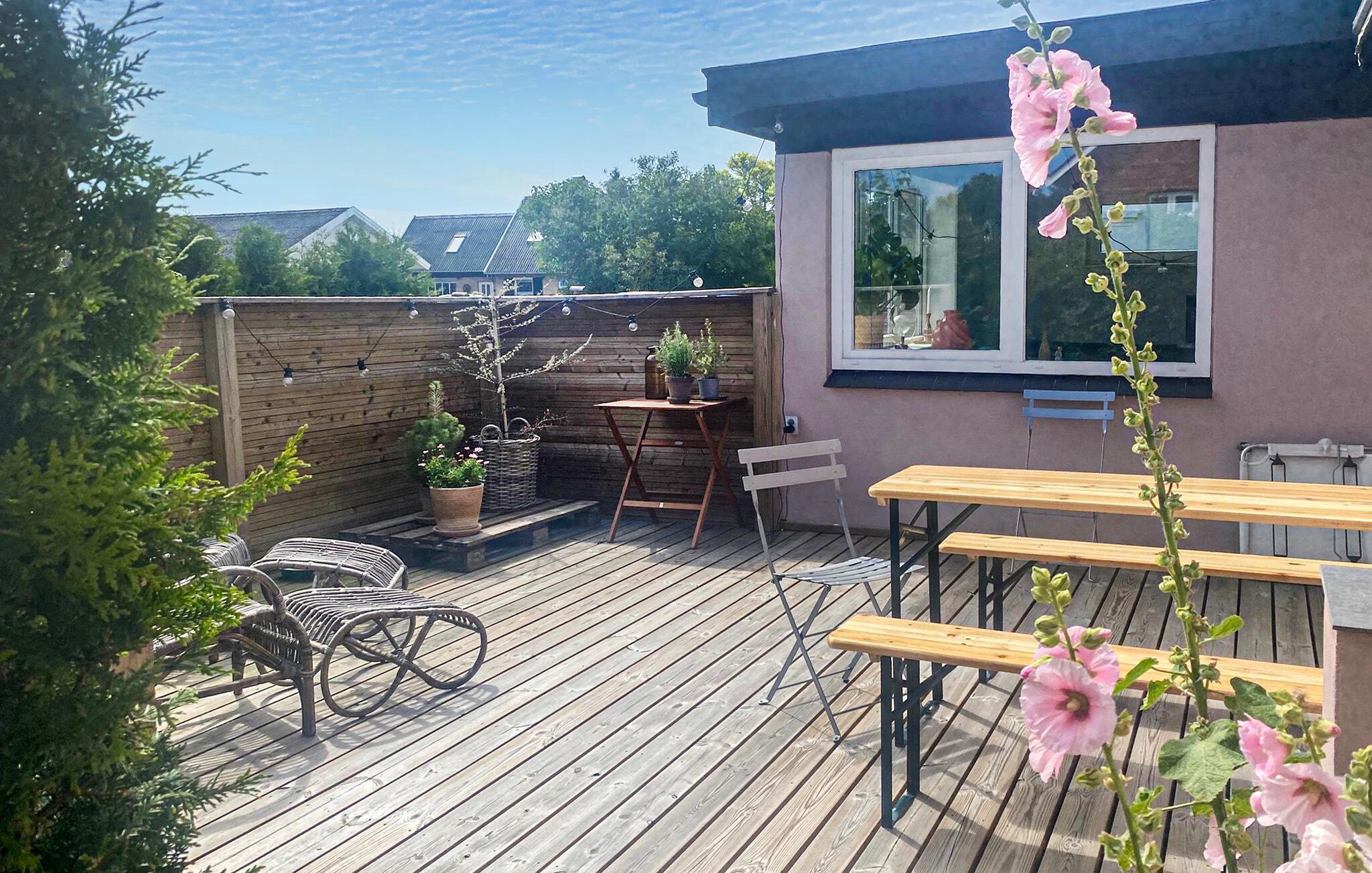 Denne ugenerte træterrasse er det ideelle sted at servere morgenmaden udendørs på solrige dage. Lad børnene lege i den indhegnede have og organiser en stemningsfuld grillmiddag med vin og levende lys.