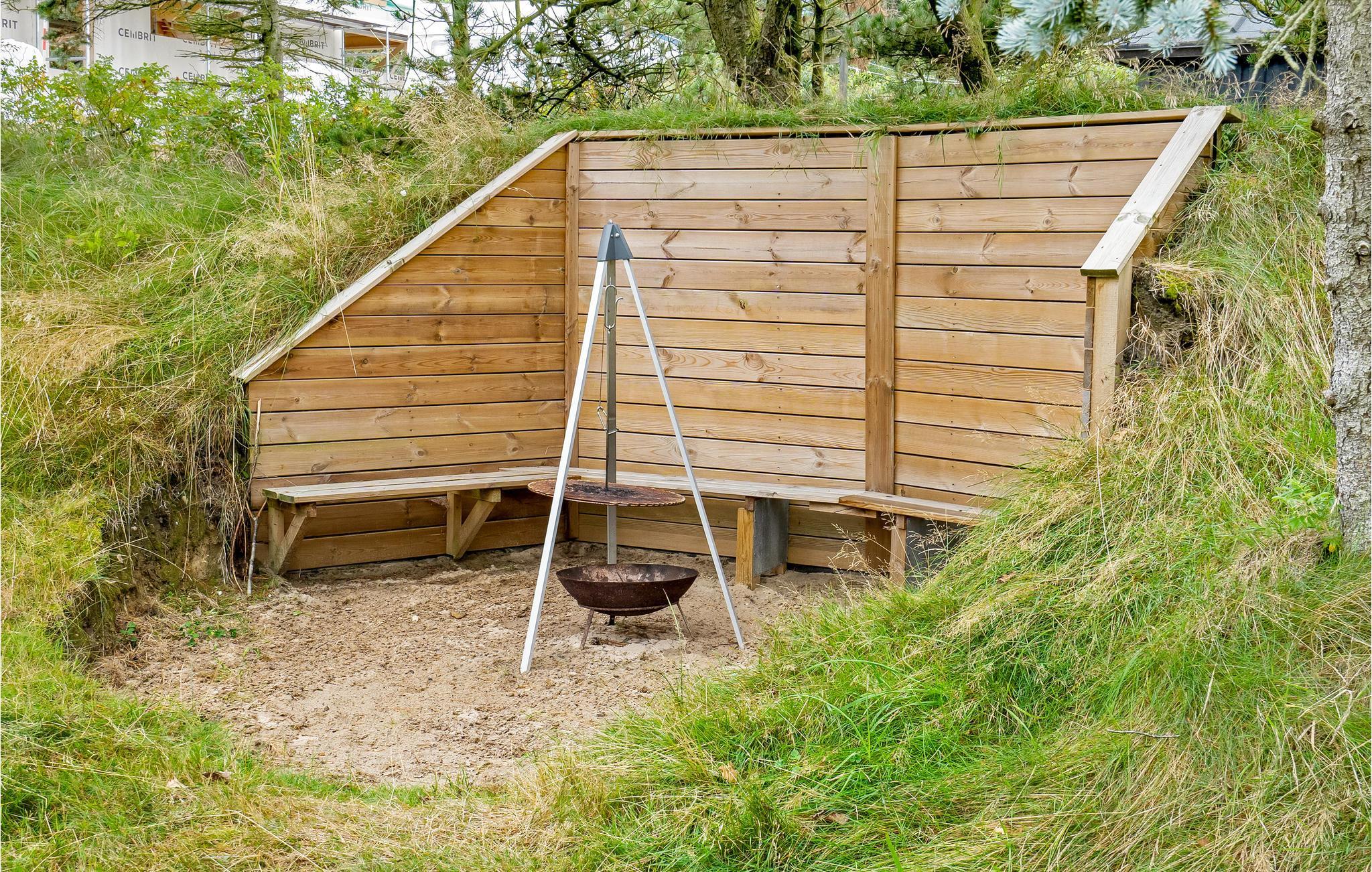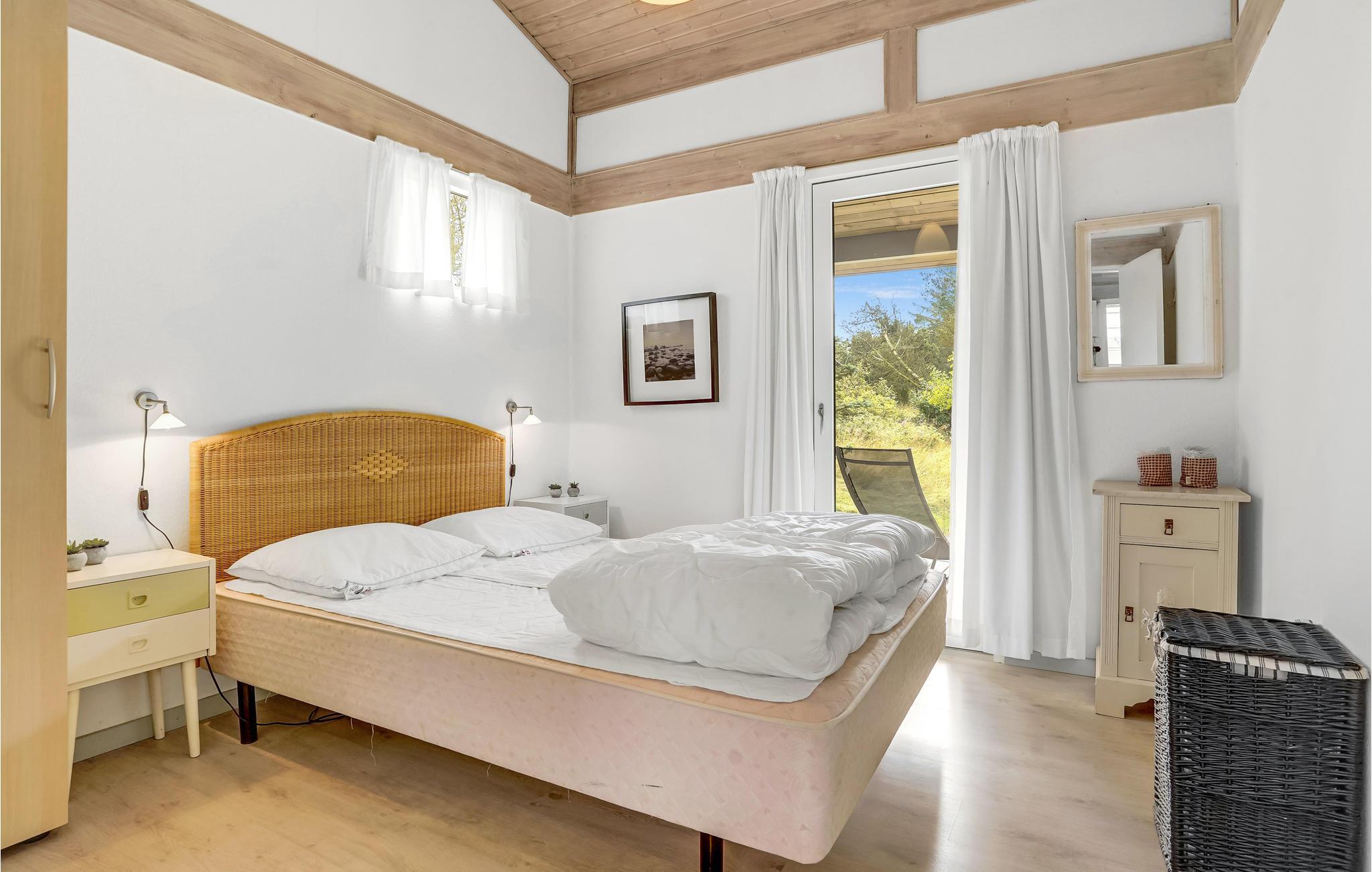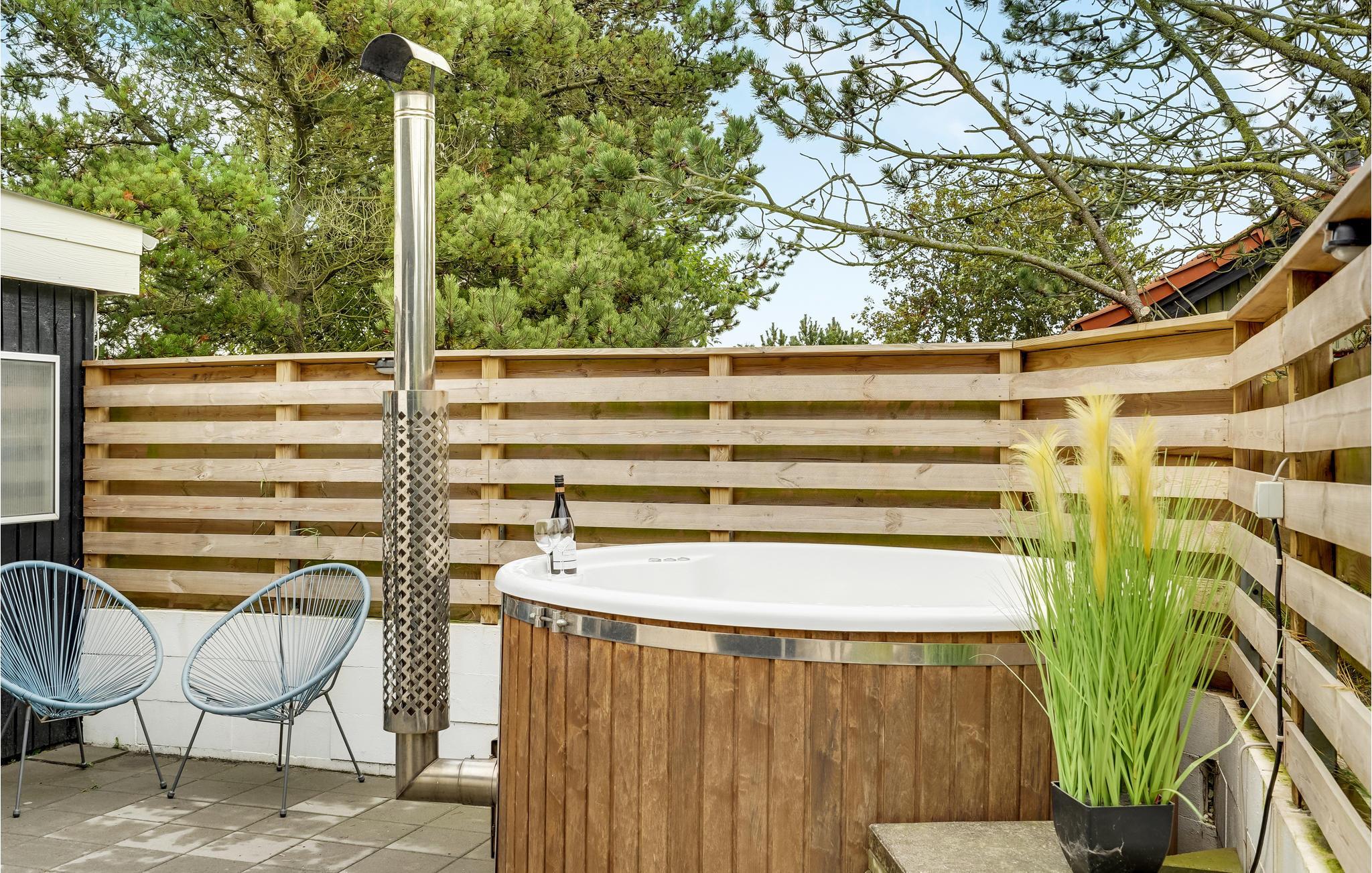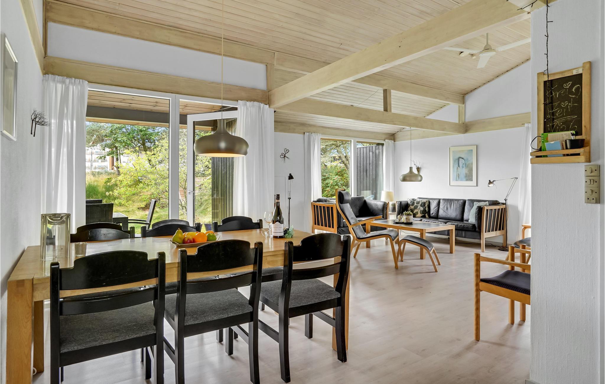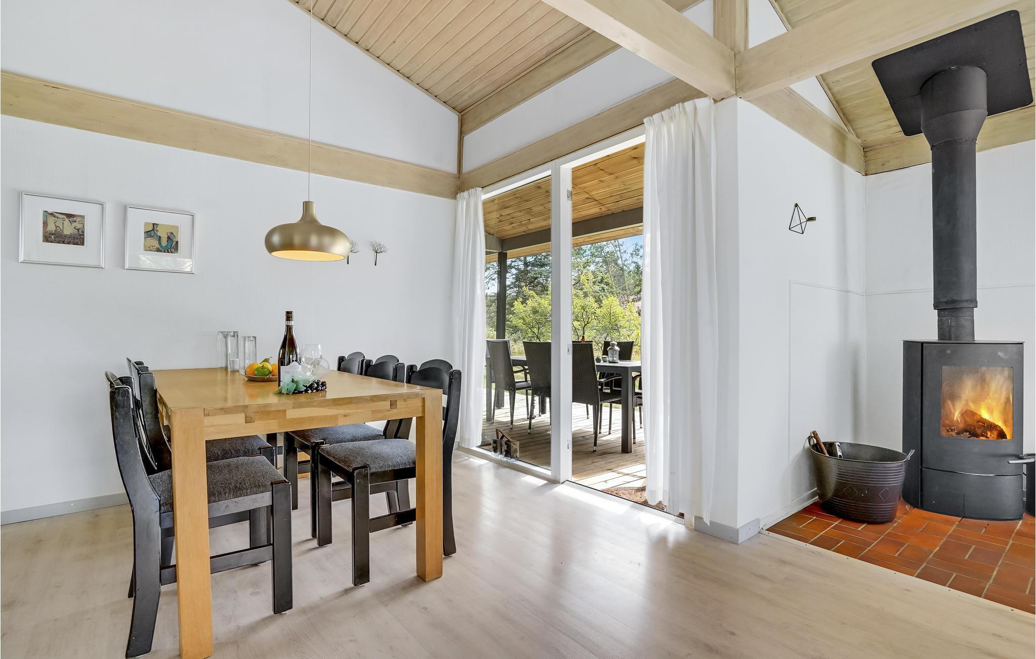 Huset har en dejlig beskyttet eftermiddags- og aftenterrasse, som vender mod den indhegnede have, en skøn morgenterrasse, hvor I kan nyde jeres morgenkaffe samt en dejlig overdækket gårdhave. Fra den overdækkede gårdhave er der adgang til det ene soveværelse og den lækre wellnesafdeling med et stort flot badeværelse med sauna og spabad og direkte udgang til terrassen med brændefyret vildmarksbad til 6 personer. Inde i huset er der yderligere tre soveværelser og et badeværelse. Stuen er hyggeligt indrettet så I straks føler jer hjemme, uanset om det er tid til indehygge og ild i brændeovnen eller om terrassedøren står åben og I kan nyde en dejlig sommeraften på terrassen eller i vildmarksbadet.