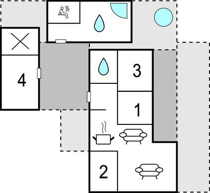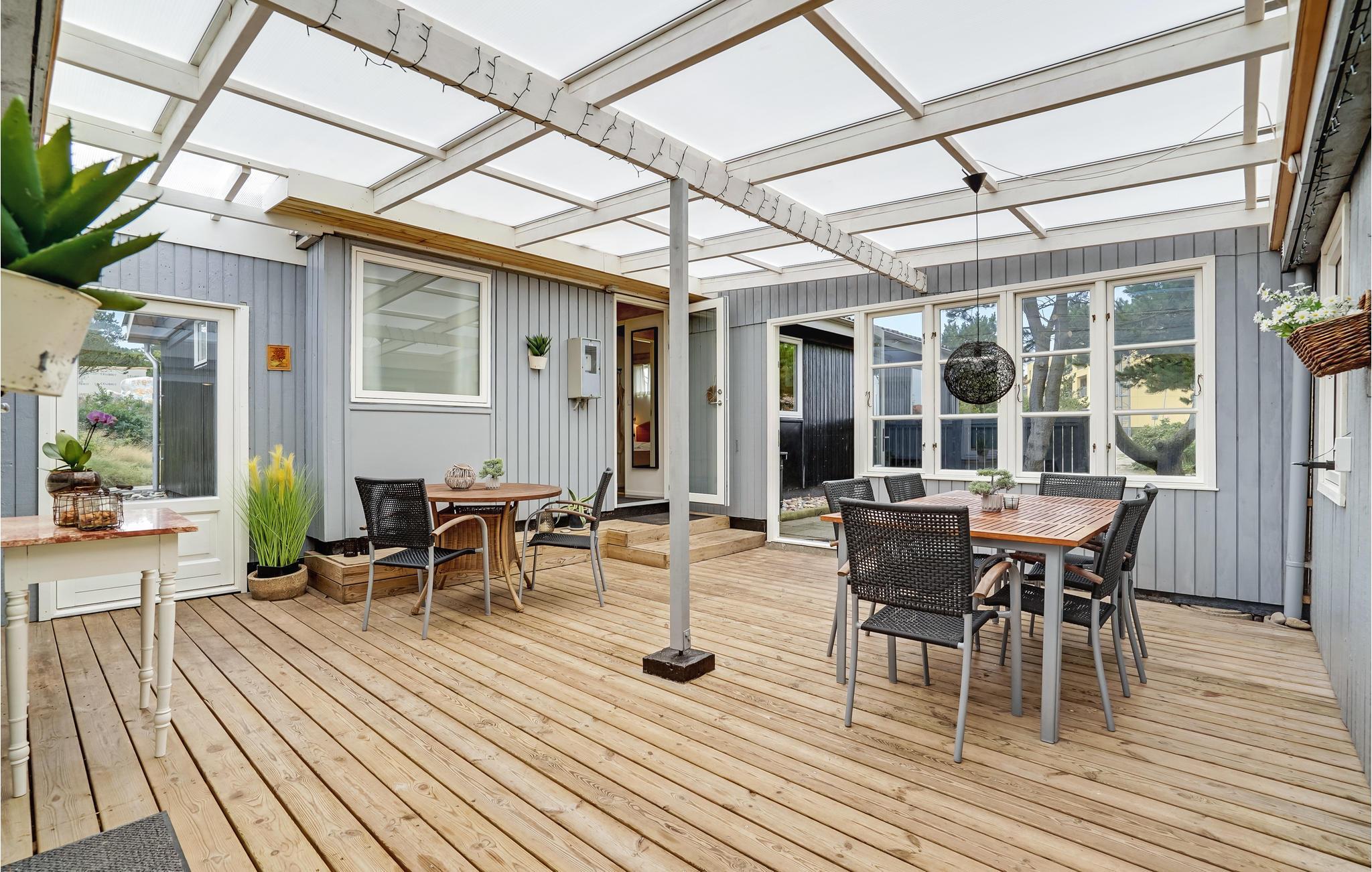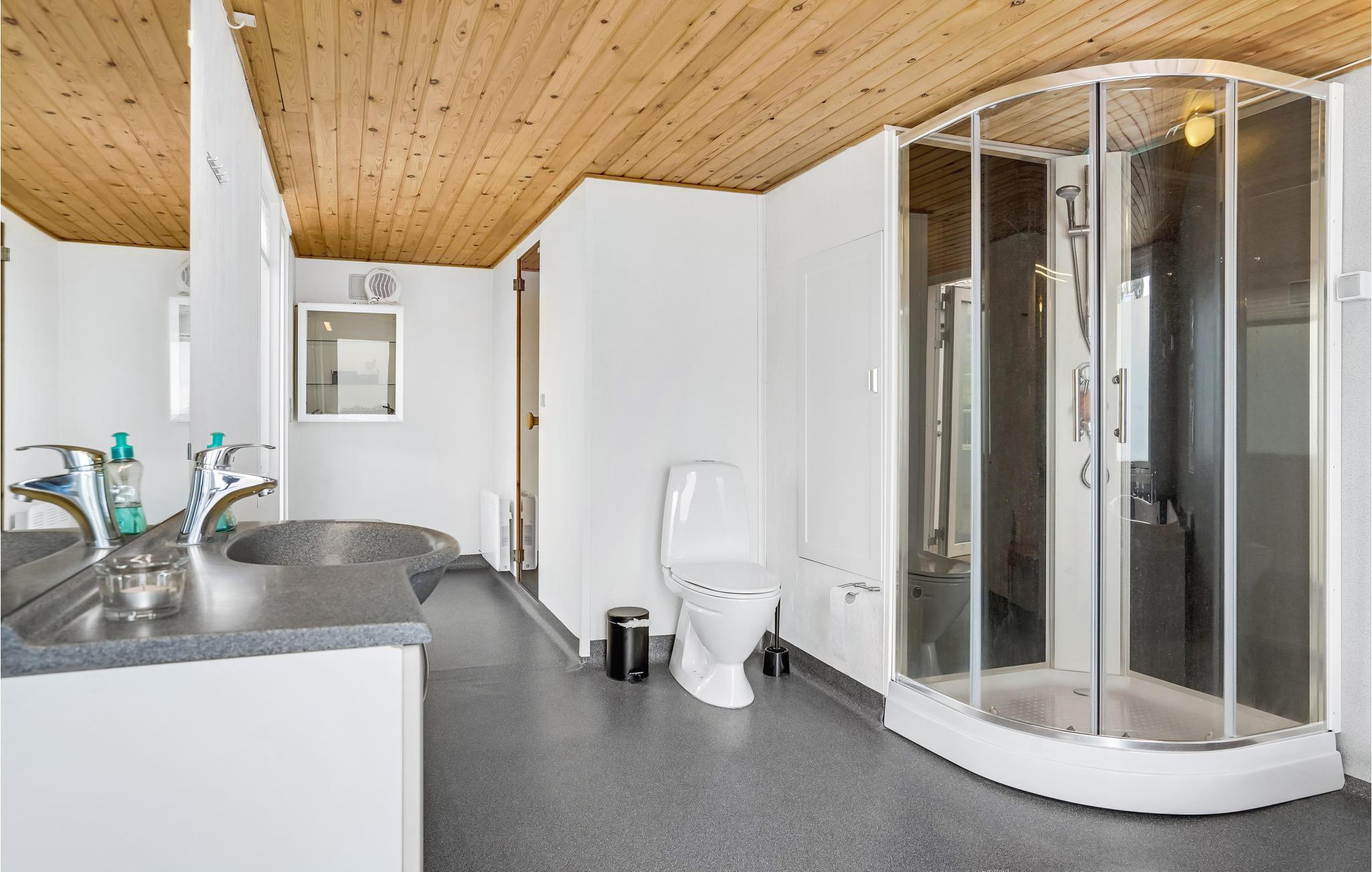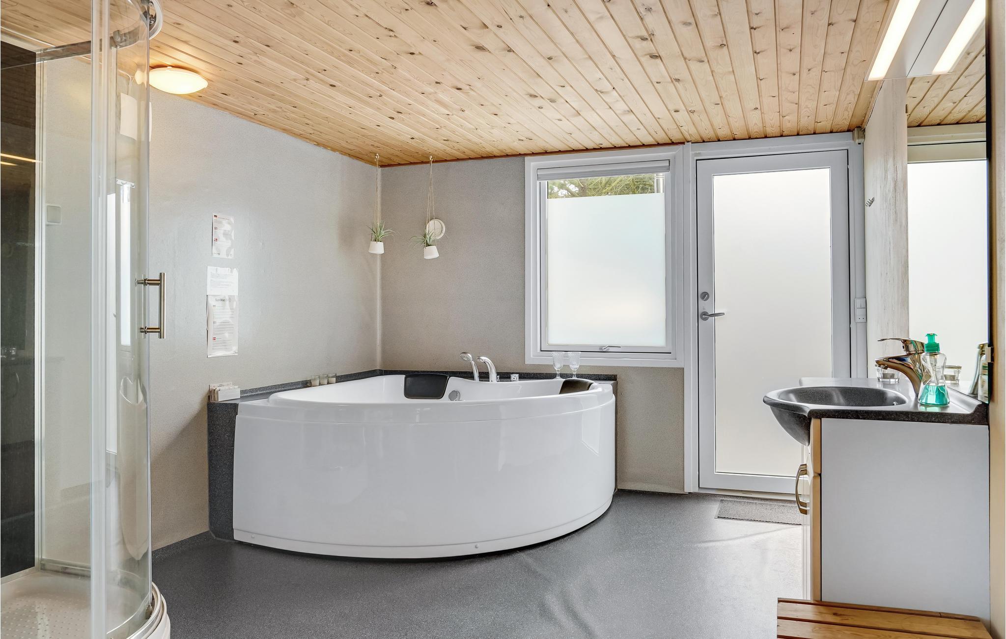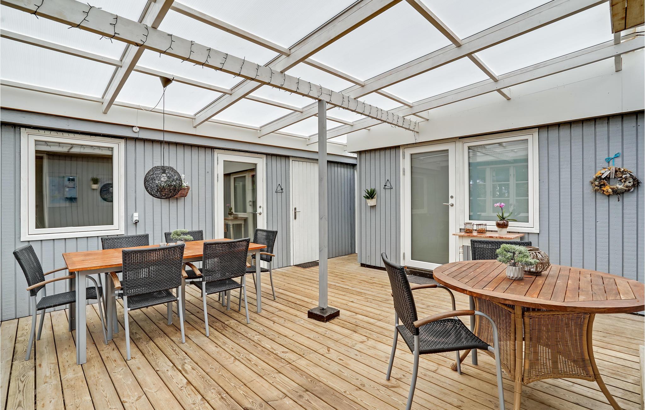 Huset har en dejlig beskyttet eftermiddags- og aftenterrasse, som vender mod den indhegnede have, en skøn morgenterrasse, hvor I kan nyde jeres morgenkaffe samt en dejlig overdækket gårdhave. Fra den overdækkede gårdhave er der adgang til det ene soveværelse og den lækre wellnesafdeling med et stort flot badeværelse med sauna og spabad og direkte udgang til terrassen med brændefyret vildmarksbad til 6 personer. Inde i huset er der yderligere tre soveværelser og et badeværelse. Stuen er hyggeligt indrettet så I straks føler jer hjemme, uanset om det er tid til indehygge og ild i brændeovnen eller om terrassedøren står åben og I kan nyde en dejlig sommeraften på terrassen eller i vildmarksbadet.