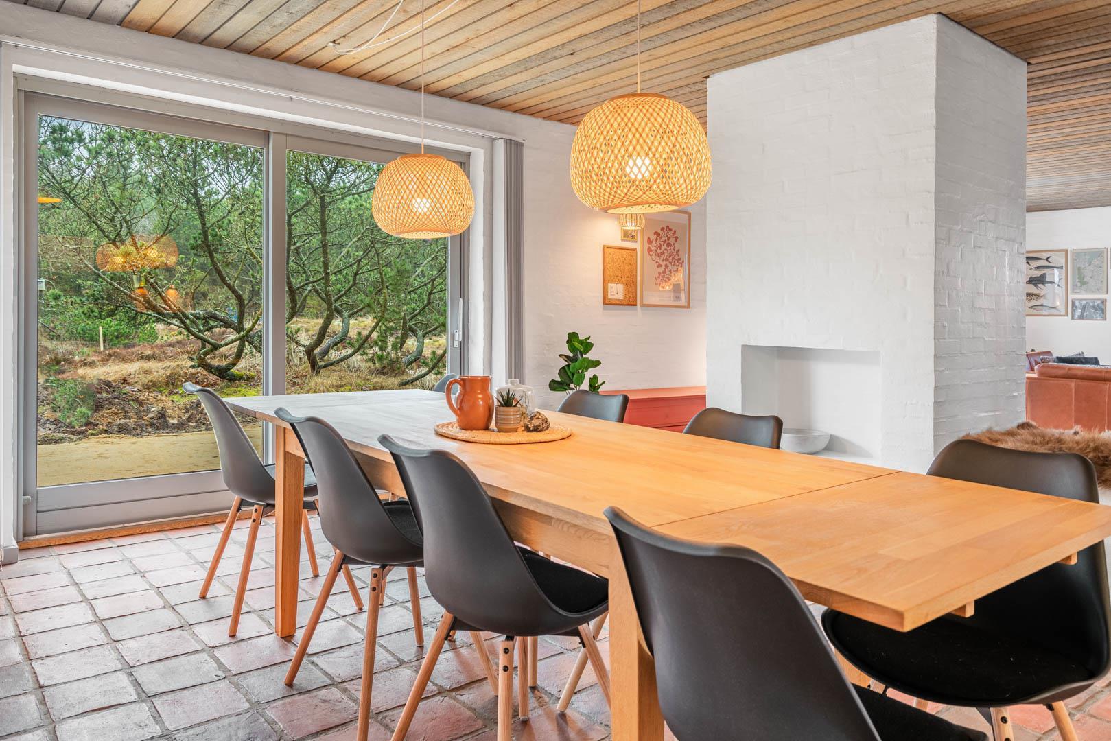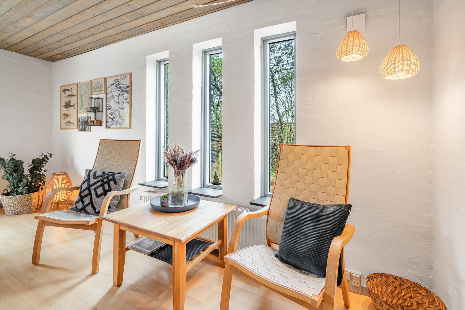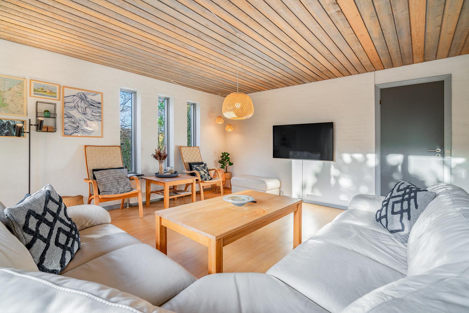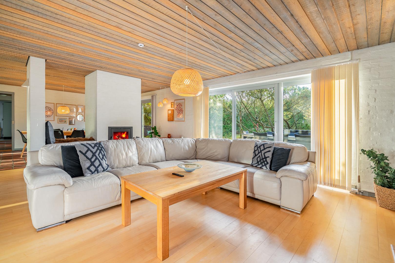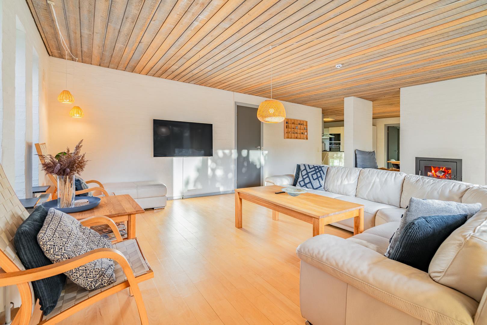 Sommerhusets samlingspunkt er den store stue med brændeovn og gulvvarme, hvor I kan slappe af efter en frisk gåtur på stranden.