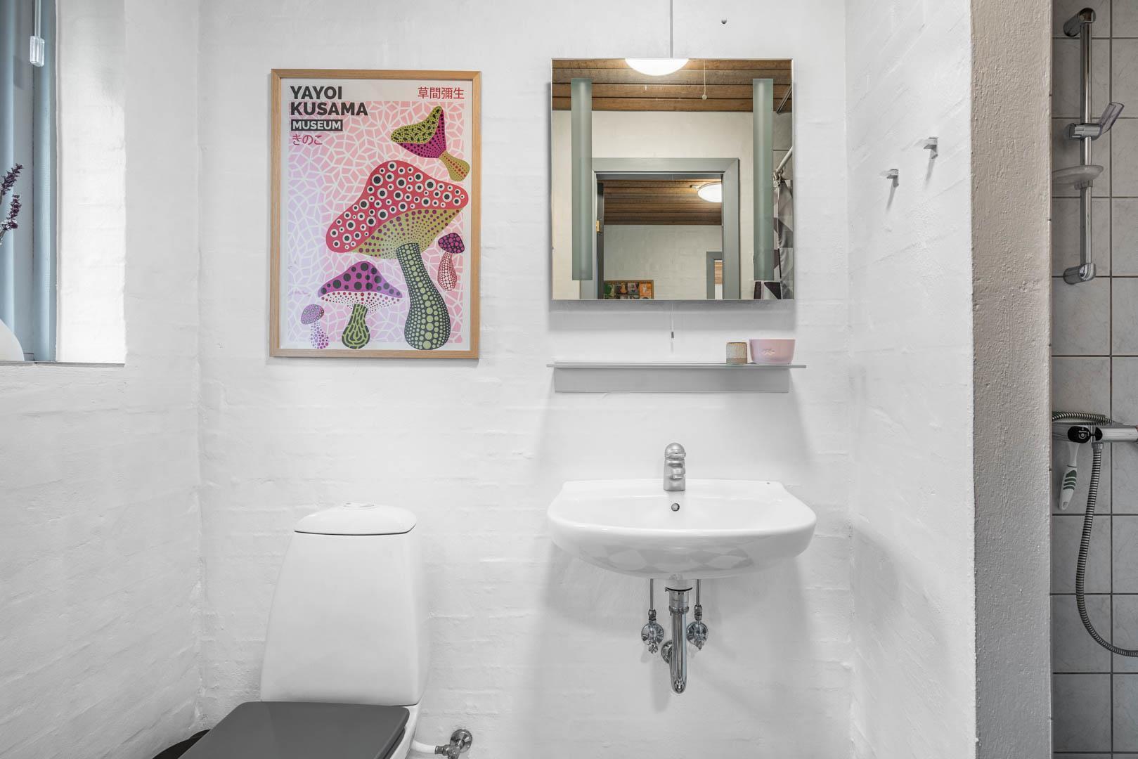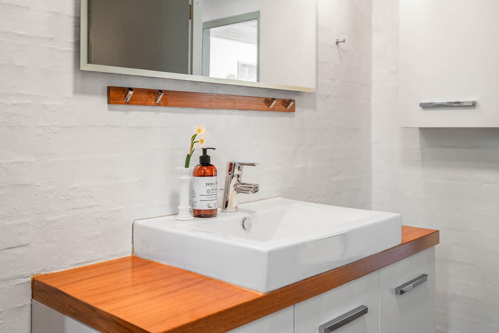 Der er desuden både vaskemaskine og tørretumbler til rådighed, og vandforbruget er inkluderet i lejen – praktisk og bekvemt.