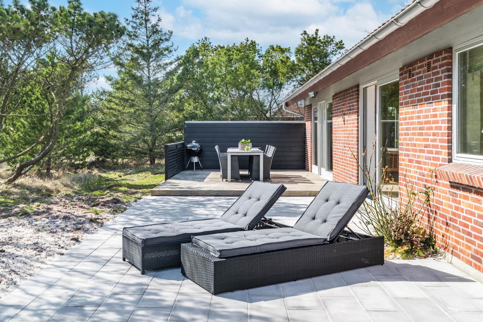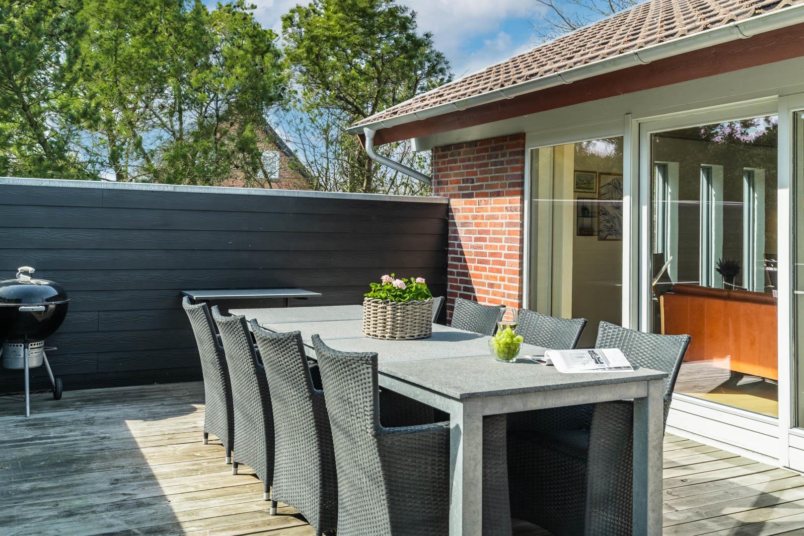 Den overdækkede terrasse bliver hurtigt feriens samlingspunkt – perfekt til morgenkaffen i solen, hyggelige grillaftener eller afslapning med et glas vin i hånden.