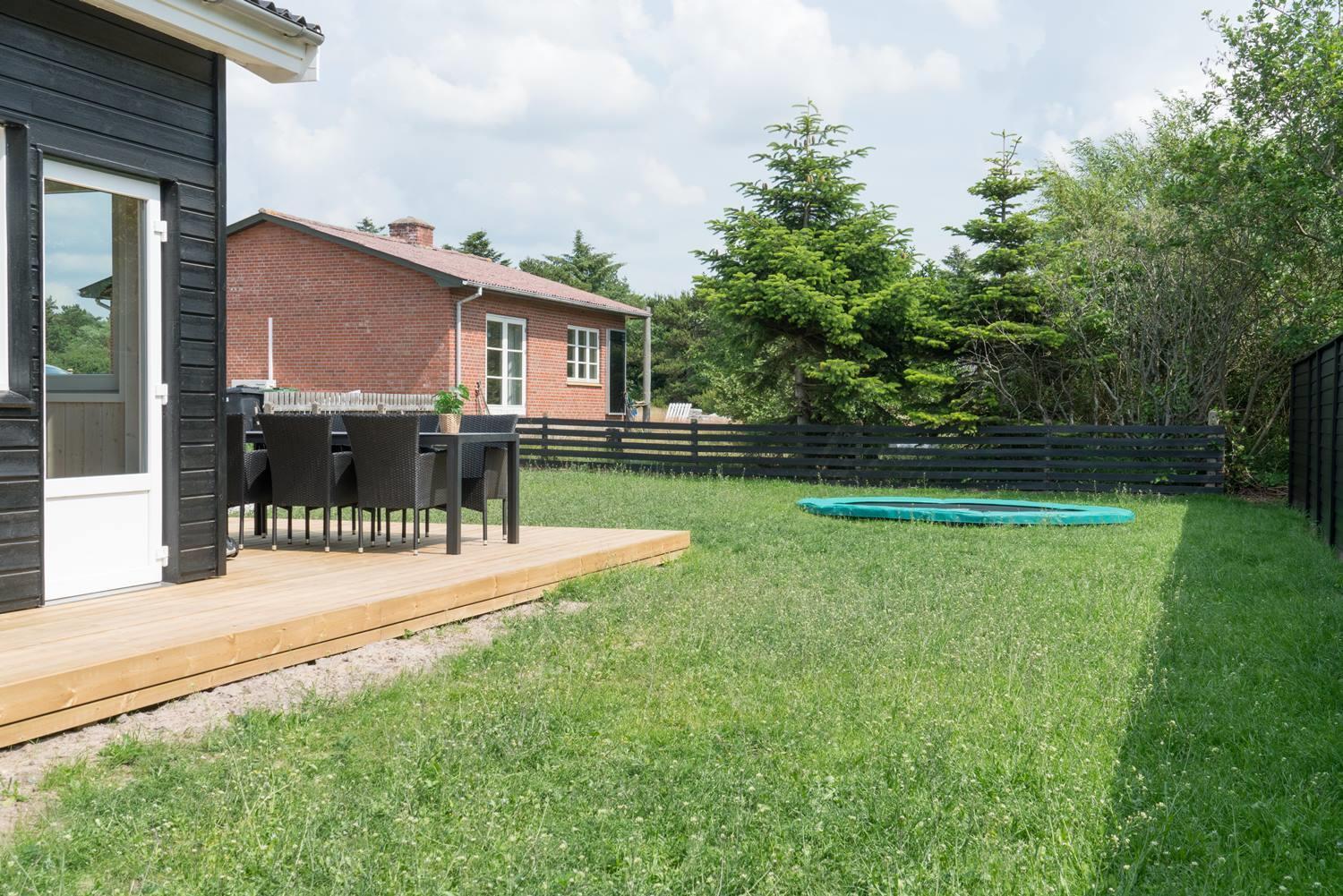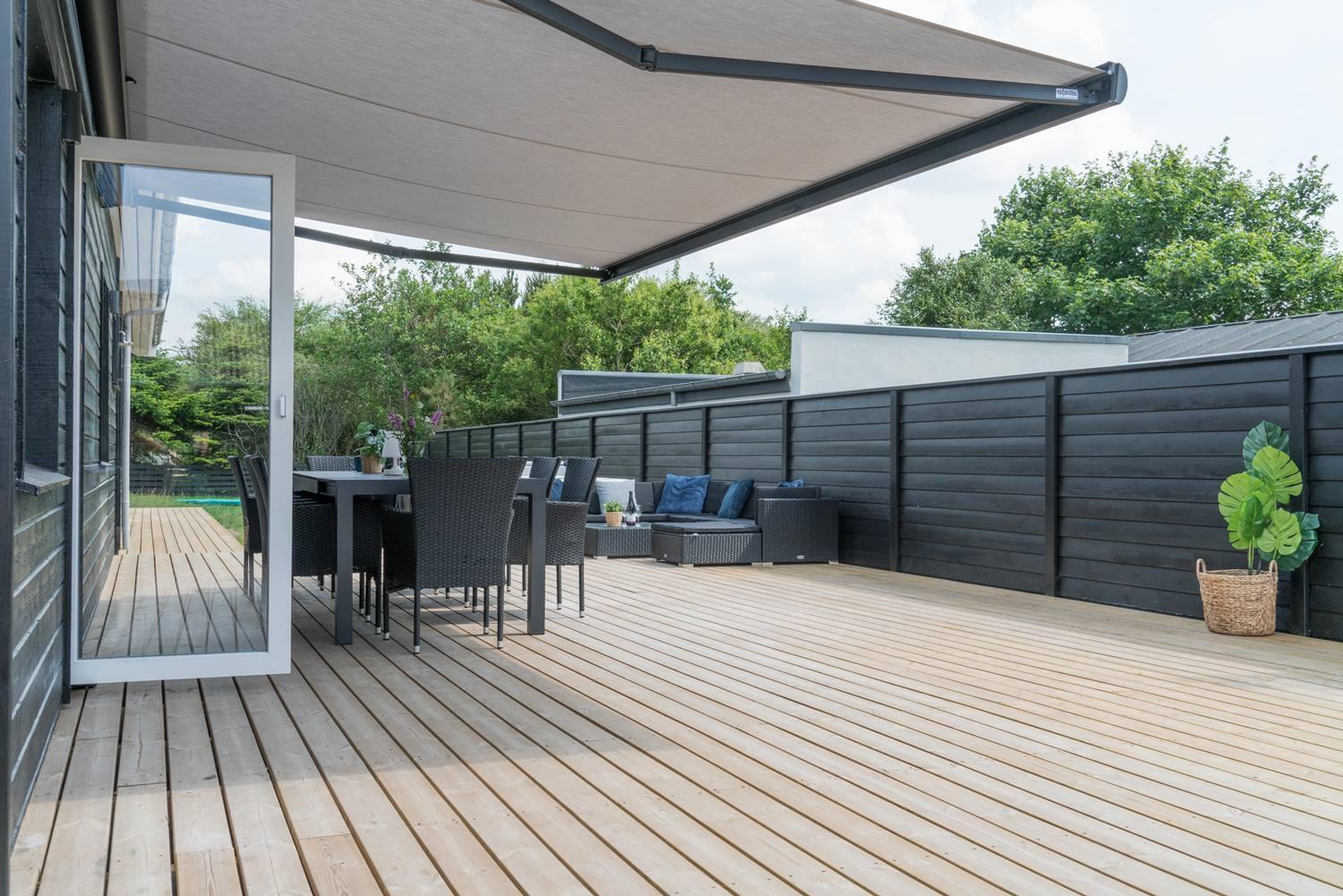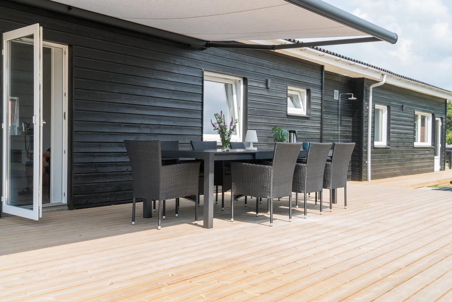 Udenfor venter en stor, indhegnet grund, hvor både børn og hunde trygt kan lege. På den overdækkede terrasse kan I nyde måltider i det fri eller bare slappe af med et glas vin – uanset vejret.
