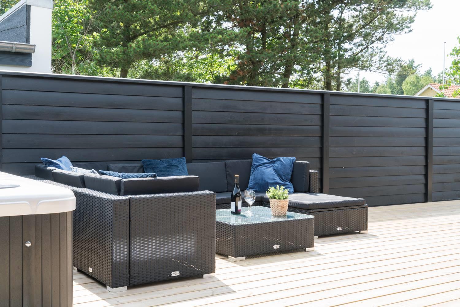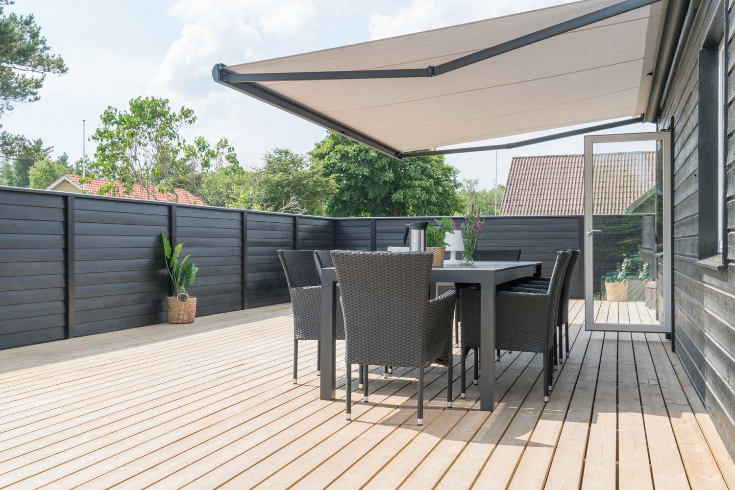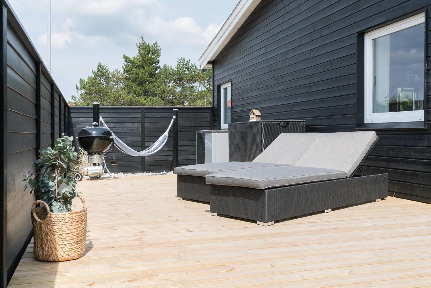 Udenfor venter en stor, indhegnet grund, hvor både børn og hunde trygt kan lege. På den overdækkede terrasse kan I nyde måltider i det fri eller bare slappe af med et glas vin – uanset vejret.