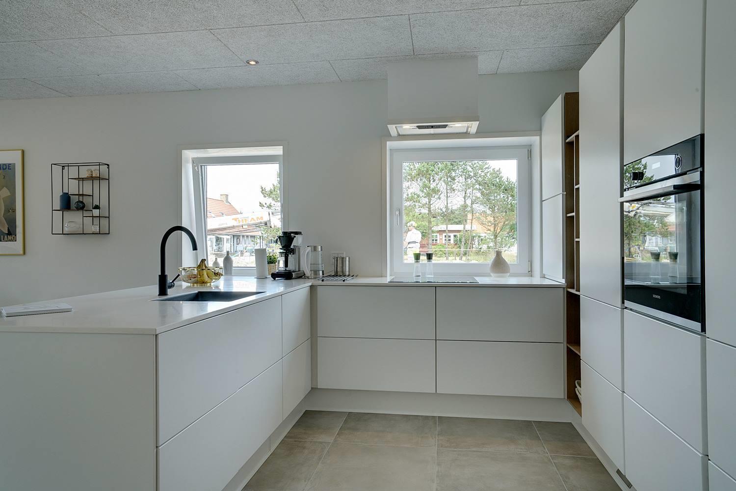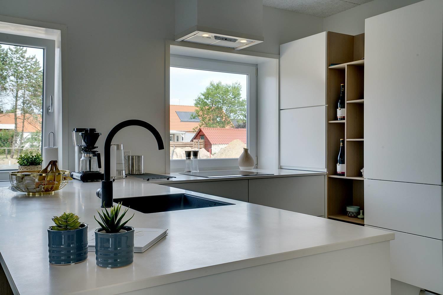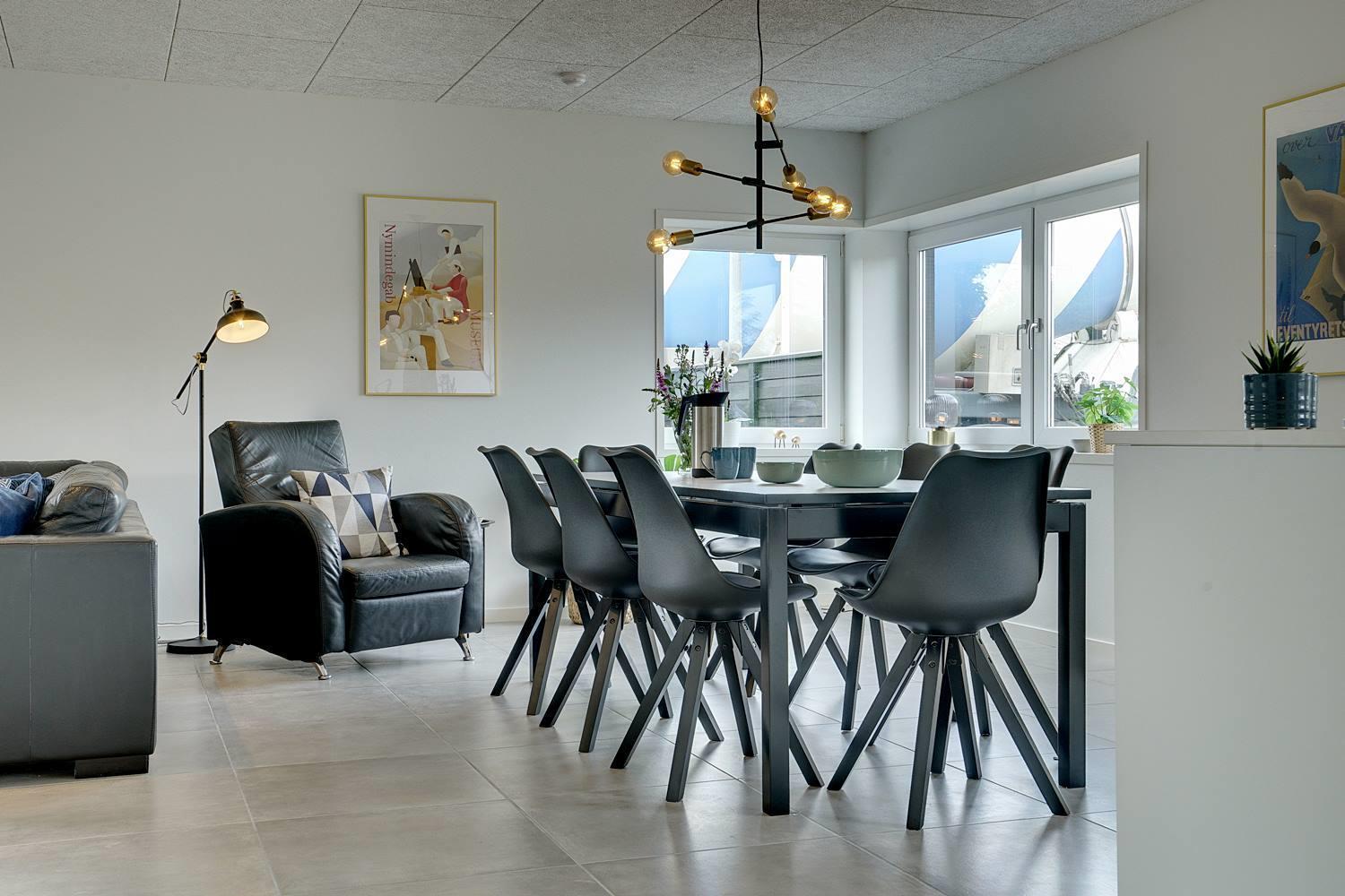 Sommerhusets hjerte er den lyse stue med åben forbindelse til spiseplads og køkken. Her kan I nyde varmen fra gulvvarmen, slappe af i sofaen og lade det store lysindfald skabe en hyggelig atmosfære.