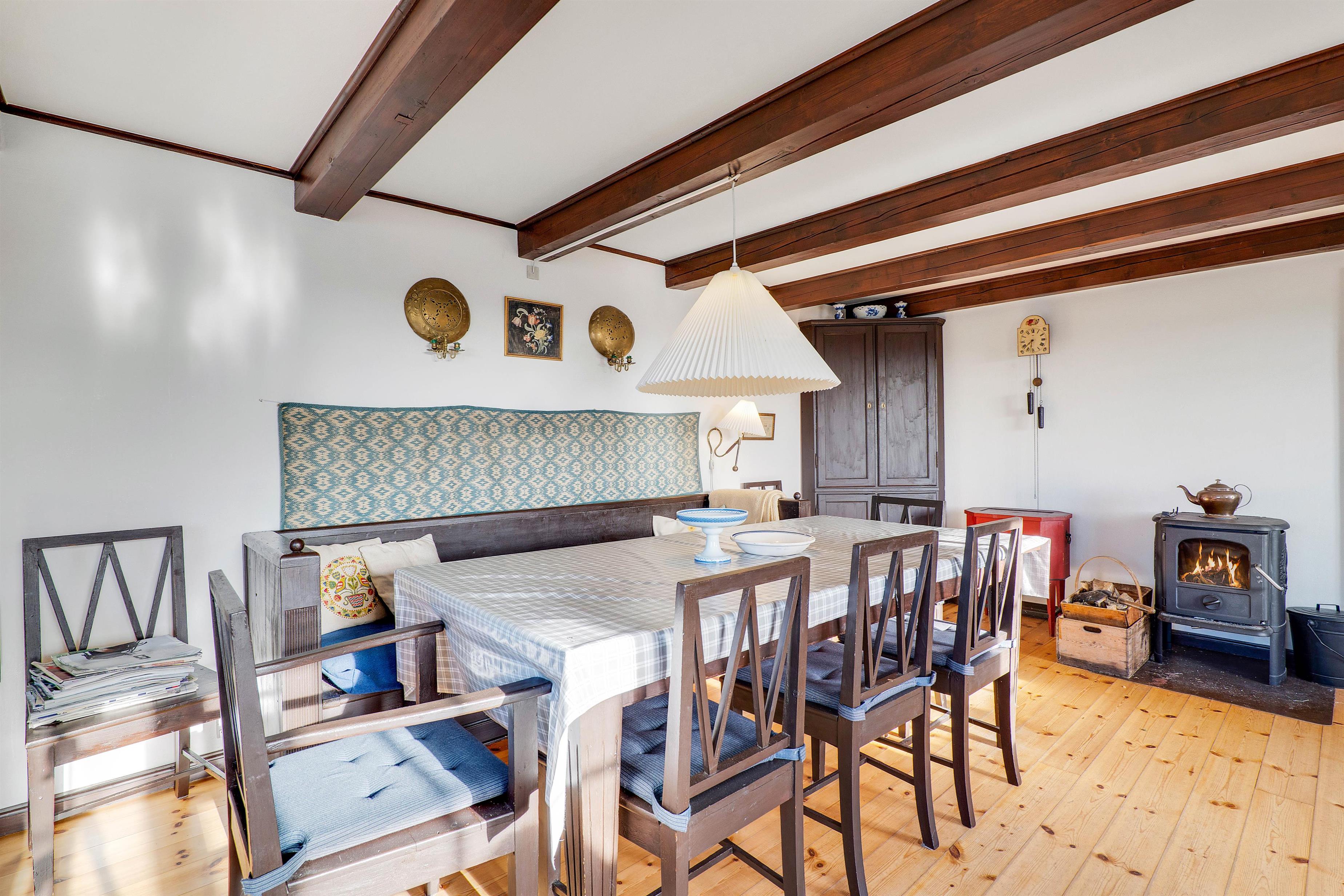 Hyggelig stue med brændeovn og trægulve