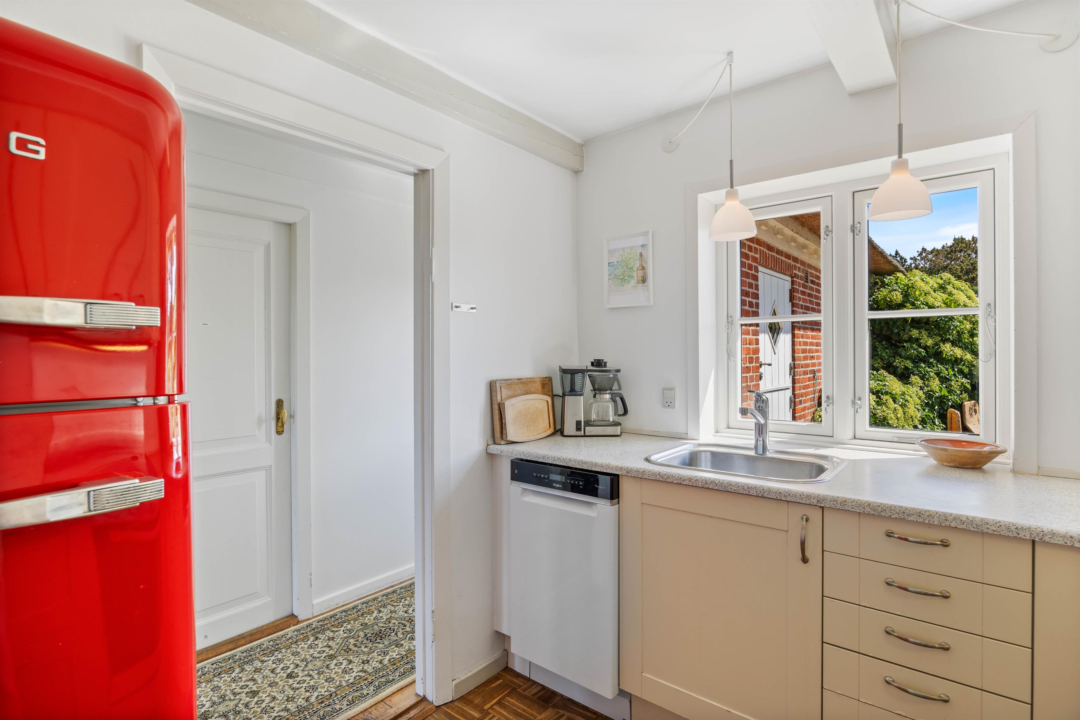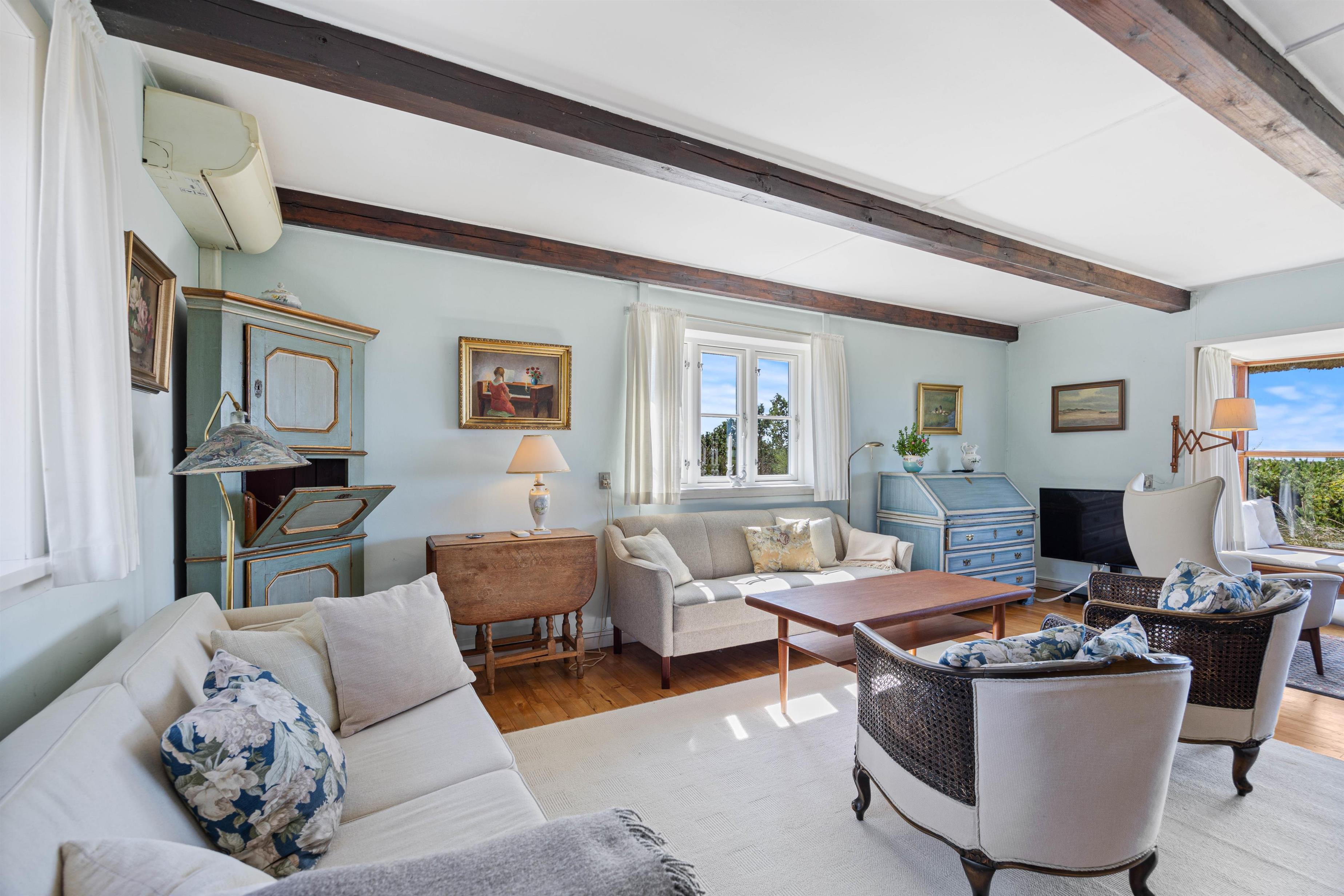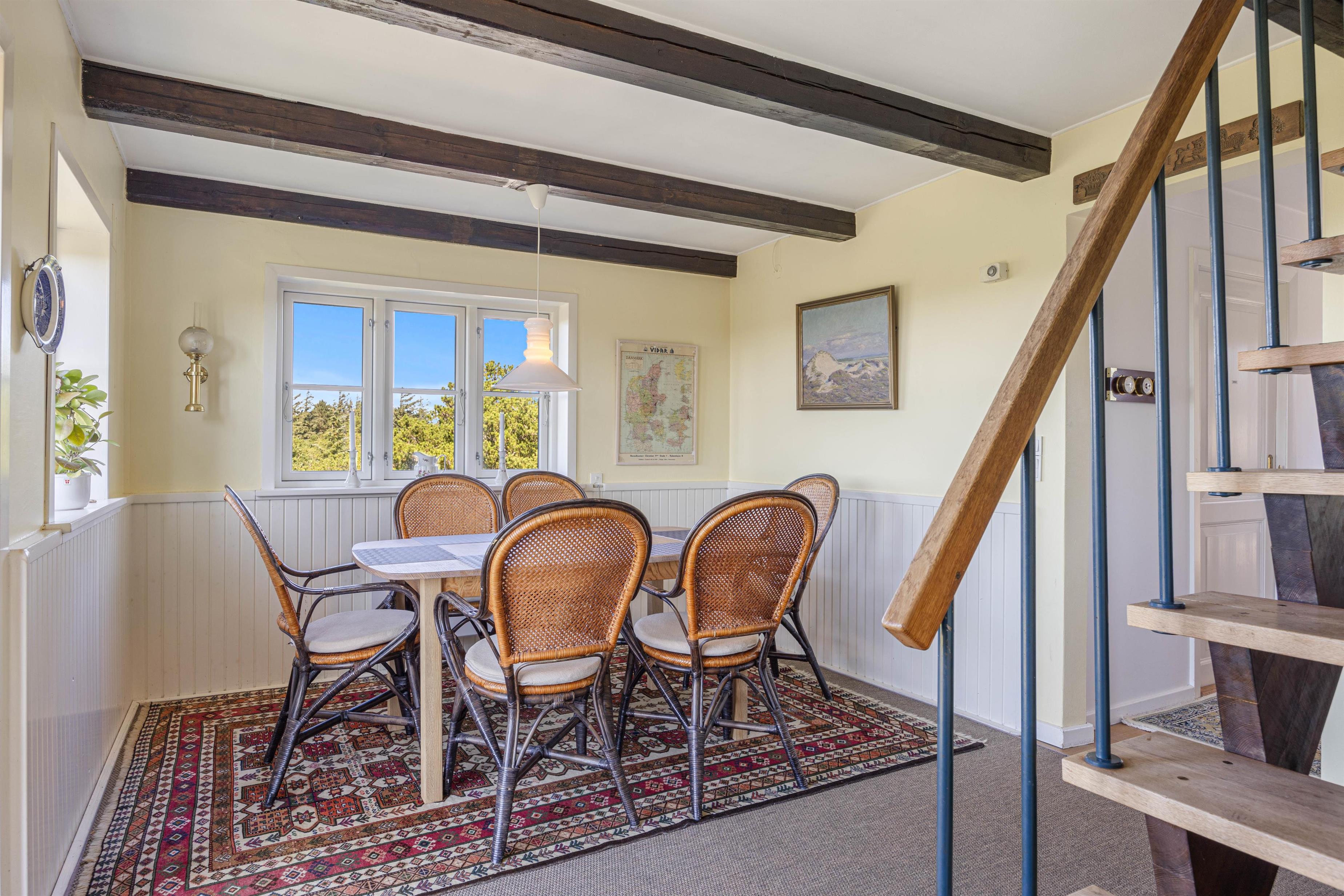 Sommerhusets 125 m² fordeler sig på 2 etager, der er indrettet med synlige bjælker i loftet. I stueplan finder I køkken, spisestue og stue, der hver har sit eget rum. I spisestuen kan I samles til gode måltider og måske lægge et puslespil efter maden?
