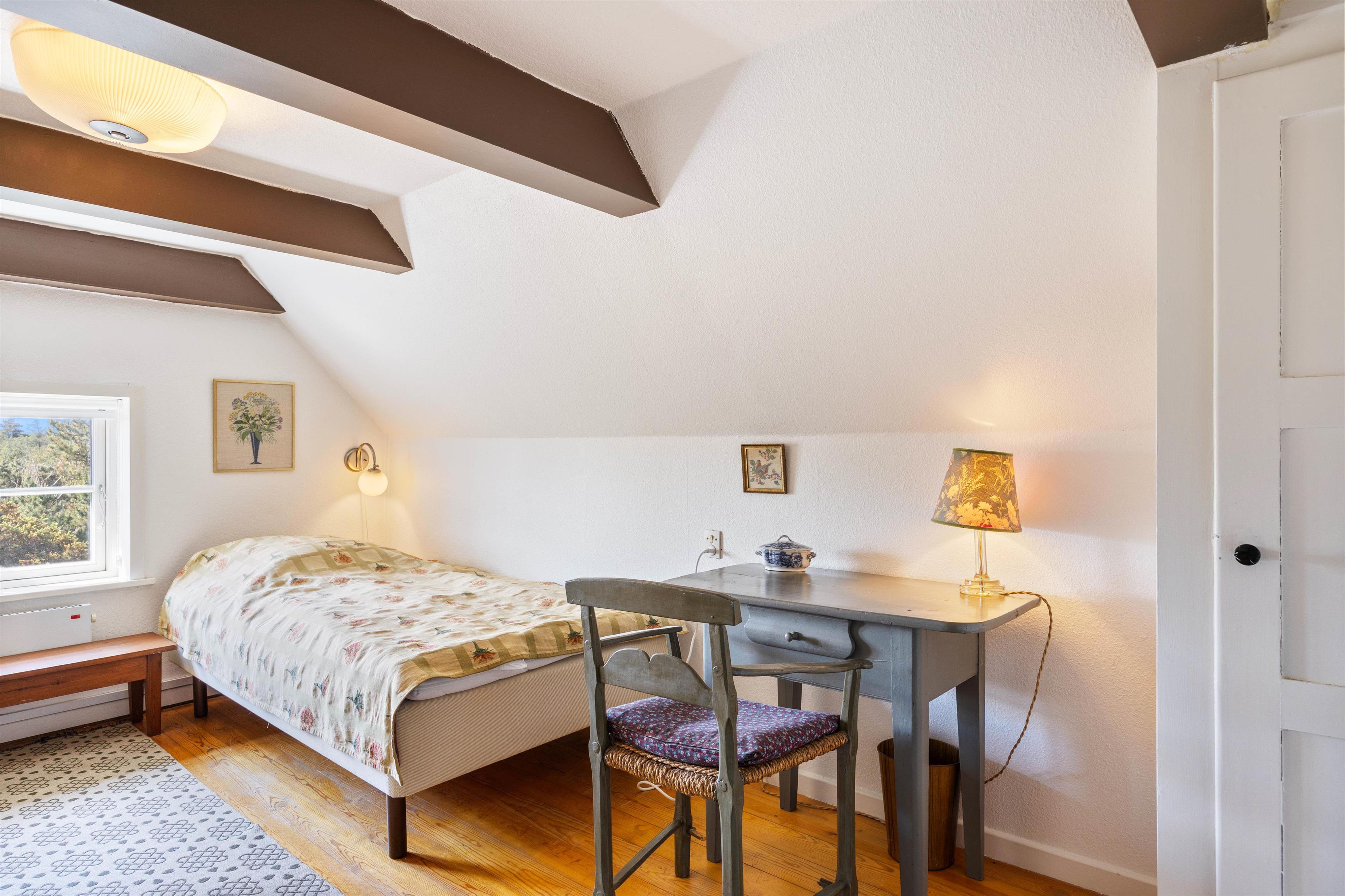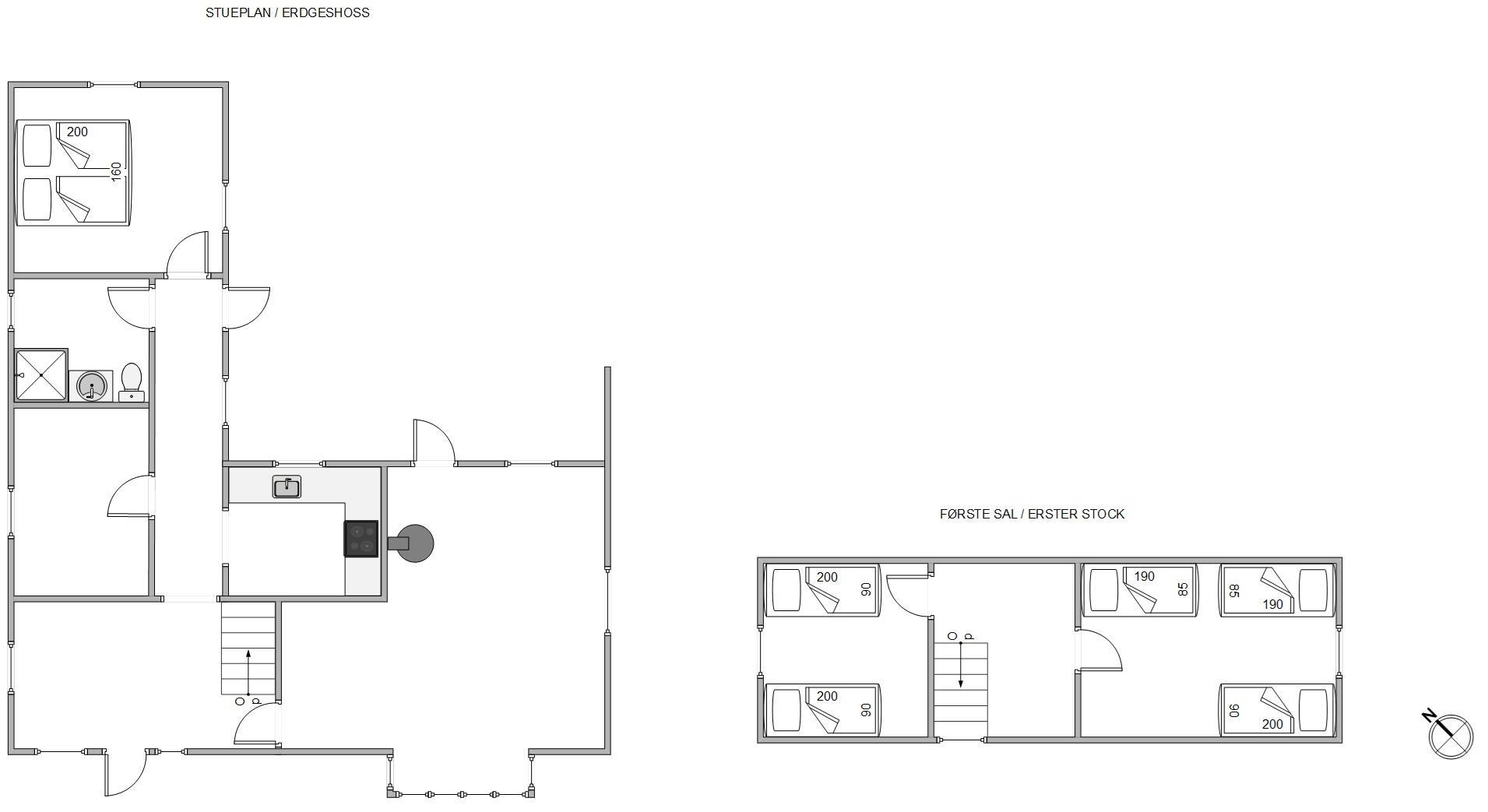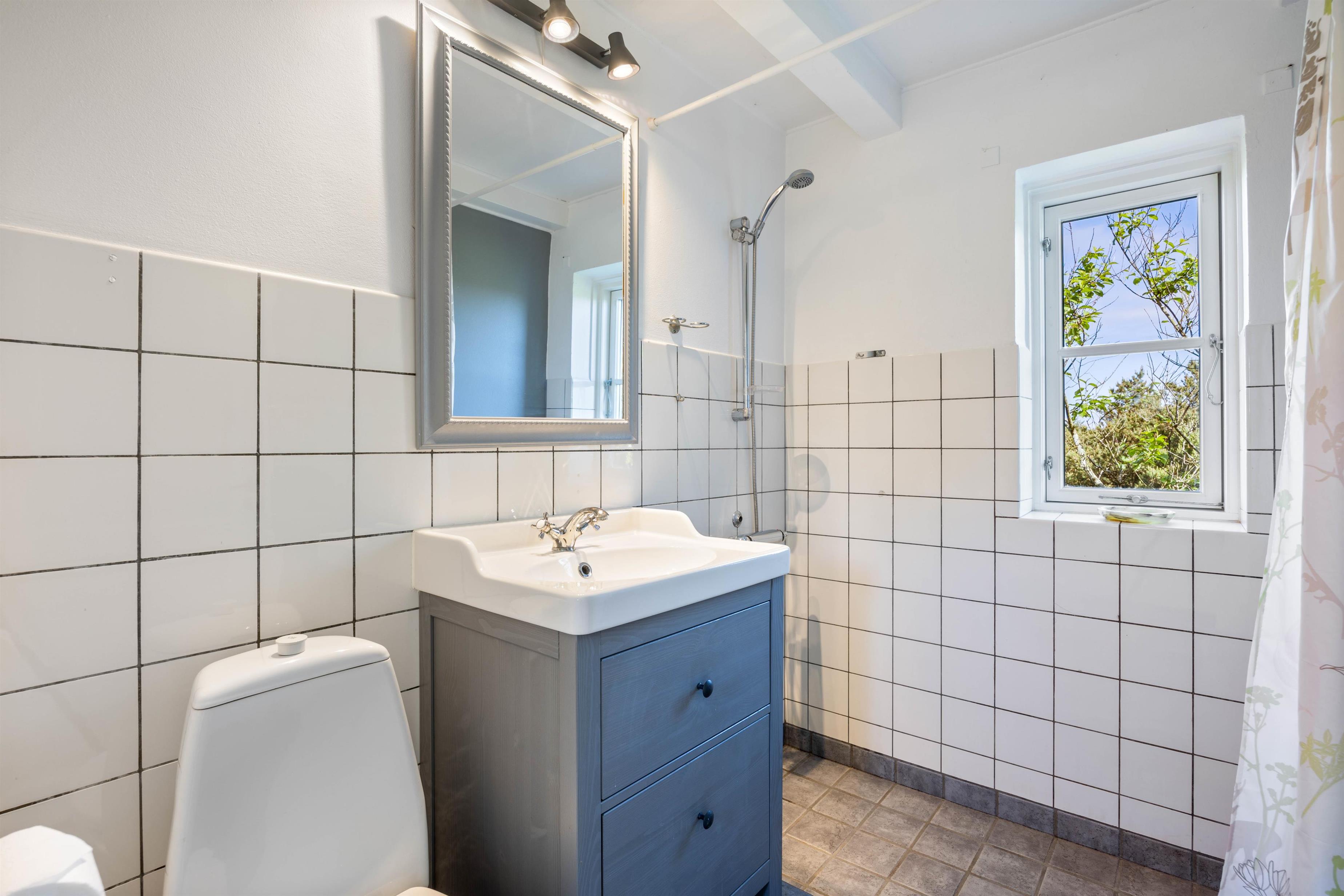 I stueplan ligger også sommerhusets badeværelse med gulvvarme samt et soveværelse indrettet med dobbeltseng. På 1. sal finder I de resterende sovepladser fordelt på 2 værelser med enkeltsenge. Vær opmærksom på, at der på 1. salen er lavt til loftet.